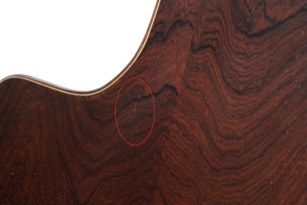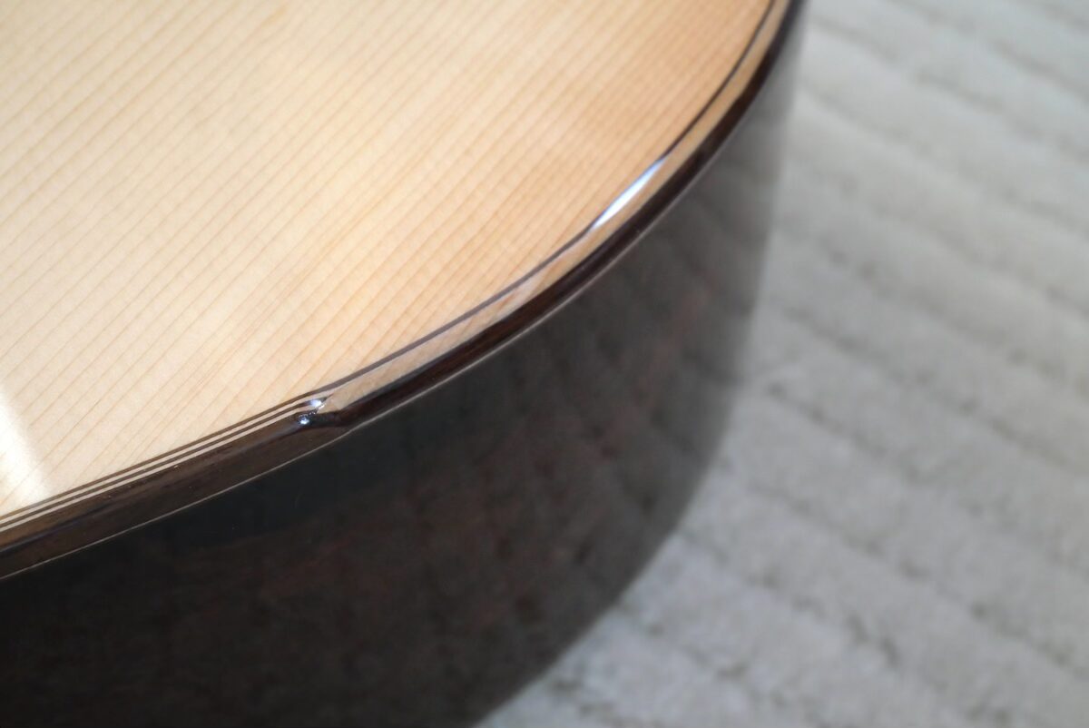 ボディバックカッタウェイ付近に割れが出そうでしたので、きれいに接着し、再塗装をしました。よく見ないとわからないような跡ではありますが、若干筋のようになっています。(画像にうまく写りませんでした。)