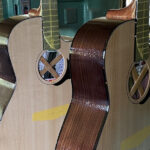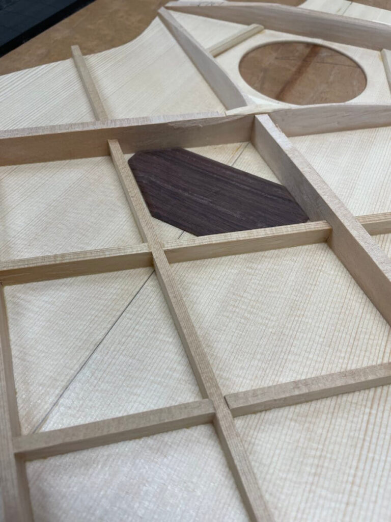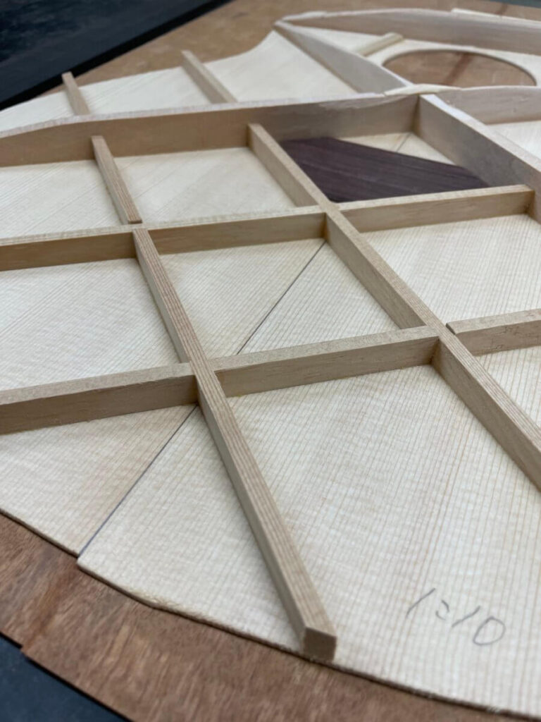 ブレーシング材は、現在シトカスプルースを使用しています。アディロンダックスプルースを使用している時期もありましたが、手に入る良材によって変更しているようですね。ブレーシングのスタイルはラティスブレーシングです。
