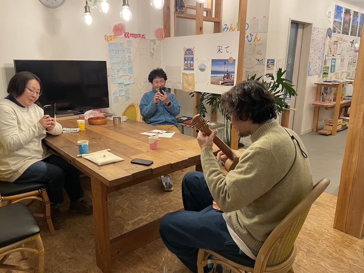 持参したウクレレに興味津々の青木さん。頑張って練習してみましょうね!
