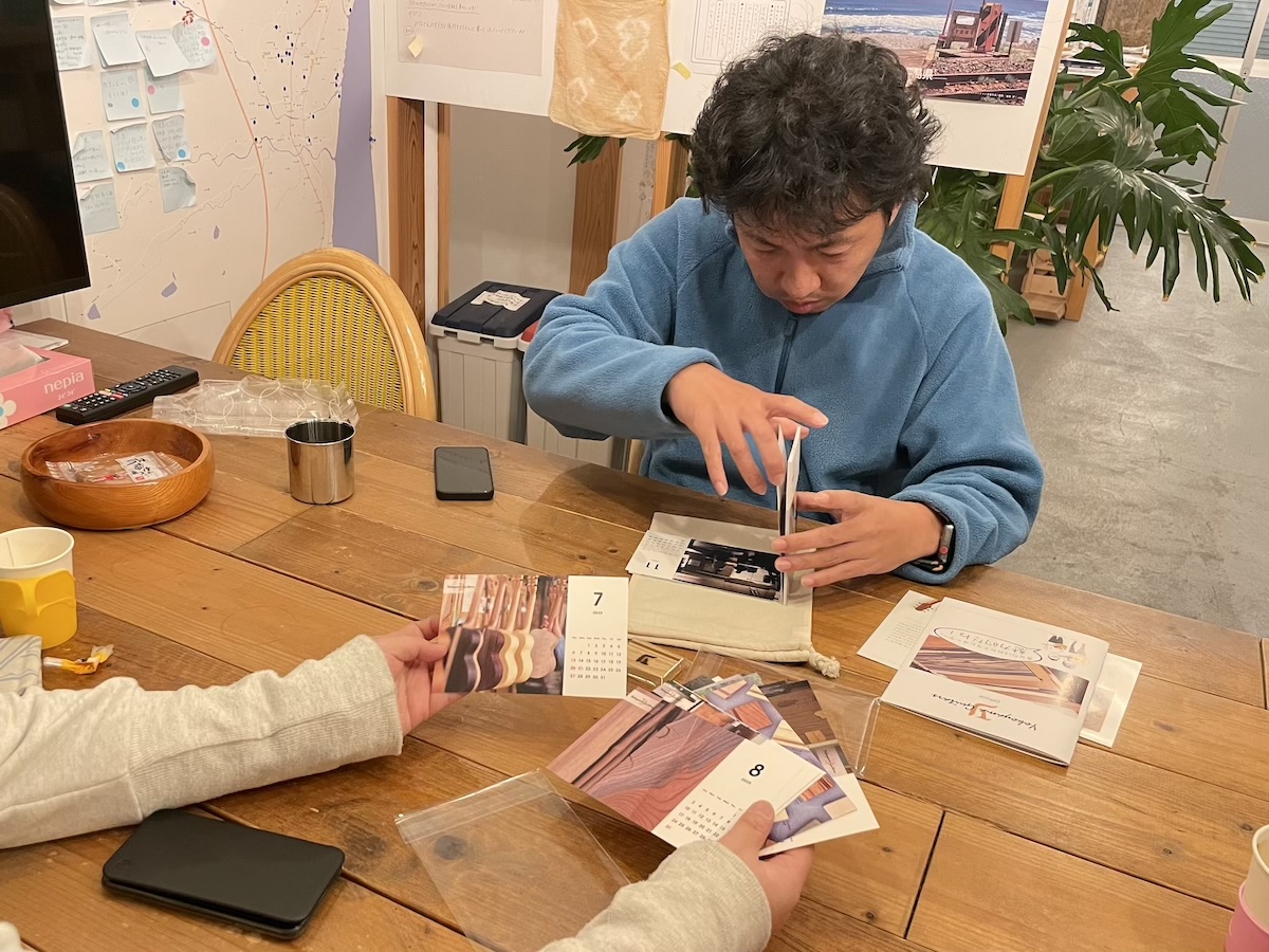八木さんに撮影していただいた、工房の写真を採用した来年のカレンダーをプレゼント。とてもお喜びいただけました。
