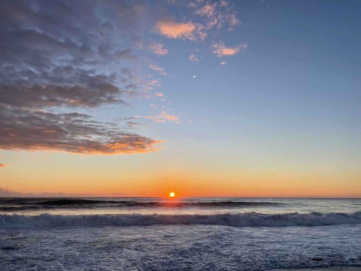 6時過ぎに朝日を撮影しに海岸へ向かうと、海岸に釣り人を発見。朝日とともに画になります。