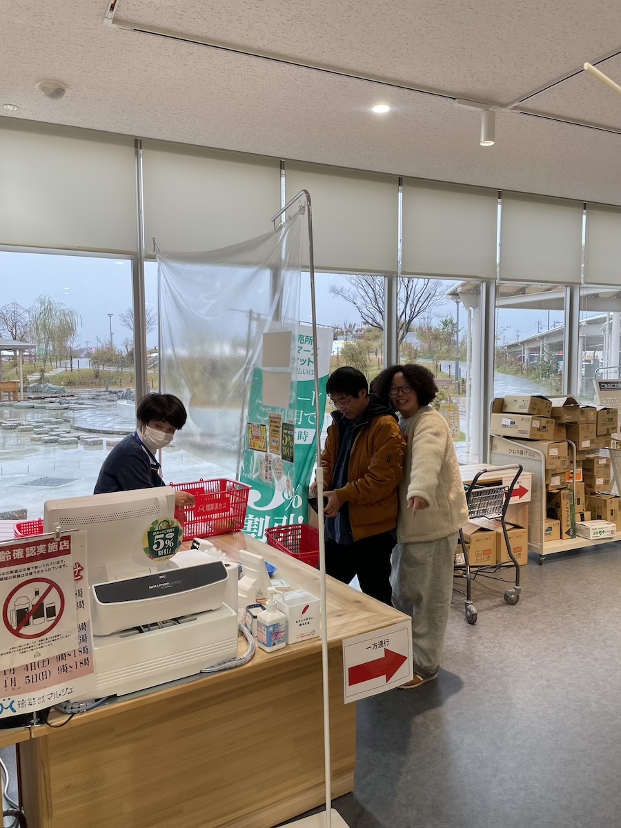 市街地に出ると、雪も雨へ。道の駅「KOKOくろべ」でのんびり地元の物産品を買い物します。なんとも楽しそうに買い物中のレアショットも掲載しておきます。