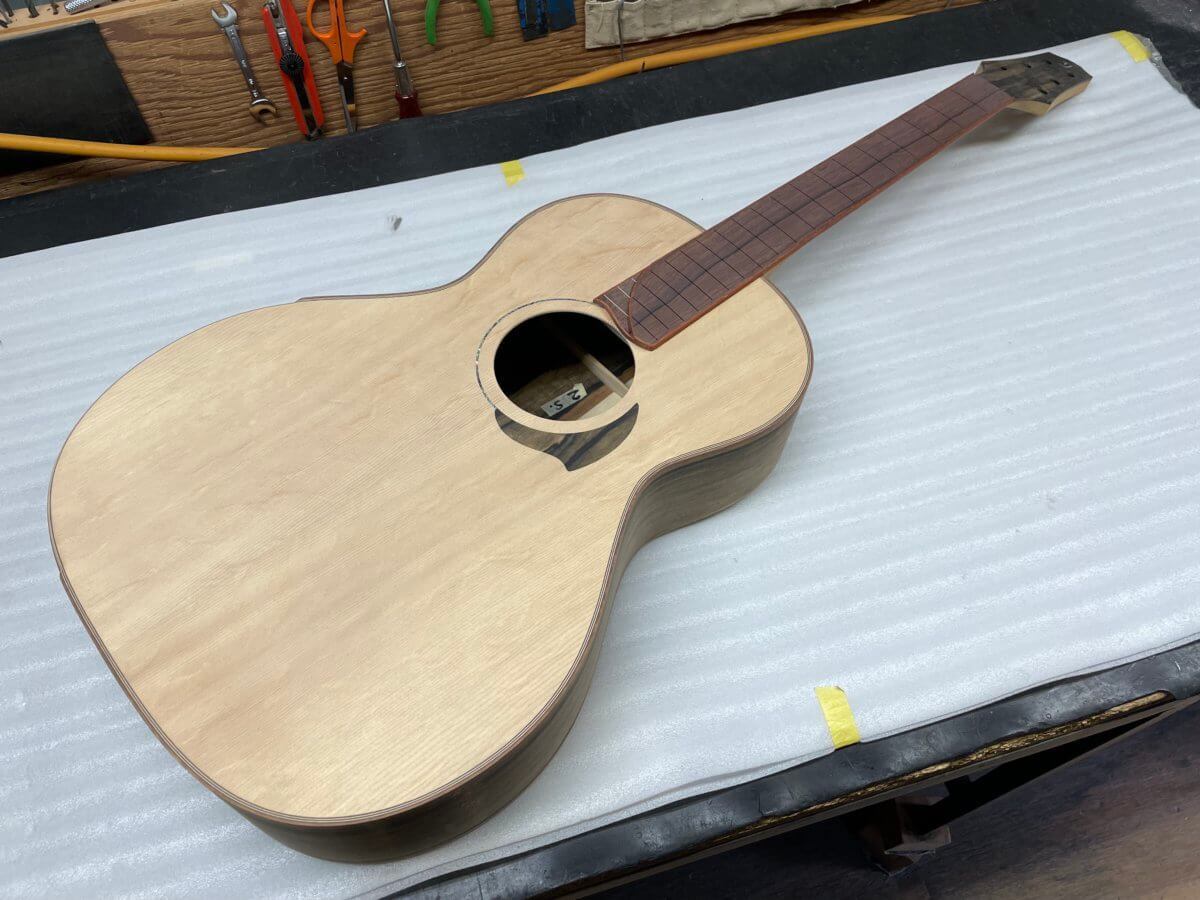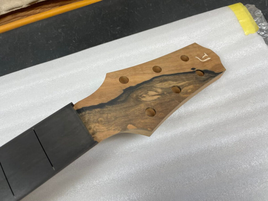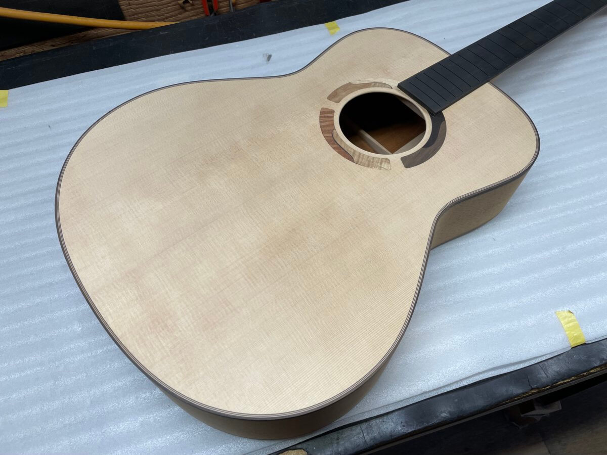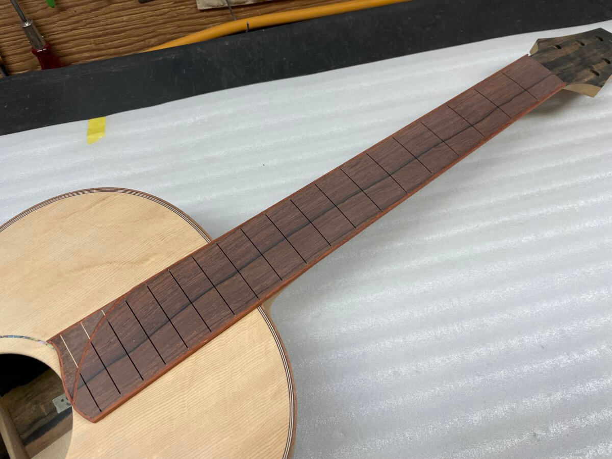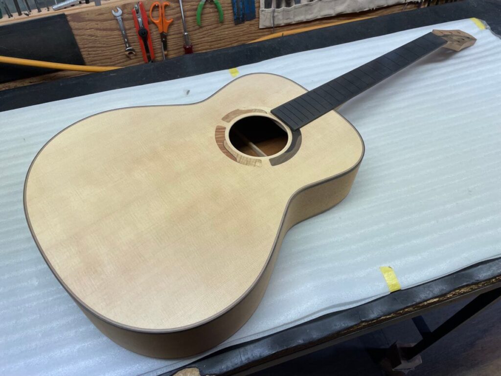 こちらも、まもなくフレット打ちの工程です。完成は年末頃でしょうか。今しばらくお待ちください。