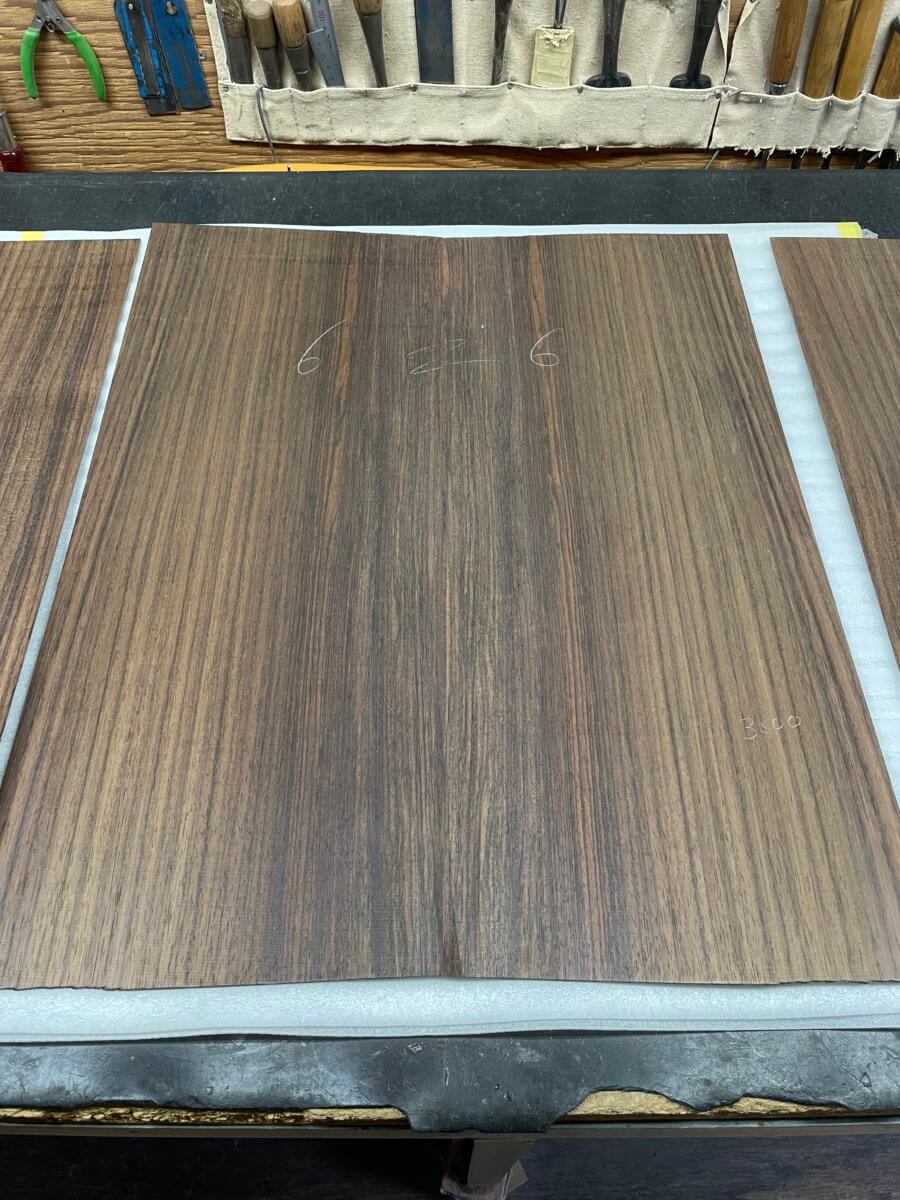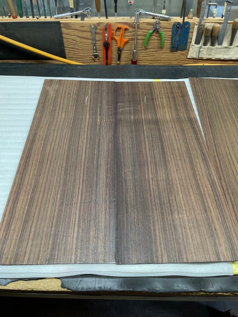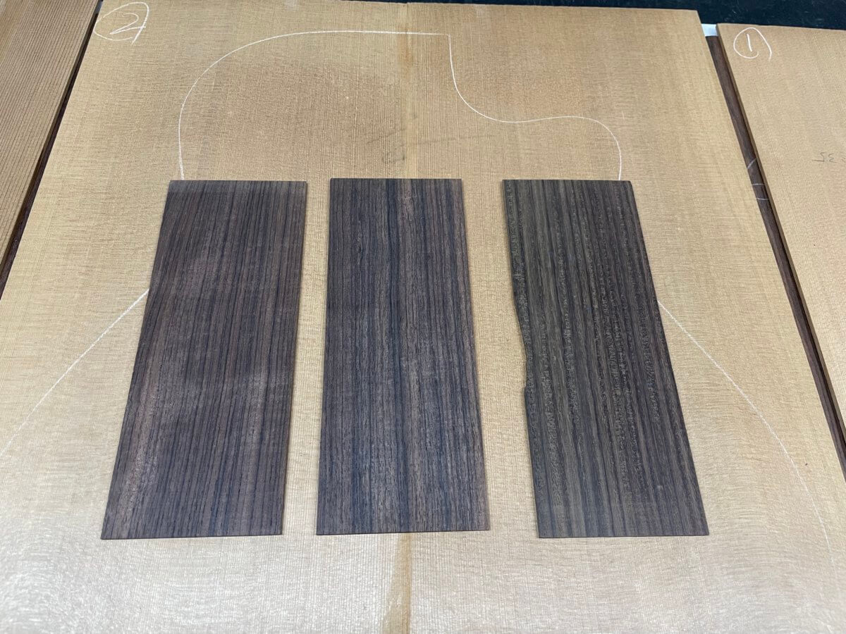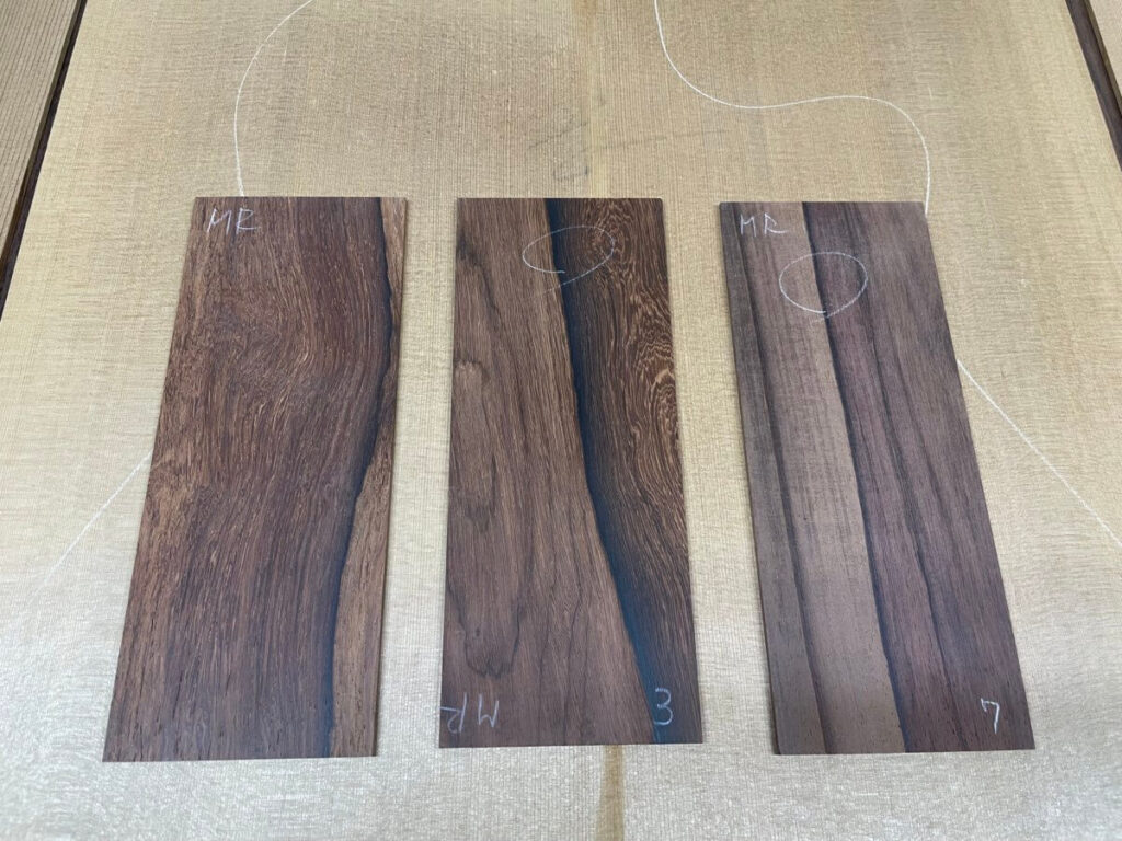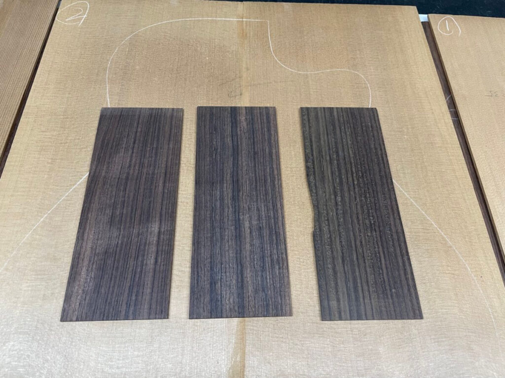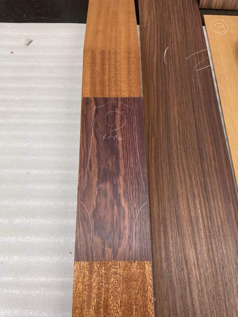 ヘッドトップの天神板は、ある程度ご希望をお伺いして、3種類の材料を撮影。カマティロ、マダガスカルローズウッド、インディアンローズウッドです。