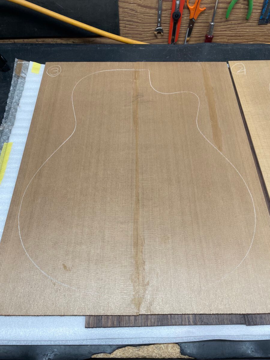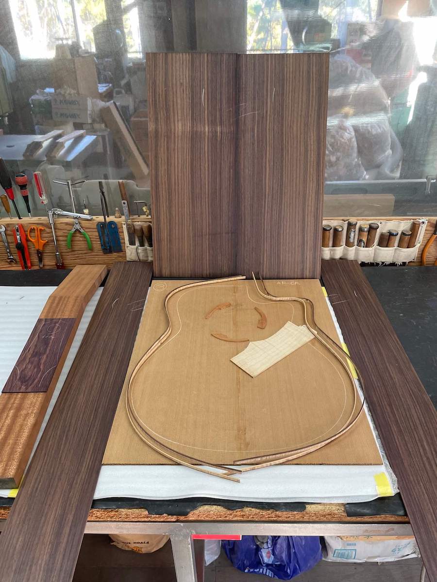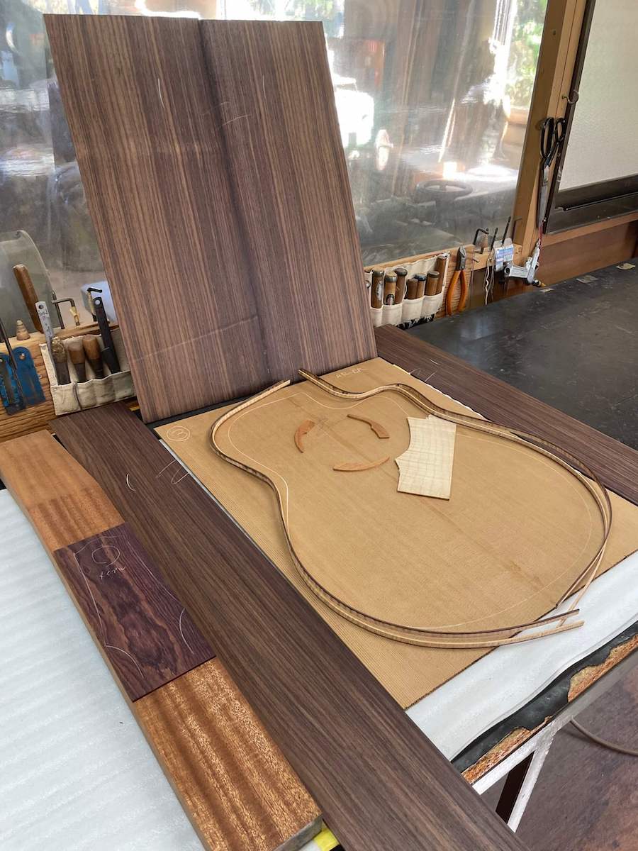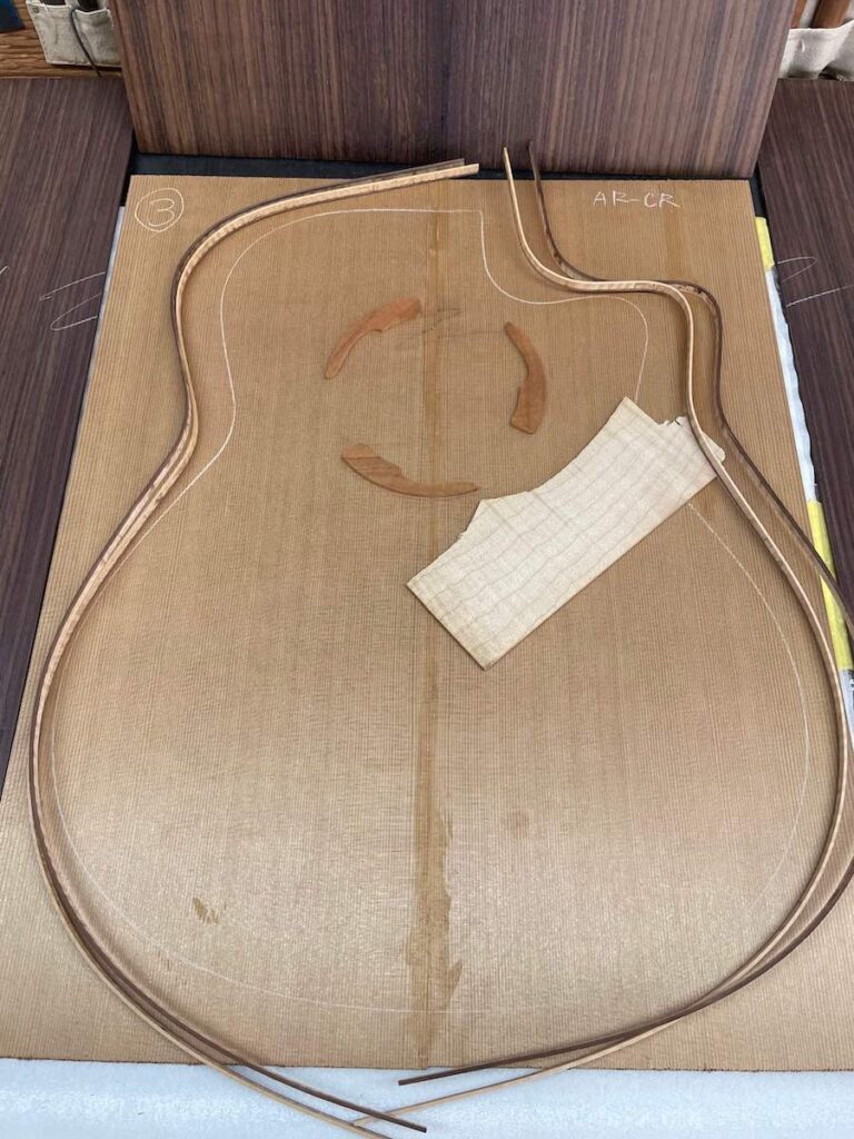 今回オーダーいただいたお客様からのリクエストは、まず「ARシェイプ」、「レッドシダートップ」という内容。バック&サイドは「インディアンローズウッドはいかがですか?」と、こちらからご提案の上、あとは「どうしましょう?」との事でした。