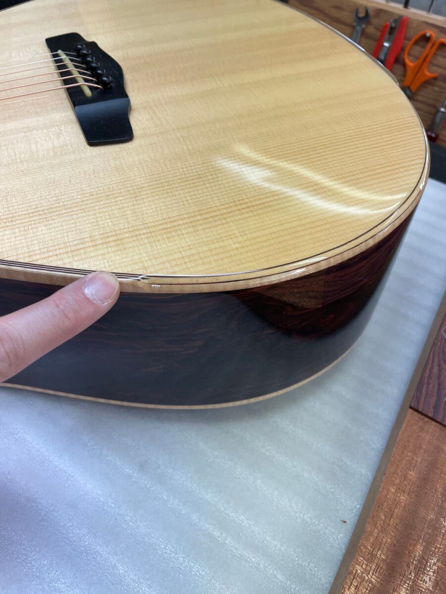 どうですか。この杢目のインパクト。ボディトップのベアクロウの入ったシトカスプルースに始まり、バック&サイドのエキゾチックエボニー、指板のマダガスカルローズウッドと、ワイルドな杢目のオンパレードです。
