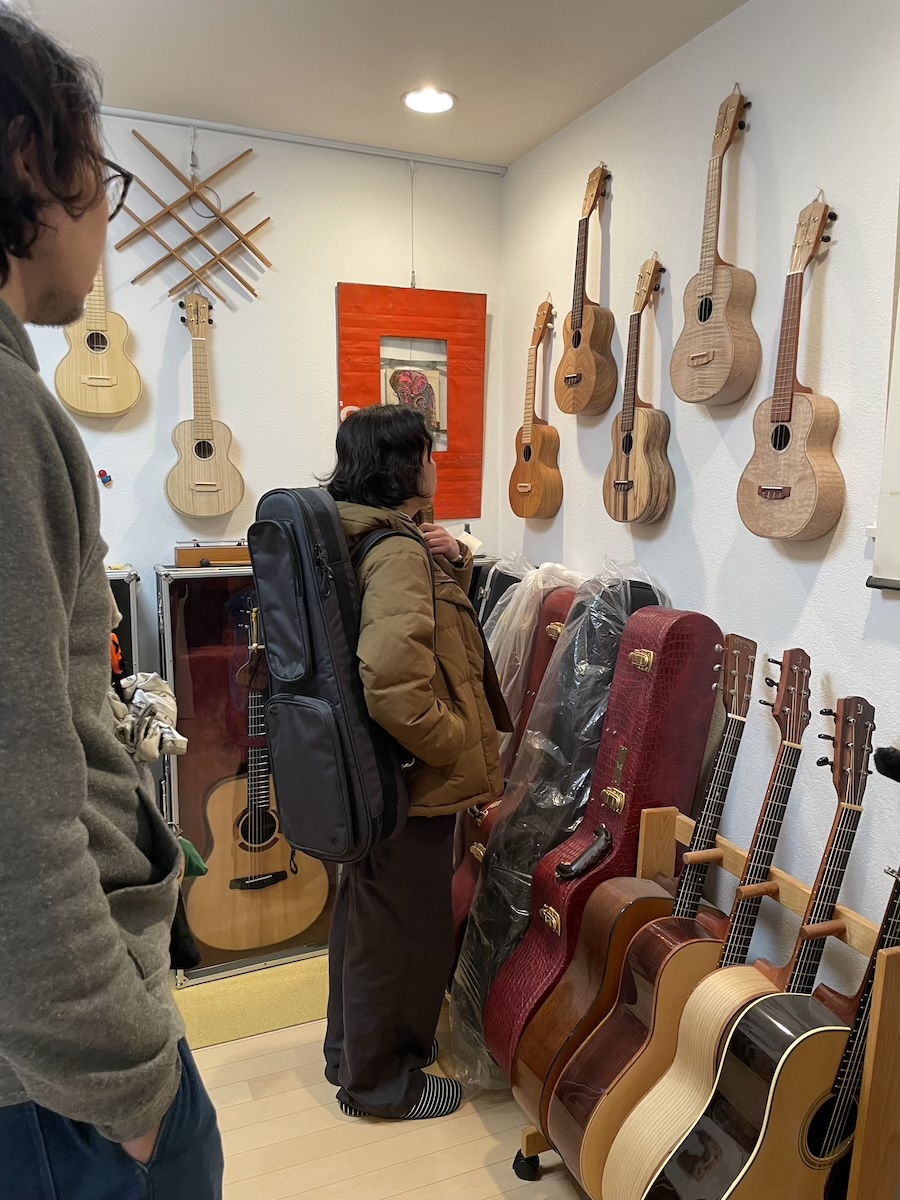 オフィスに到着すると、T様は様々なウクレレに興味津々。(年末に購入したばかりですよ!)
