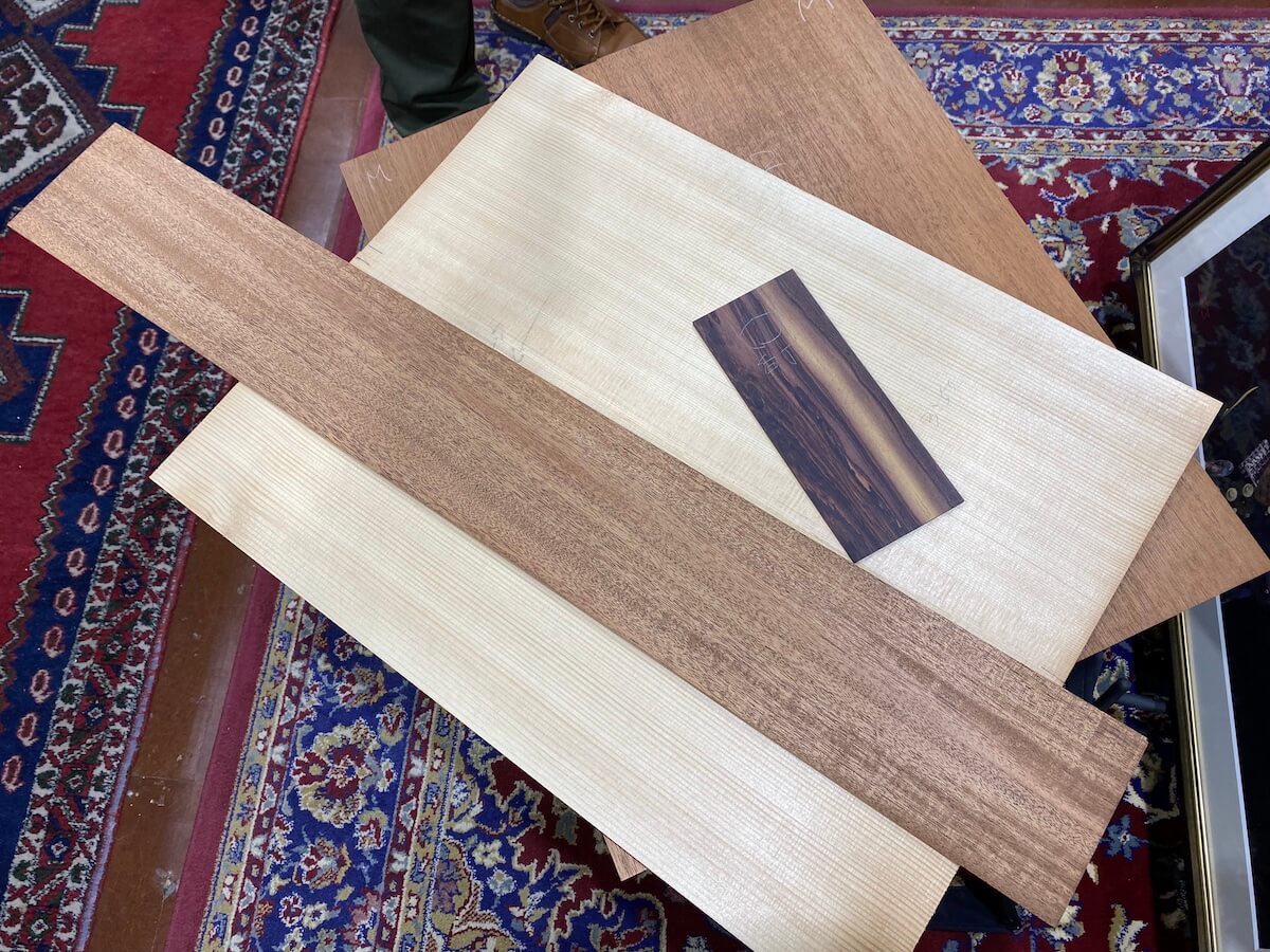 ホワイトスプルーストップ、マホガニーバック&サイドです。工房より移動した材料より、お好みの材料をチョイスしていただきました。