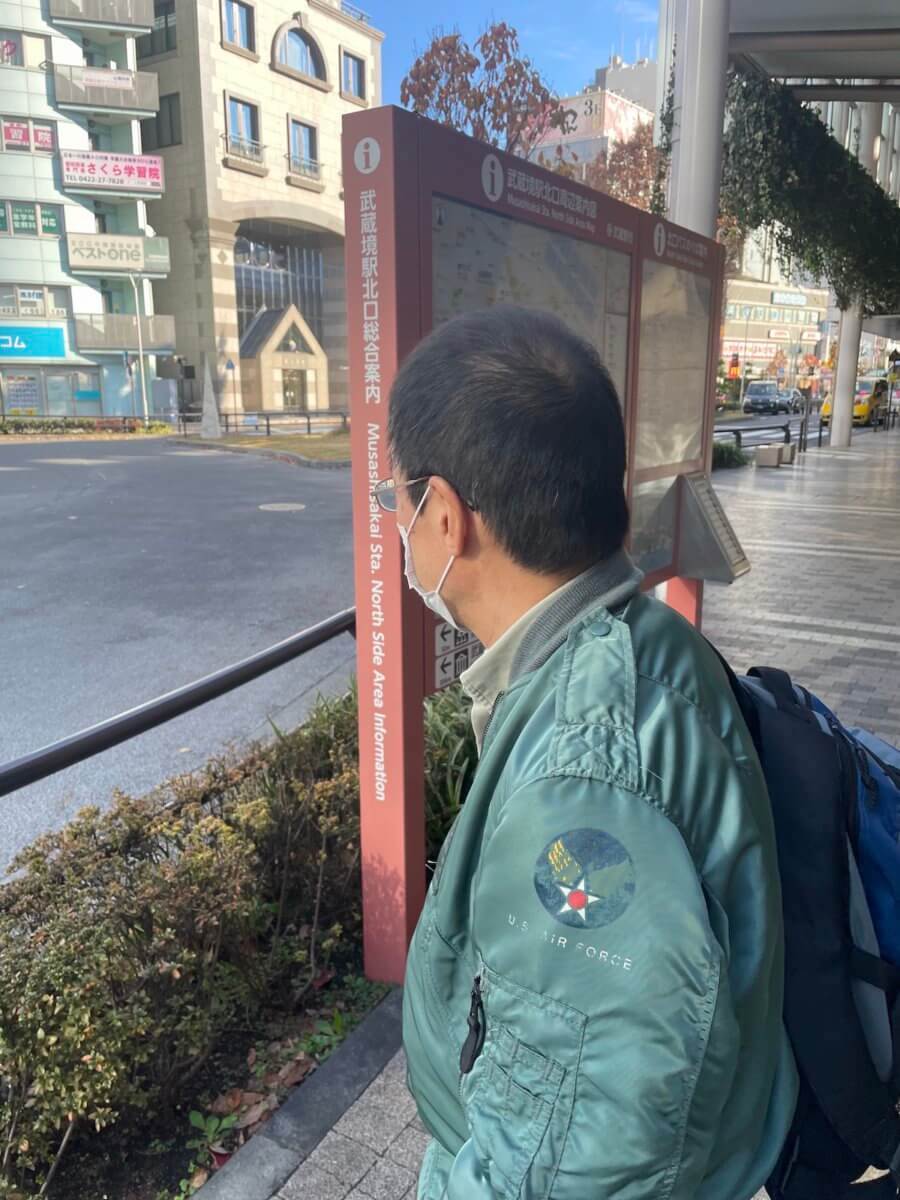 横山氏とは武蔵境駅で集合。朝、迎えを待っている後ろ姿です。久しぶりの都会を味わっていただけているのかしら?!