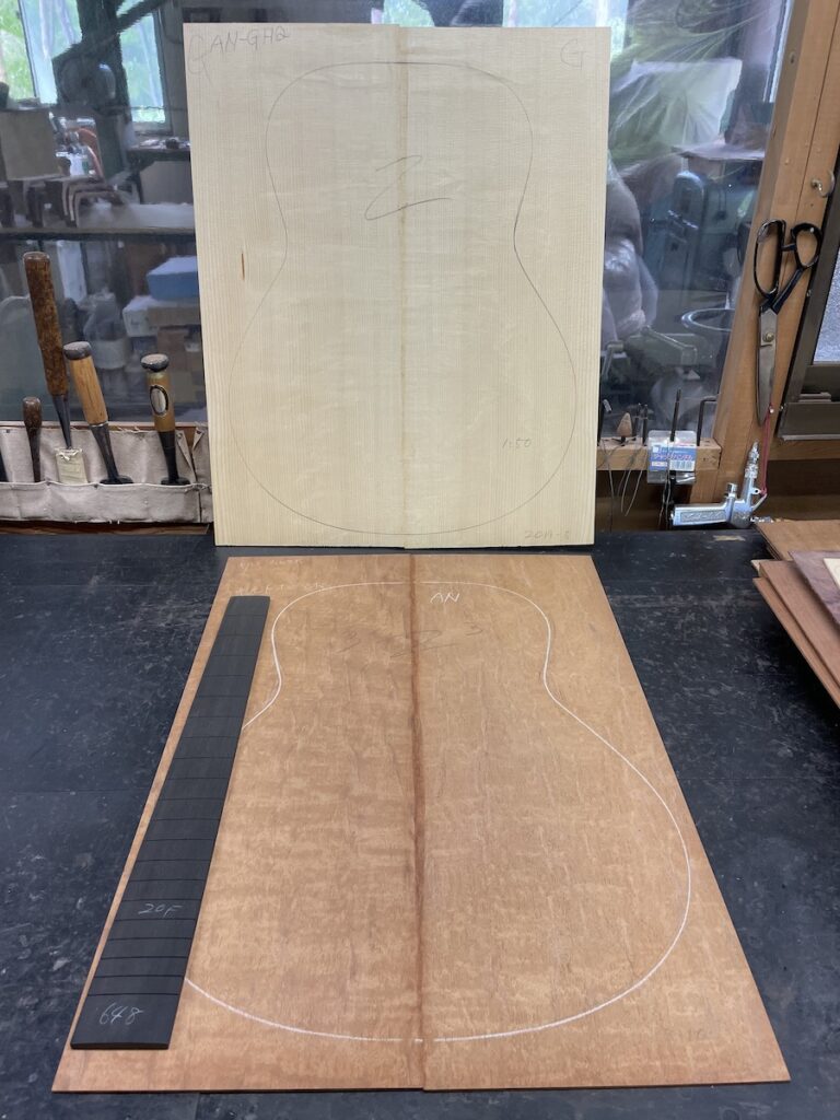 こちらのモデルも、トップ材にはベアクロウの入ったジャーマンスプルースを採用。今まで圧倒的に人気のあった組み合わせです。ヘッド天神にはサップ(白い部分)の入ったカマティロ材を合わせます。