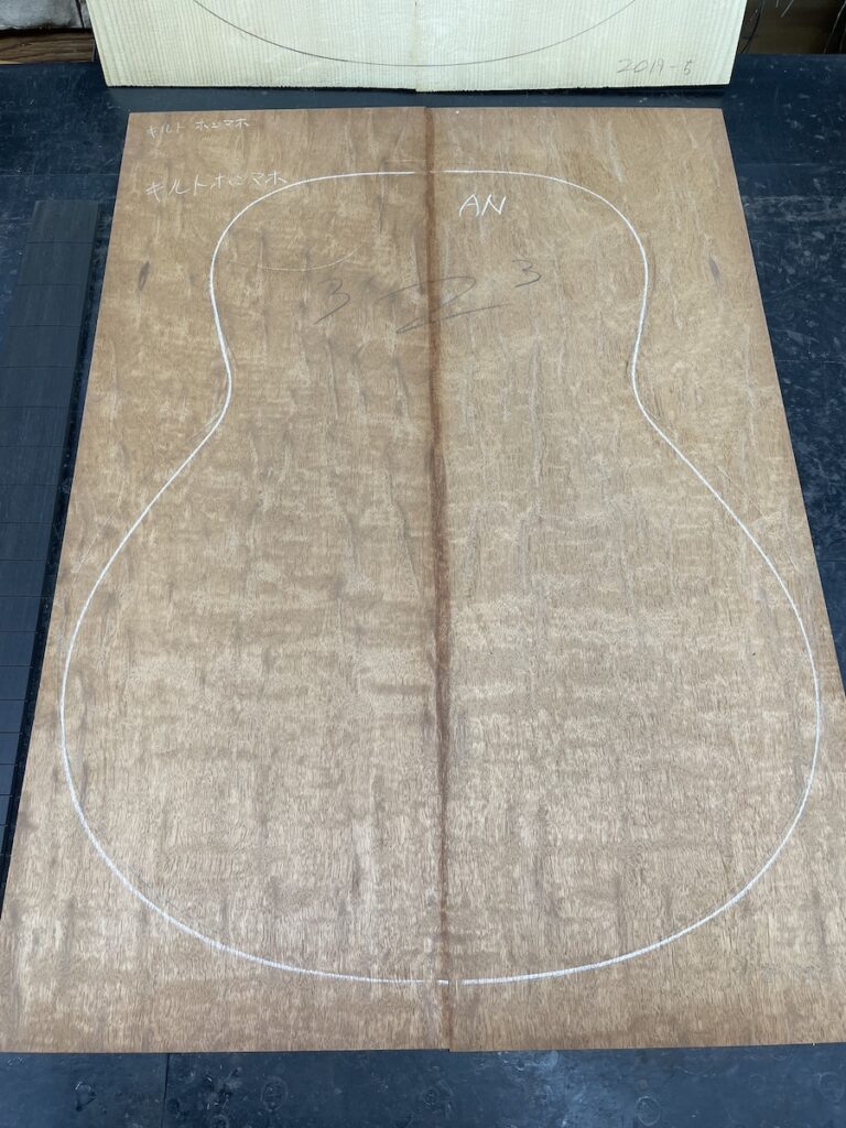 キルト杢のホンジュラスマホガニーは、海外ではもはやブラジリアンローズウッドより入手困難とも言われており、とても高値で取引されています。国内で流通している材料を見ても、稀に杢のあるマホガニーは目にしますが、ホンジュラスとなると話は別です。