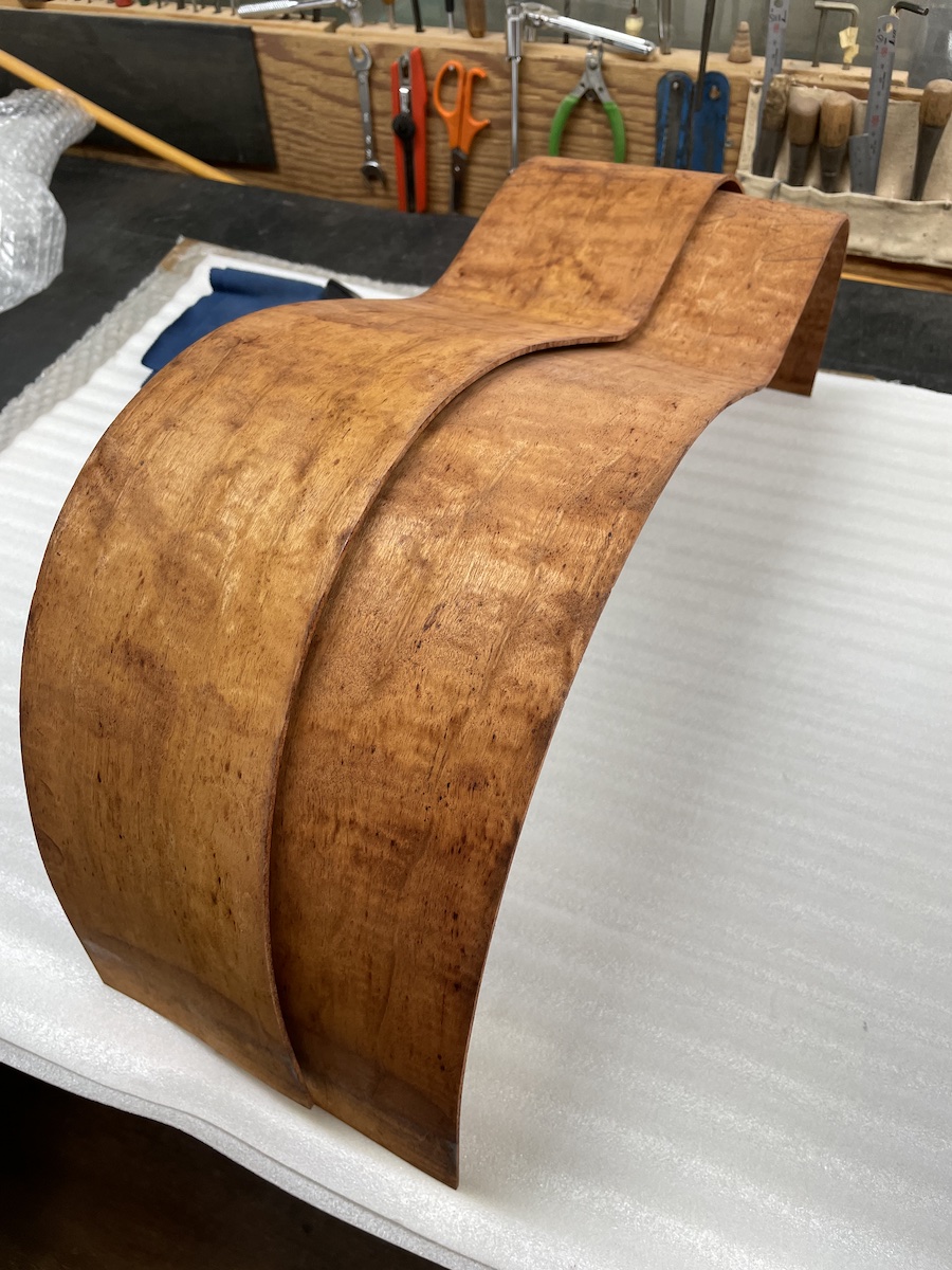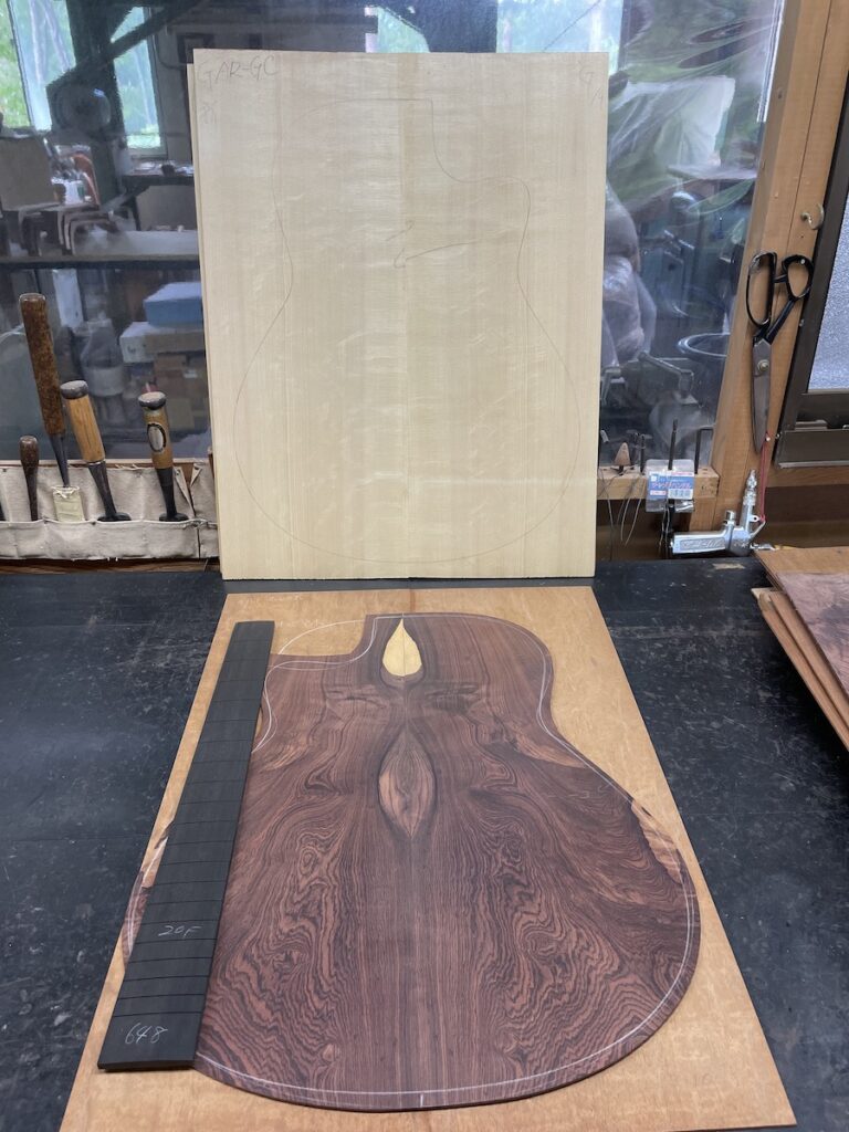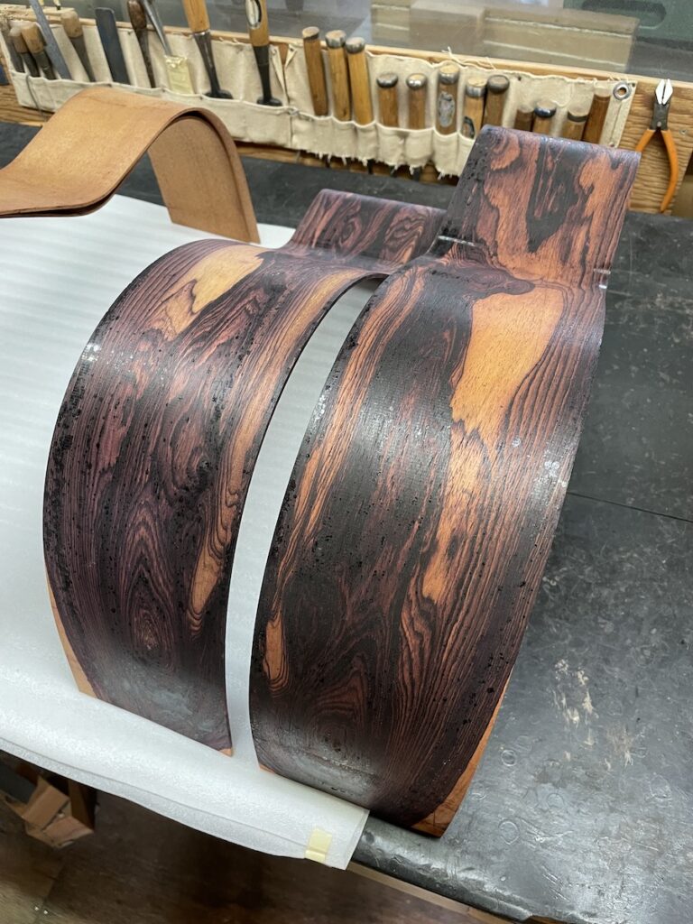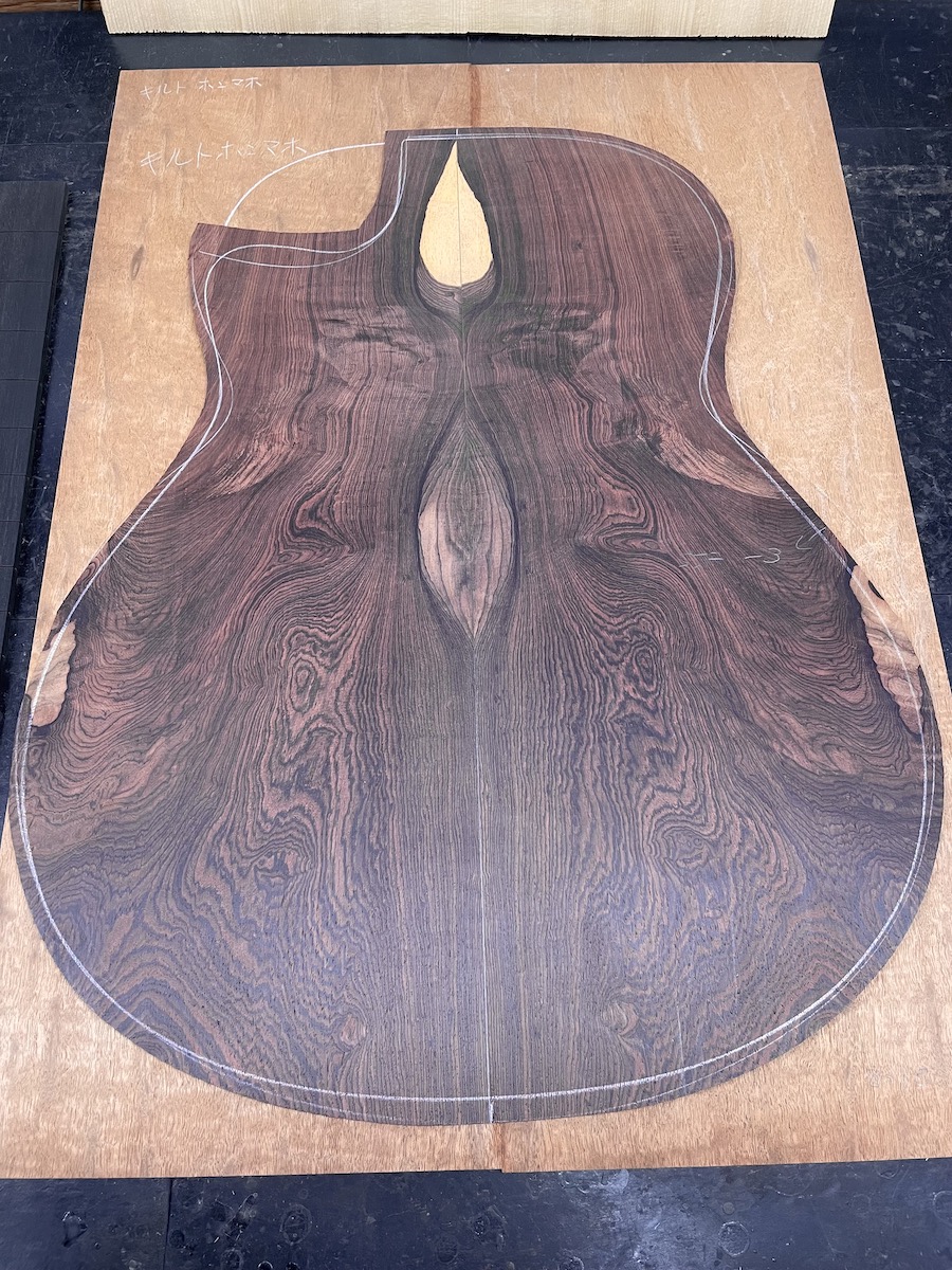 記念すべき1000本目と対になるように、1001本目も同時に製作開始。こちらは「Yokoyama Guitars」らしさを持った材料という事で、外すことのできないカマティロ材で製作することとなりました。バック材は2ピースのカマティロを採用します。しかもインパクト大の杢です。