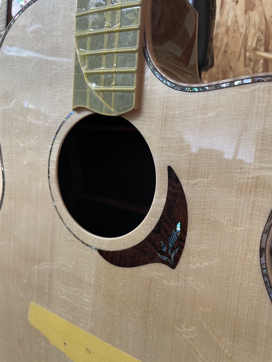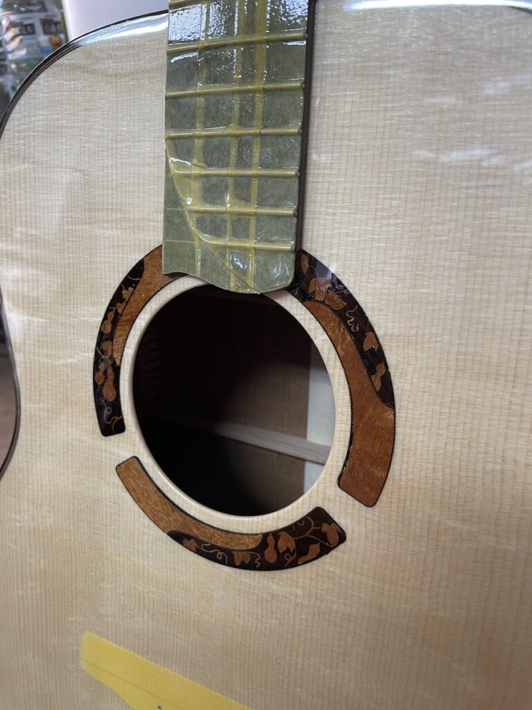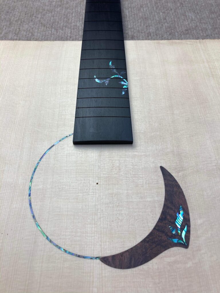やはり記念モデルとなると、新潟県十日町市に工房を構える「OGAWA INLAY CRAFT」小川さんに相談です。横山氏とも相談し、シンプルながら、記念モデルらしいインレイを入れたいという事になりました。