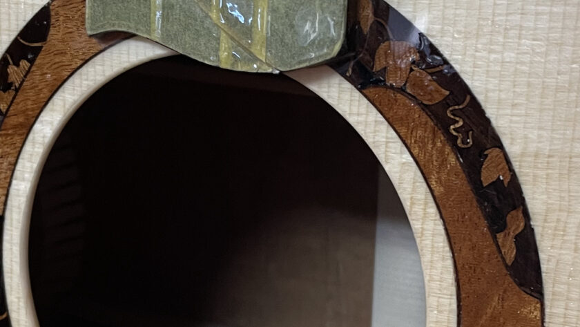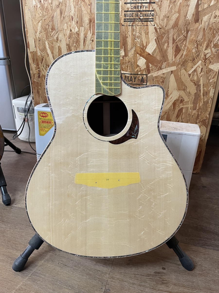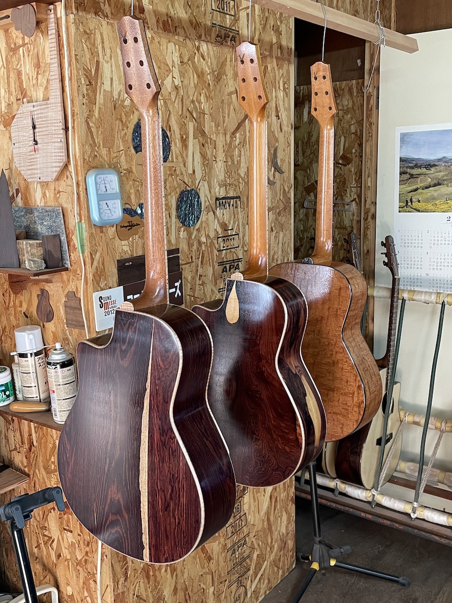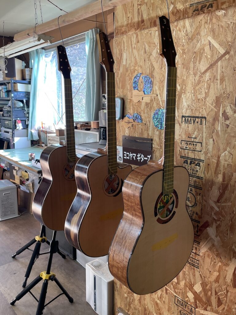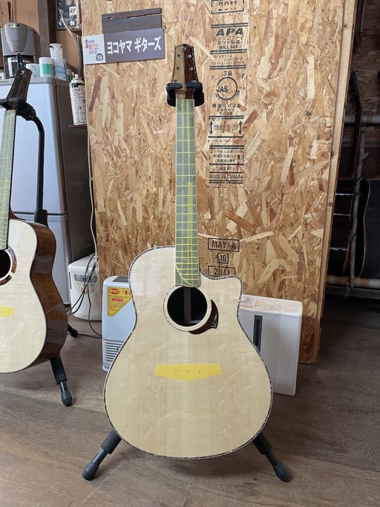 インレイが完成すると、徐々にギターの形へと組み上げられていきます。現在では塗装工程も横山氏の手により行われています。