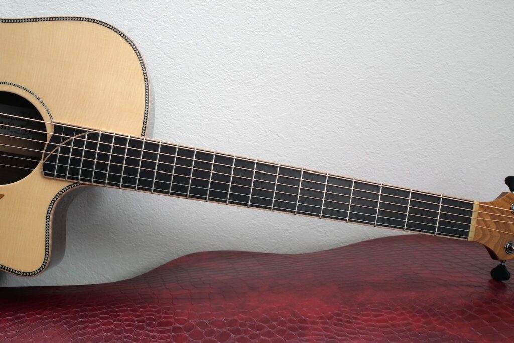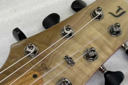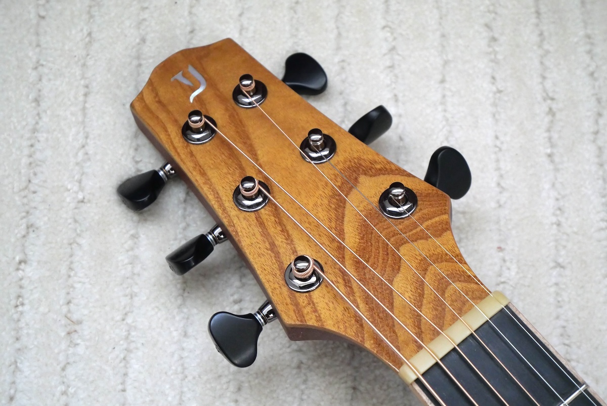 指板&ブリッジ駒にはエボニー、バインディングにはメイプル、ヘッドトップ&ロゼッタには桑材を採用しています。