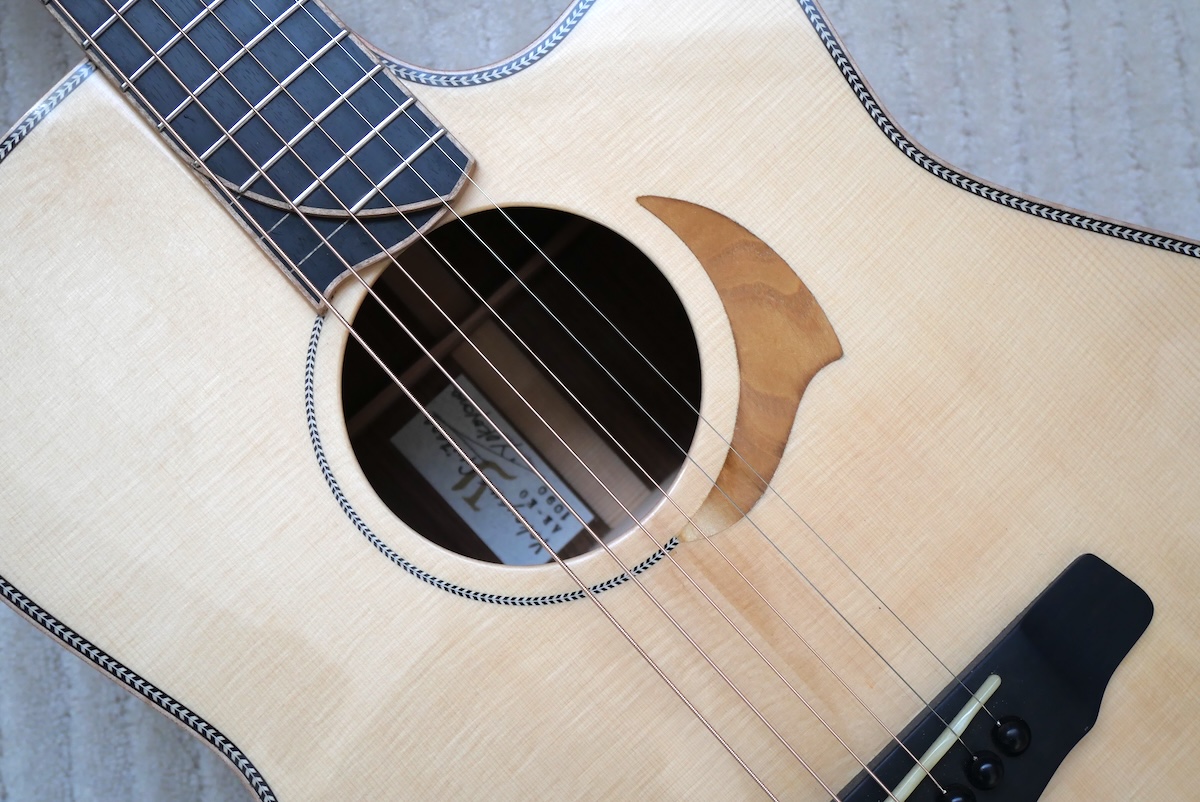 トップのイングルマンスプルースは、工房立ち上げ当初よりストックしていた材で、寝かせていた事もあり、素晴らしいトーンです。