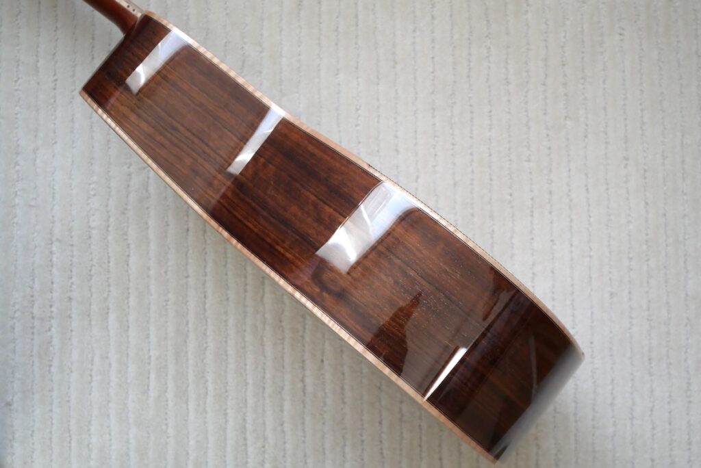 硬さや材料の雰囲気はインディアンローズウッドに似ていますが、少しローがすっきりとした印象で、もたらずに、とても弾きやすいトーンが印象的です。材料の杢目や色味もとても魅力的です。