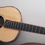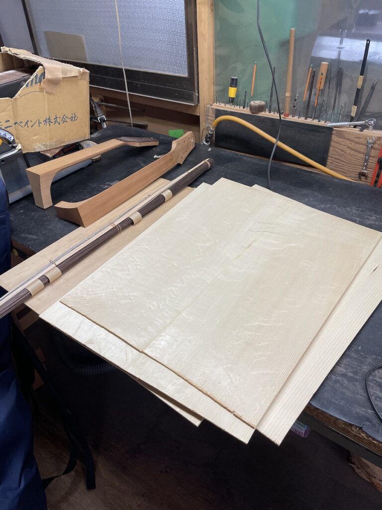 材料自体、とても稀少ですが、肝心なのはそのサウンドです。見た目では重厚そうですが、とても軽やかで、独特の甘さを持った素晴らしいサウンドです。マホガニーともひと味違ったライトさは、とても魅力的です。トップには、しっかりと芯のあるサウンドになるよう「ジャーマンスプルース」を選定しました。ベアクロウもびっしりと入っており、とてもきれいな材料です。