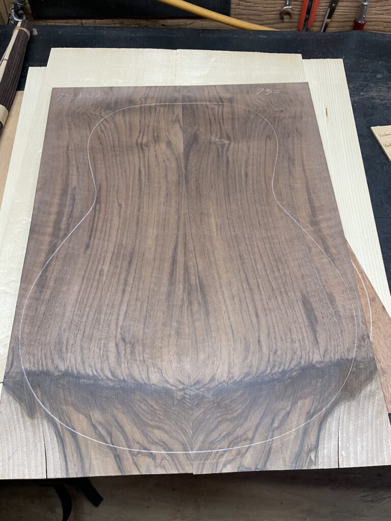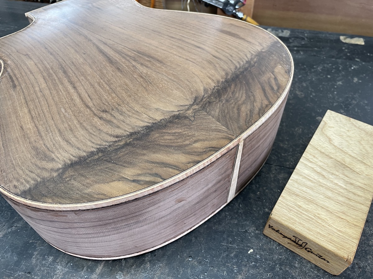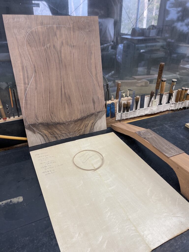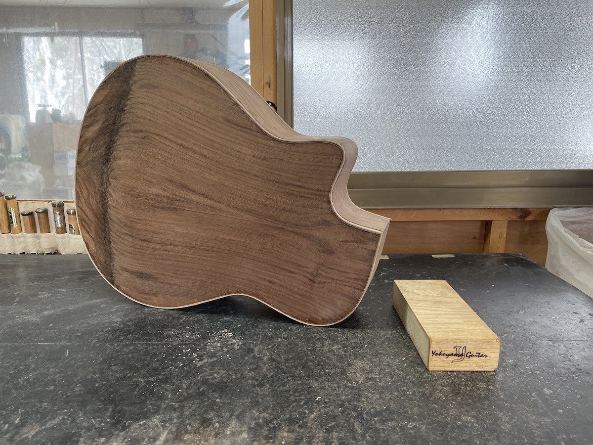 「スペシャル仕様」に、と言うことで、バック&サイドは工房に長らくストックしていた「クラロウォルナット」を使用していただきました。