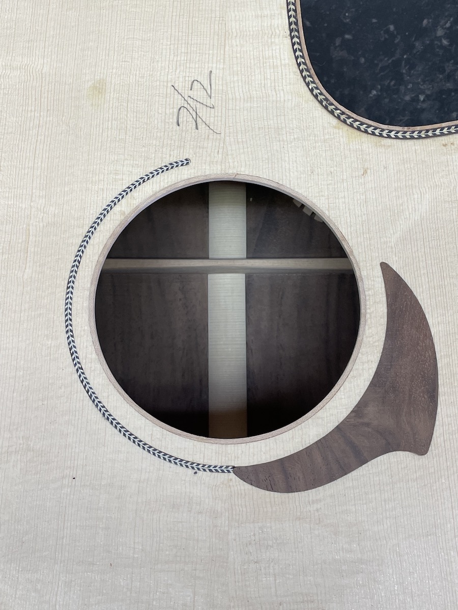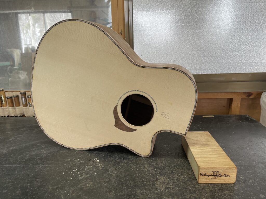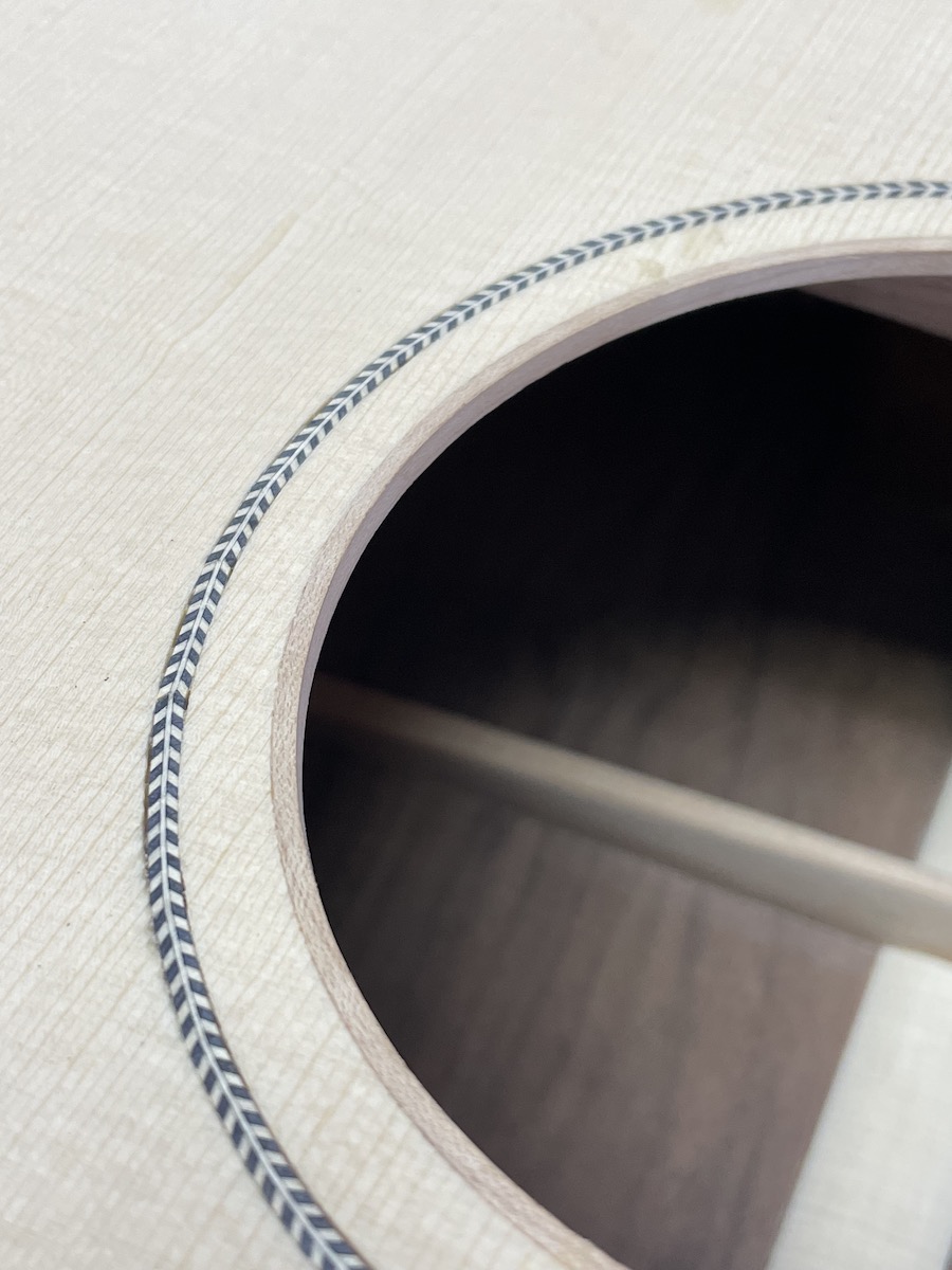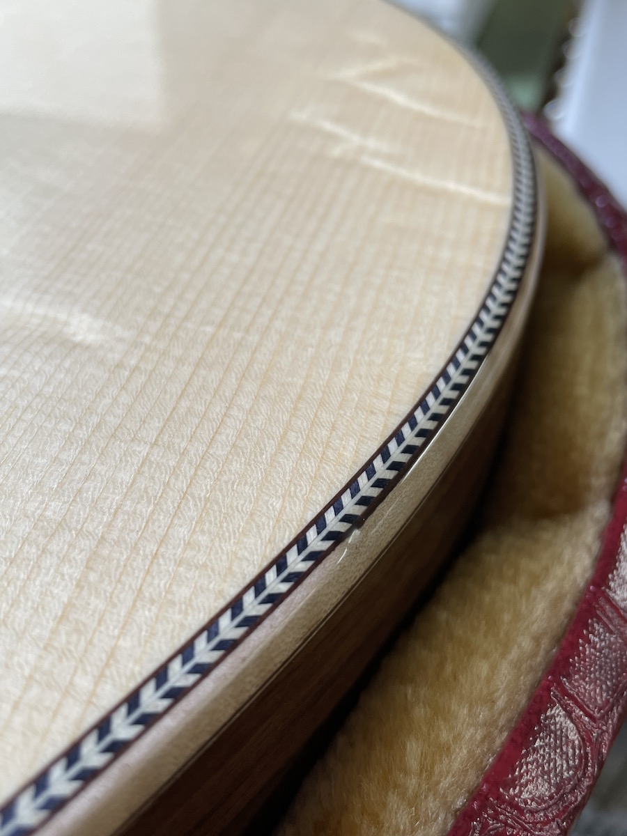 このサウンドホールインナーですが、以前ほんの一時期採用しましたが、とても手間がかかる為、最近ではオーダーでもお受けしていなかった仕様です。ヘリンボーンのトリムもとても新鮮で、素敵な仕上がりです。