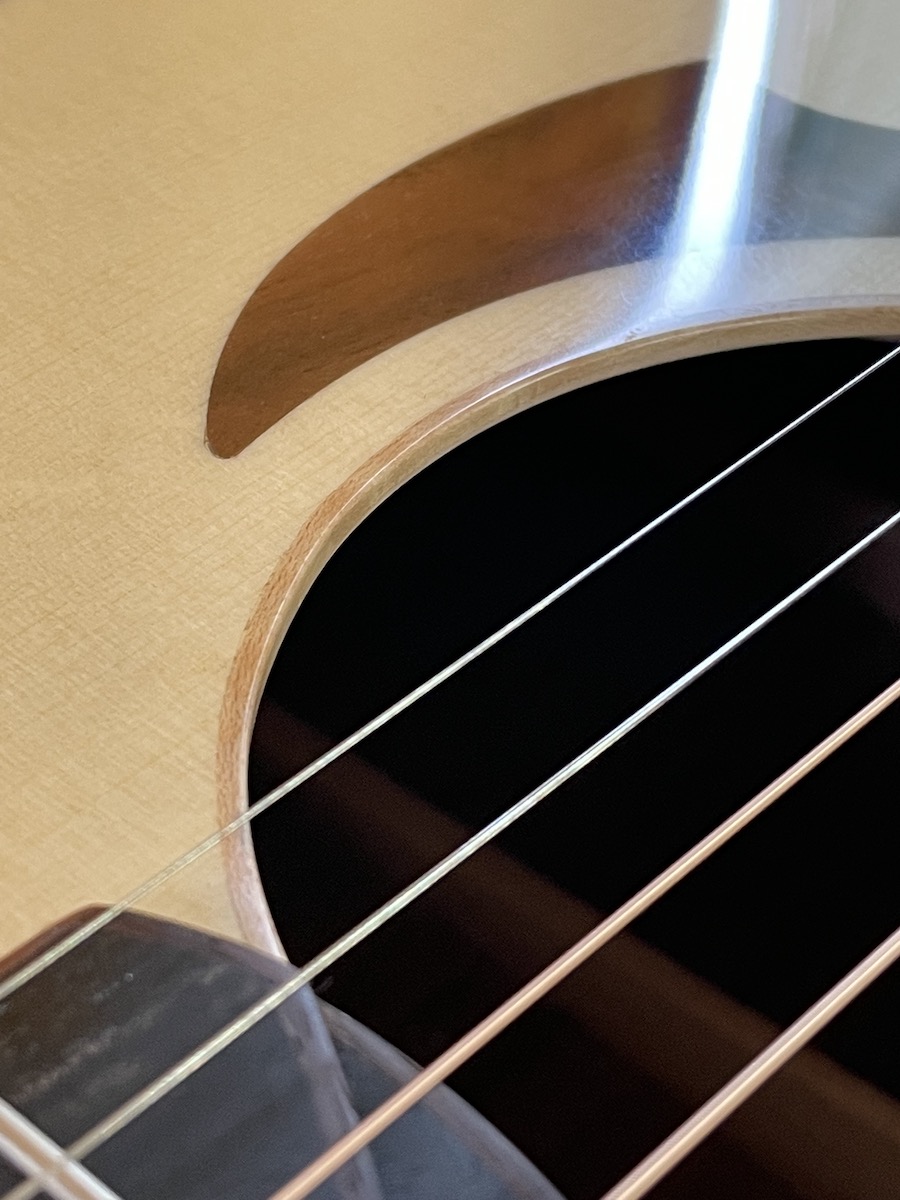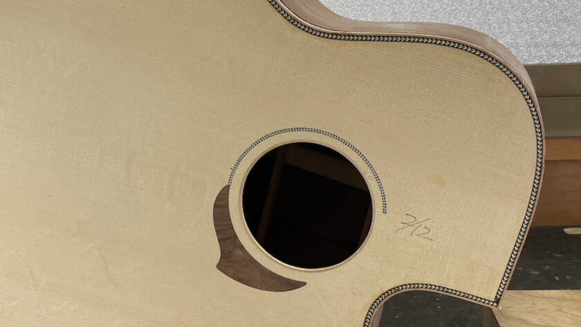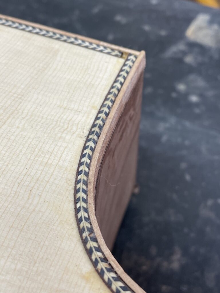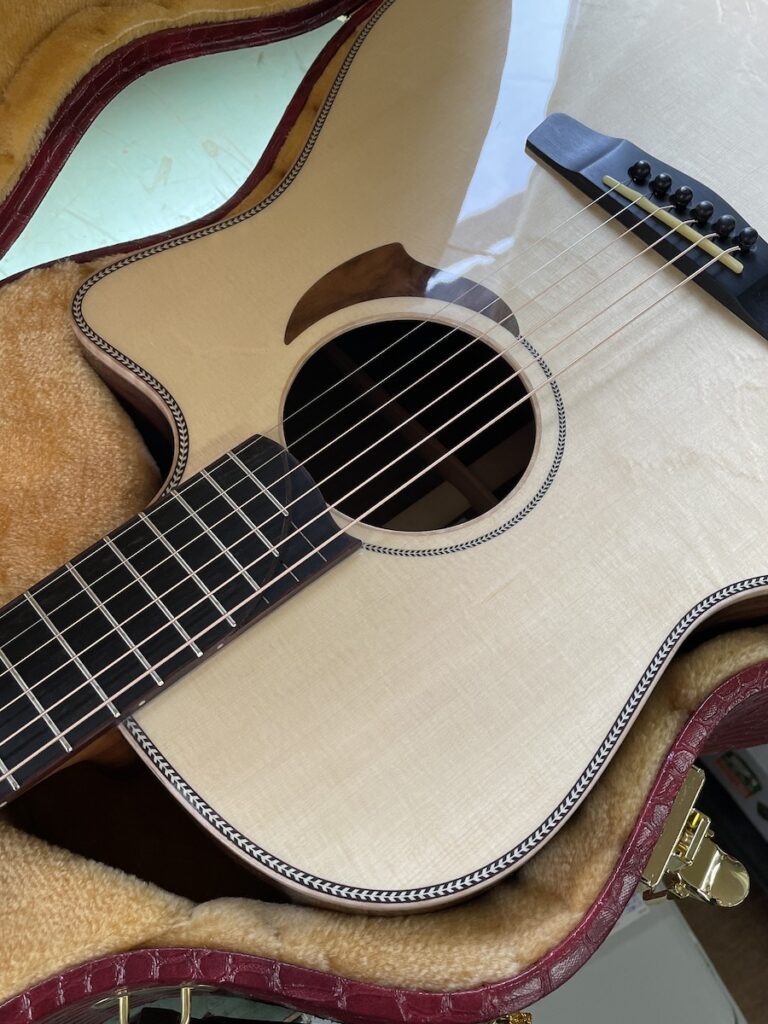 このサウンドホールインナーですが、以前ほんの一時期採用しましたが、とても手間がかかる為、最近ではオーダーでもお受けしていなかった仕様です。ヘリンボーンのトリムもとても新鮮で、素敵な仕上がりです。
