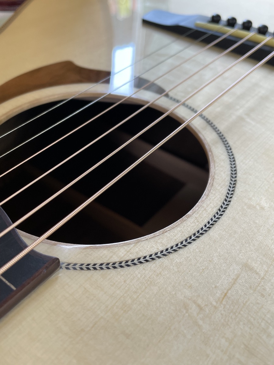 外周のトリムと、サウンドホールロゼッタラインにはヘリンボーンを巻いてもらいました。また、サウンドホールの内側にはメイプルインナーを施してあり、通常のモデルとはひと味も、ふた味も異なった美しい仕上がりです。