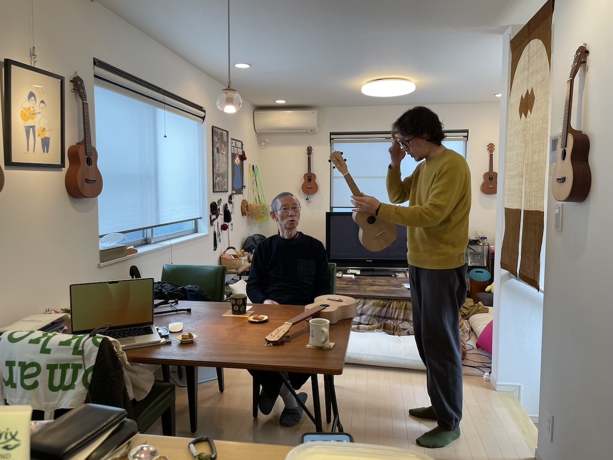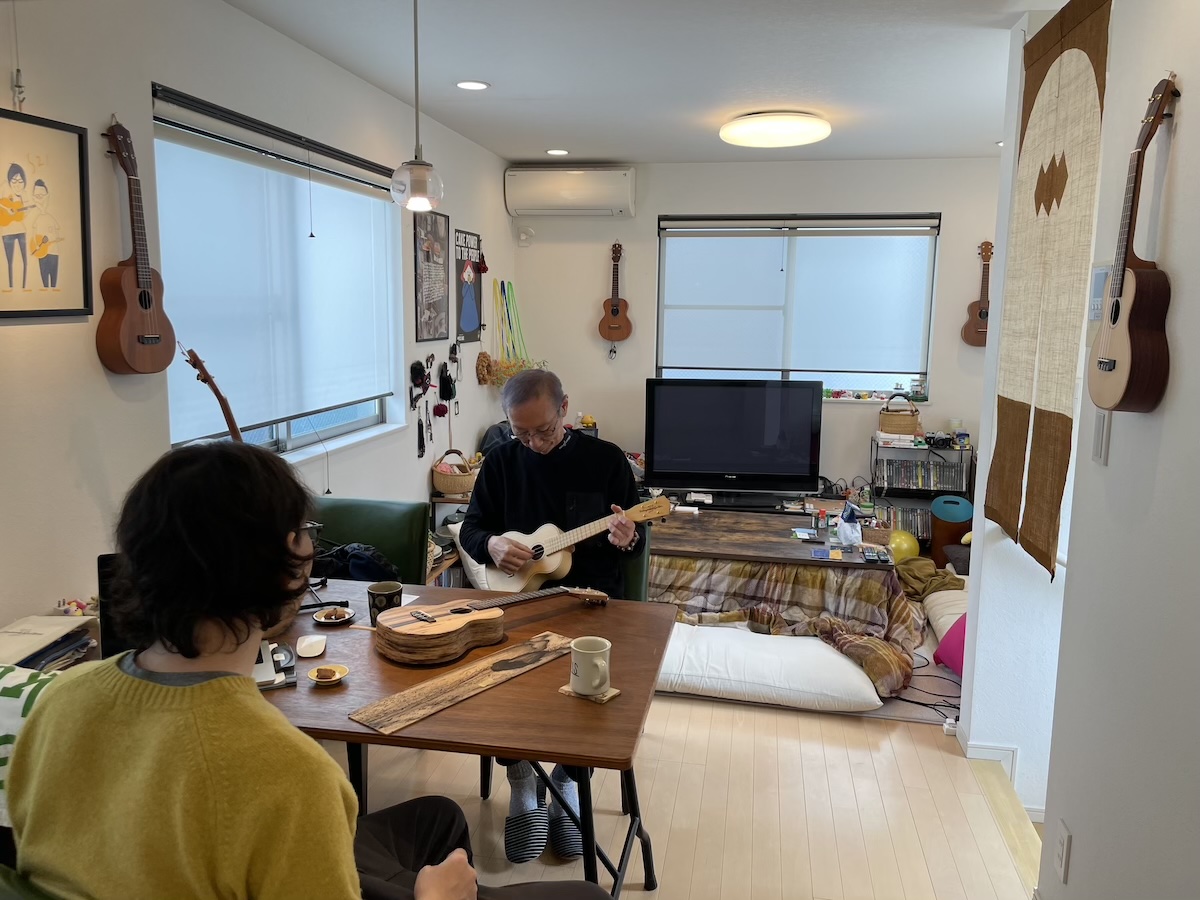 TOKYO OFFICEに、ウクレレをご覧にお越しいただいたのは、埼玉県Y様。ホンジュラスマホガニーモデルを試奏ご希望です。