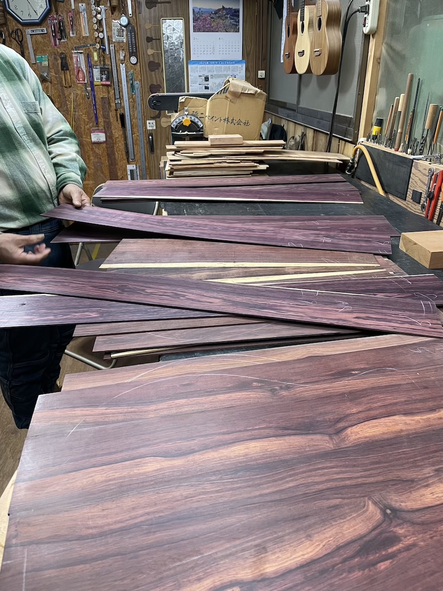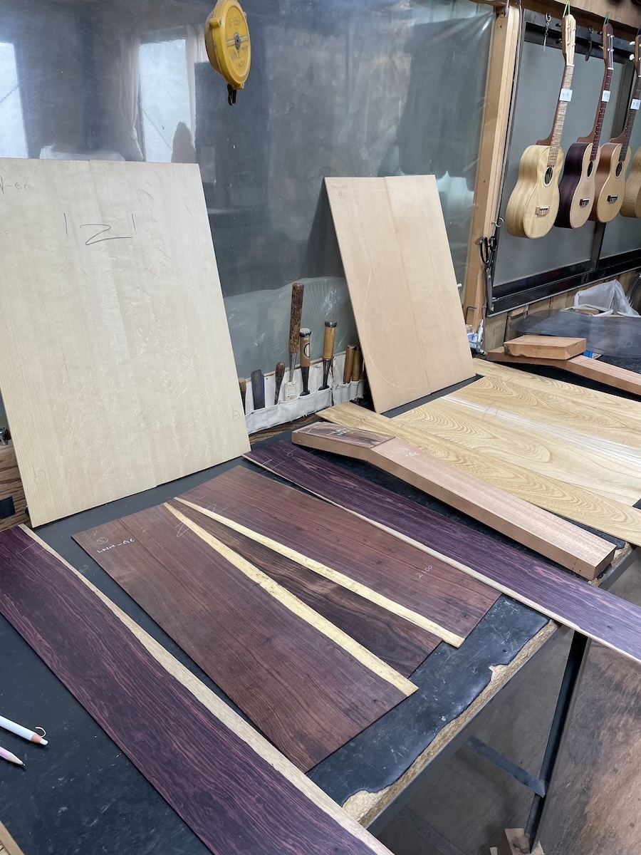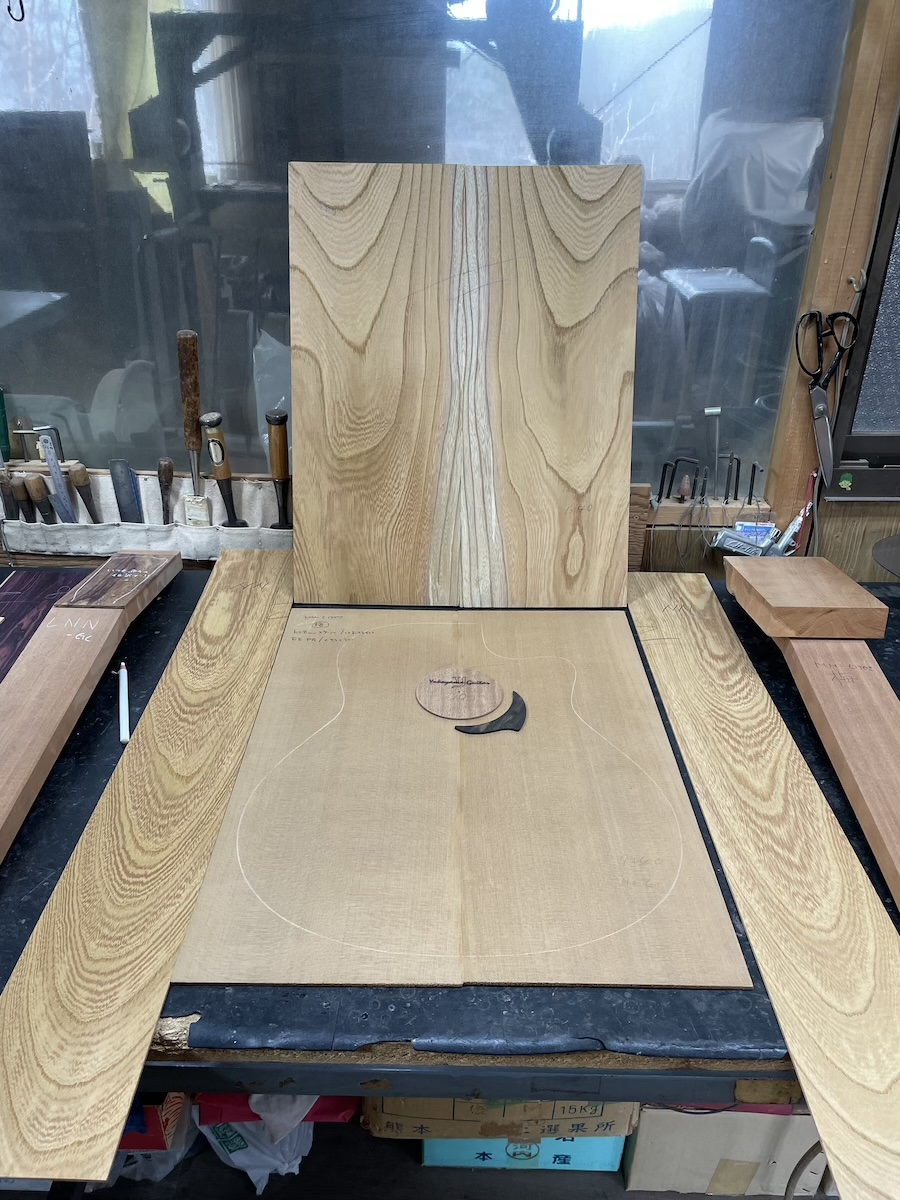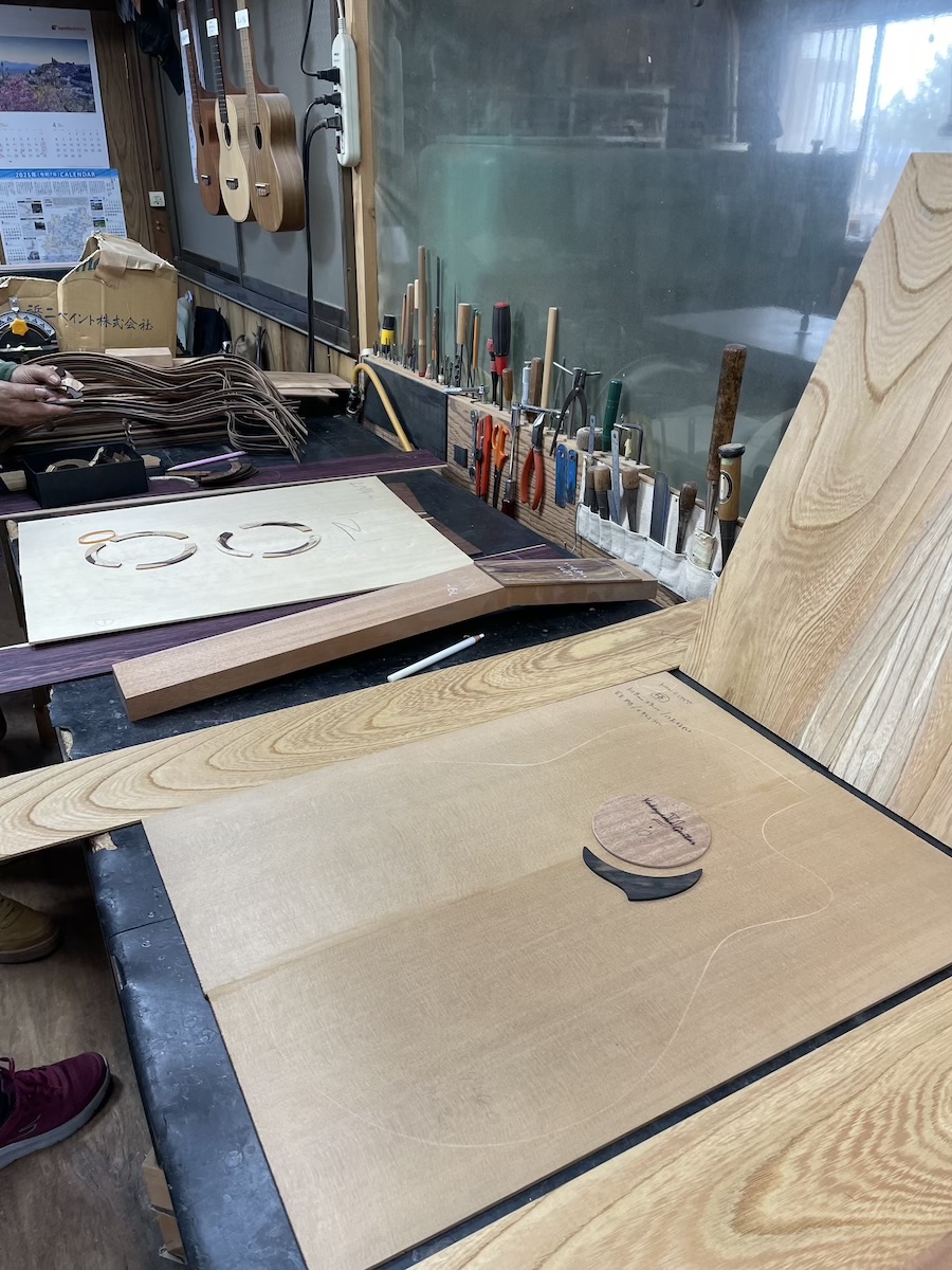 ご来場いただいたH様は、ご夫婦でギターを演奏されるとの事。とても羨ましいです。西条温泉 とくらで昼食を済ませ工房へ。早速、まずはボディシェイプとメイン材料の選定です。