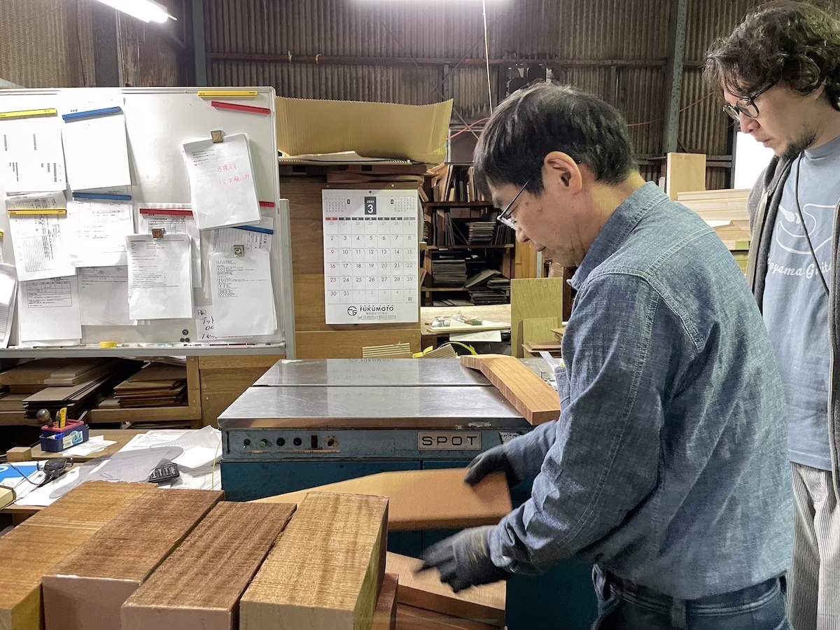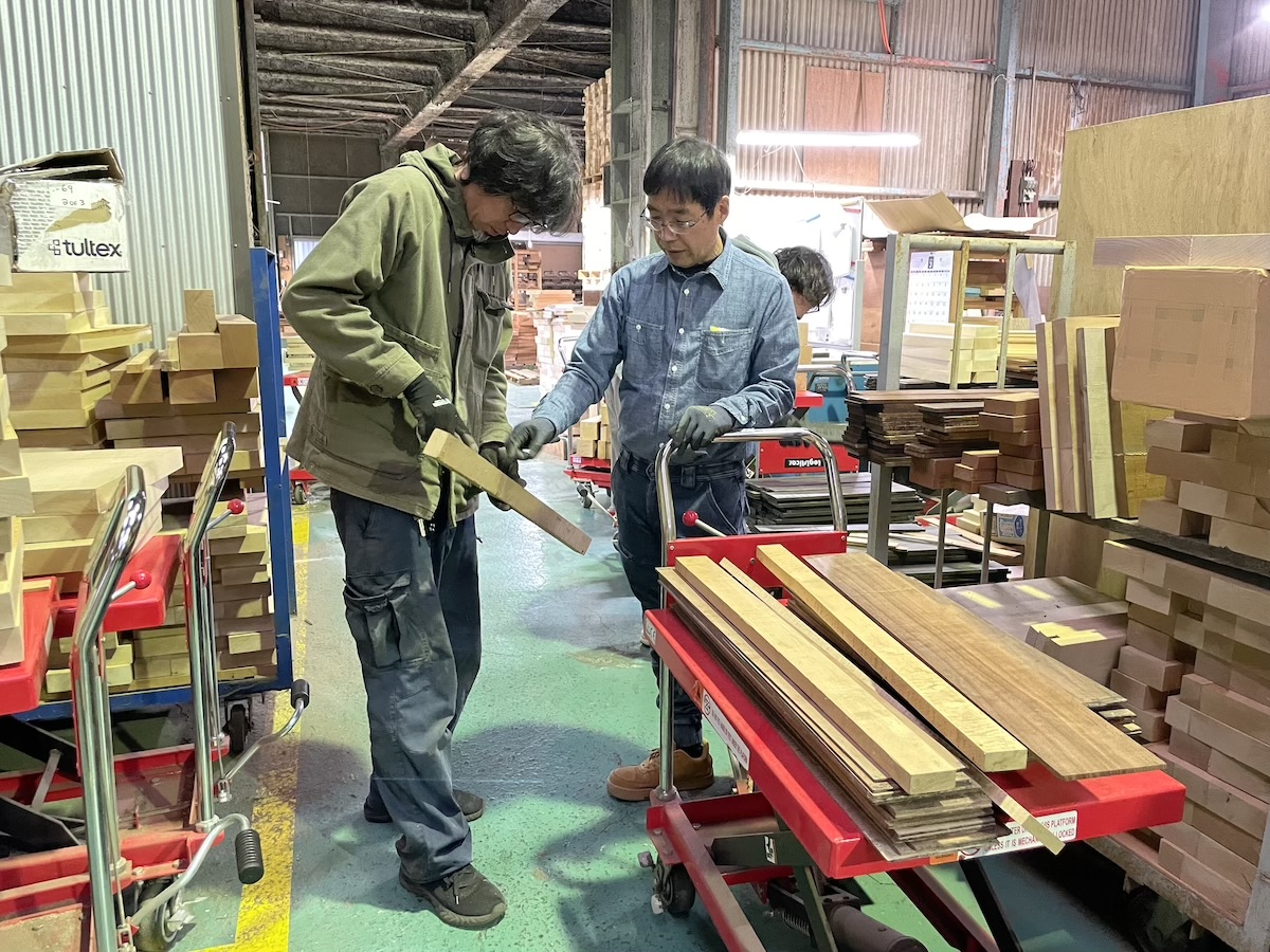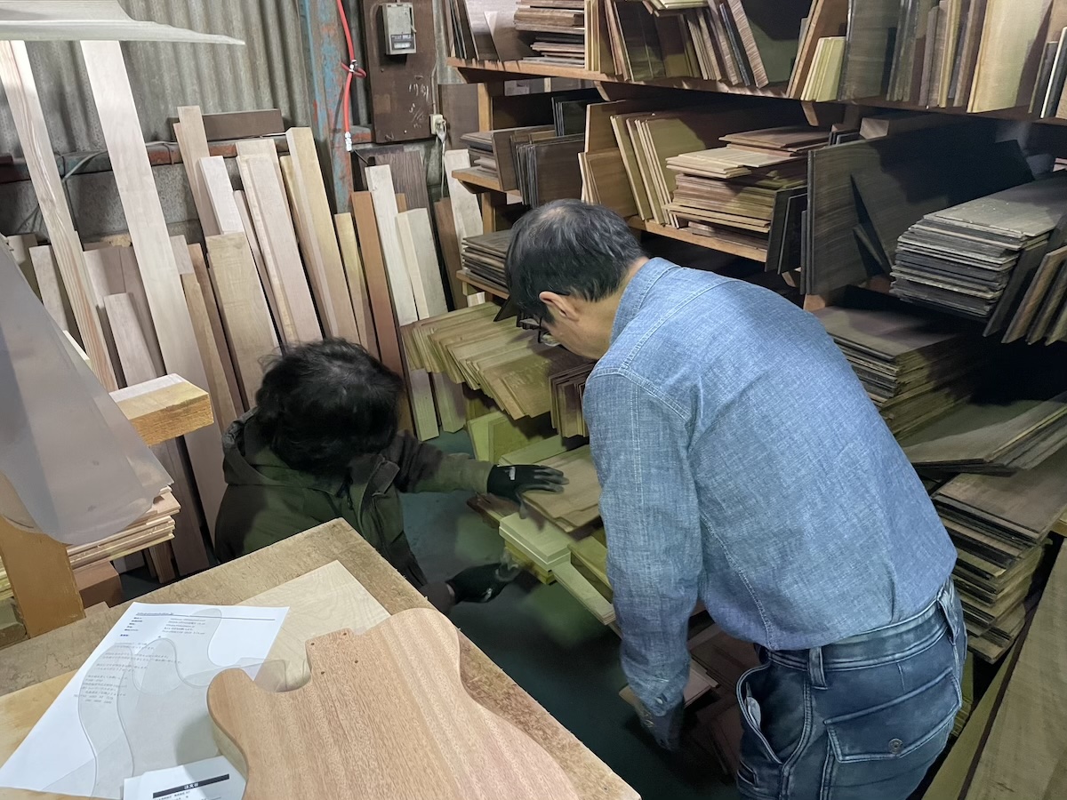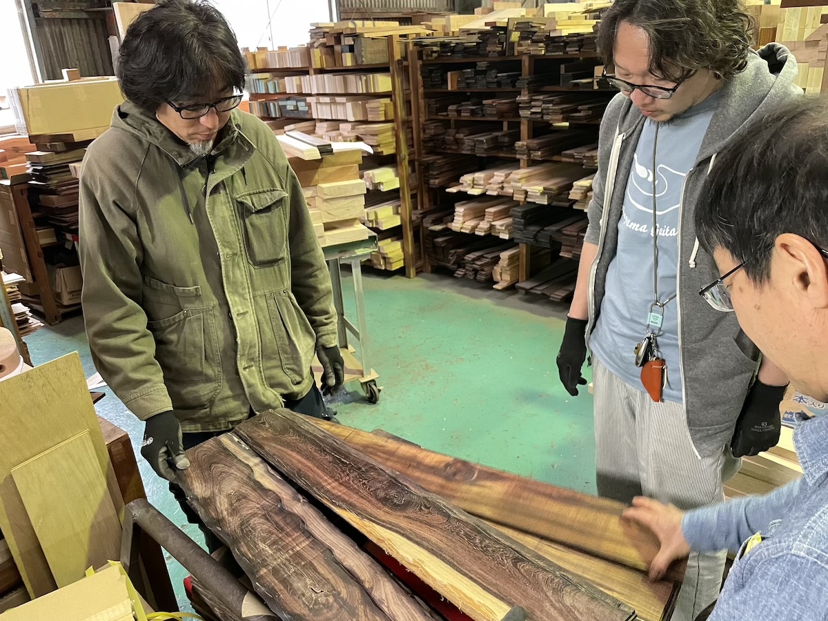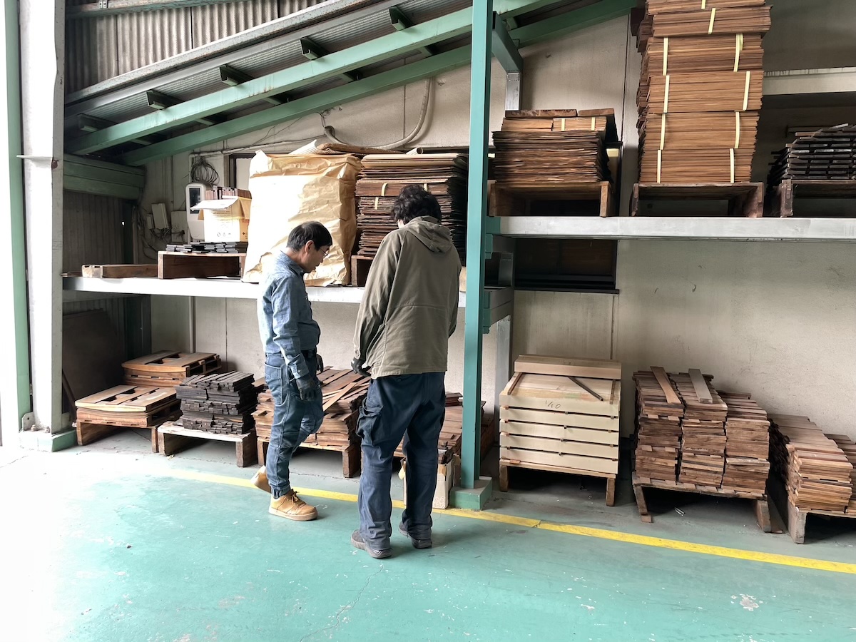 まずは、バック&サイド材を出していただきます。今後捌いていただくことも踏まえて、打ち合わせをさせていただきます。