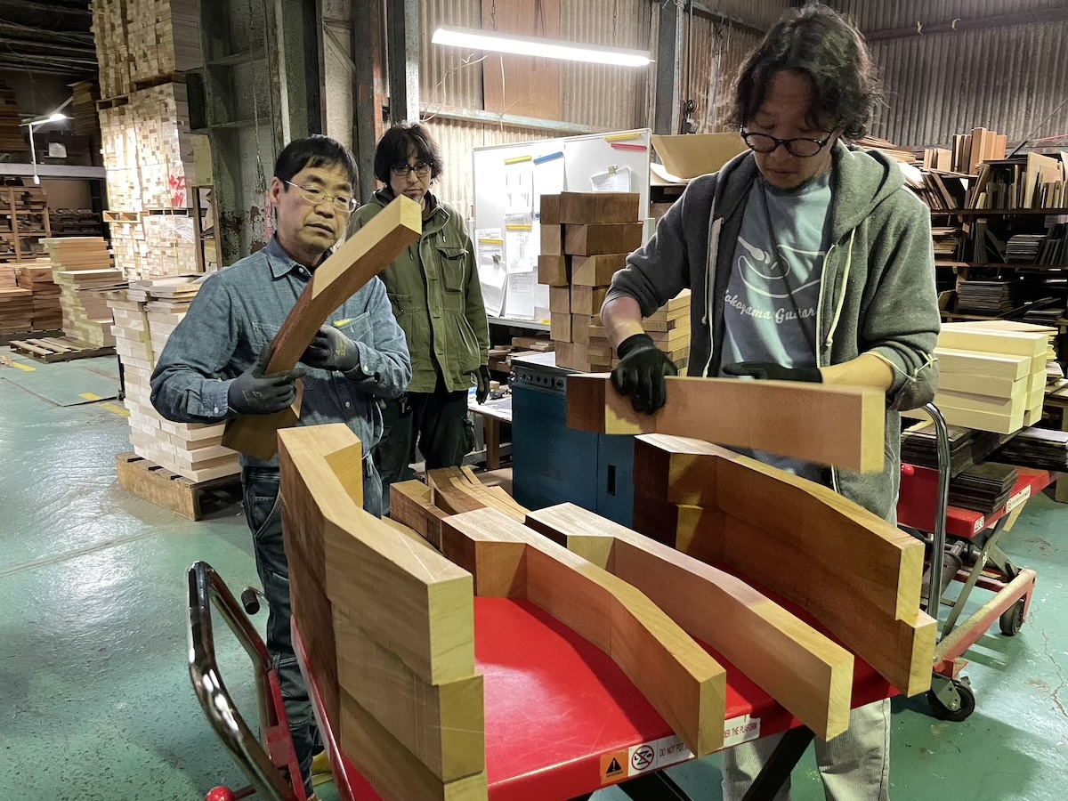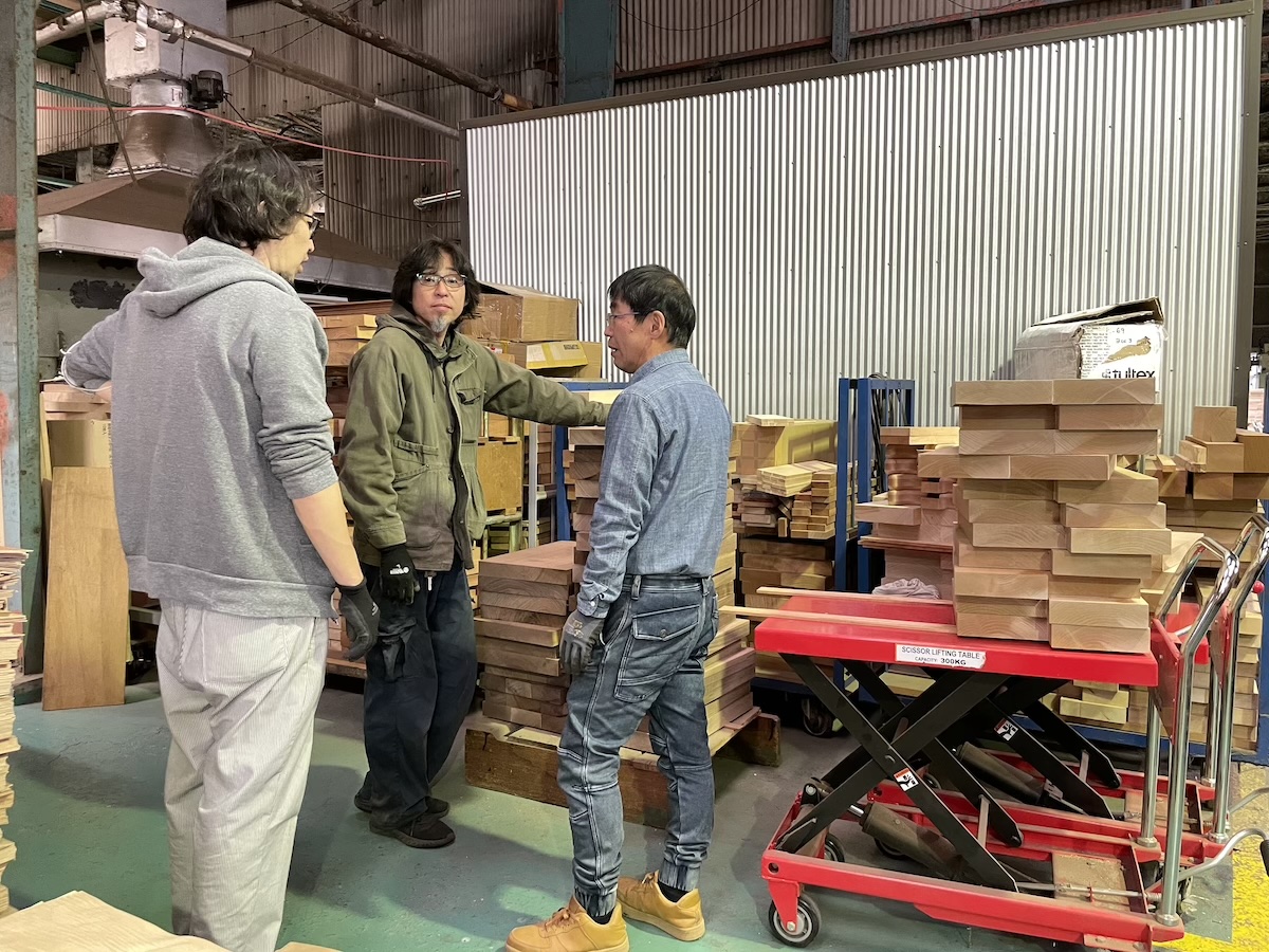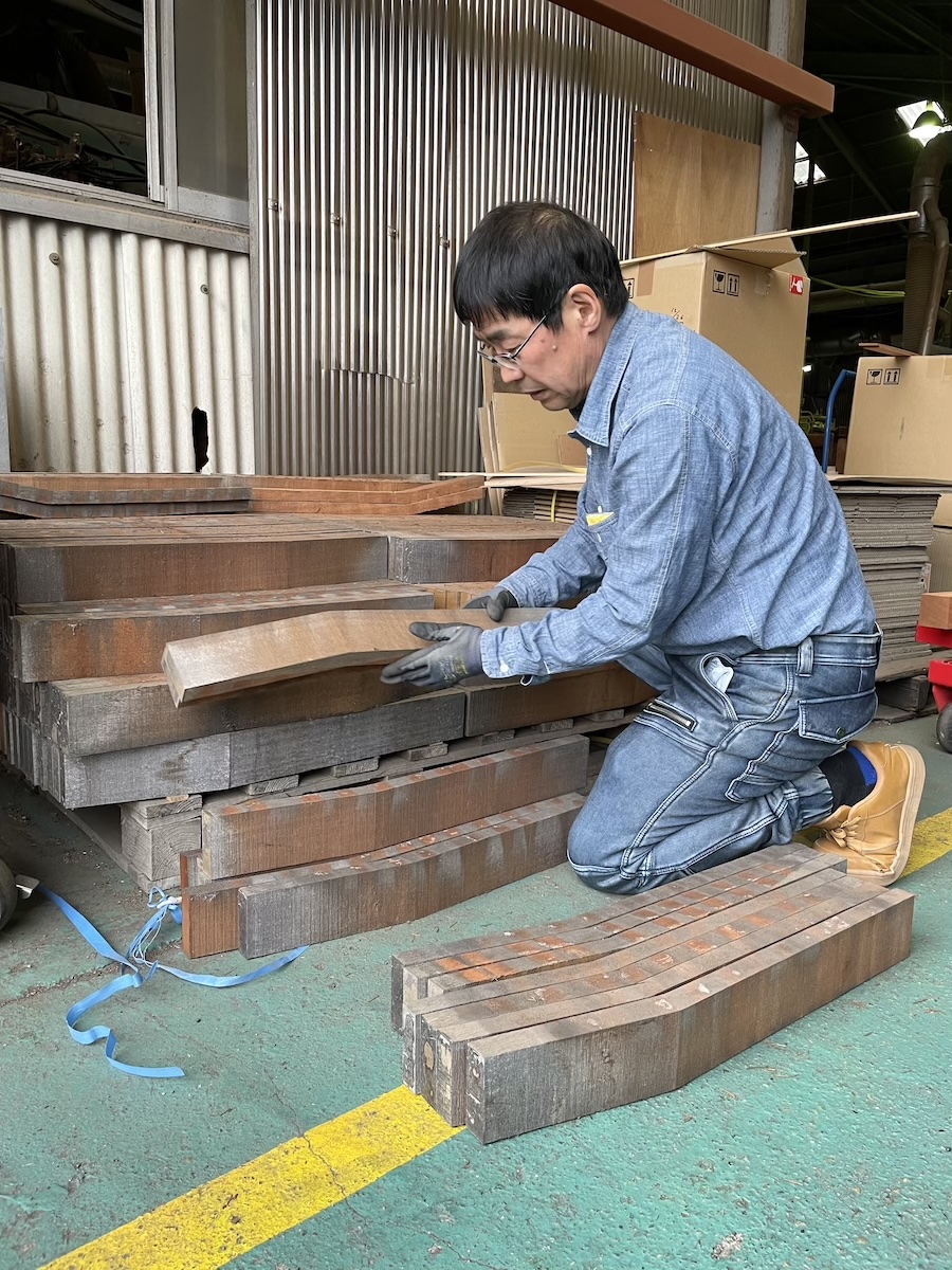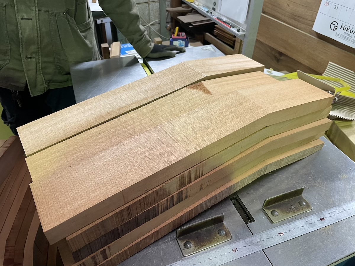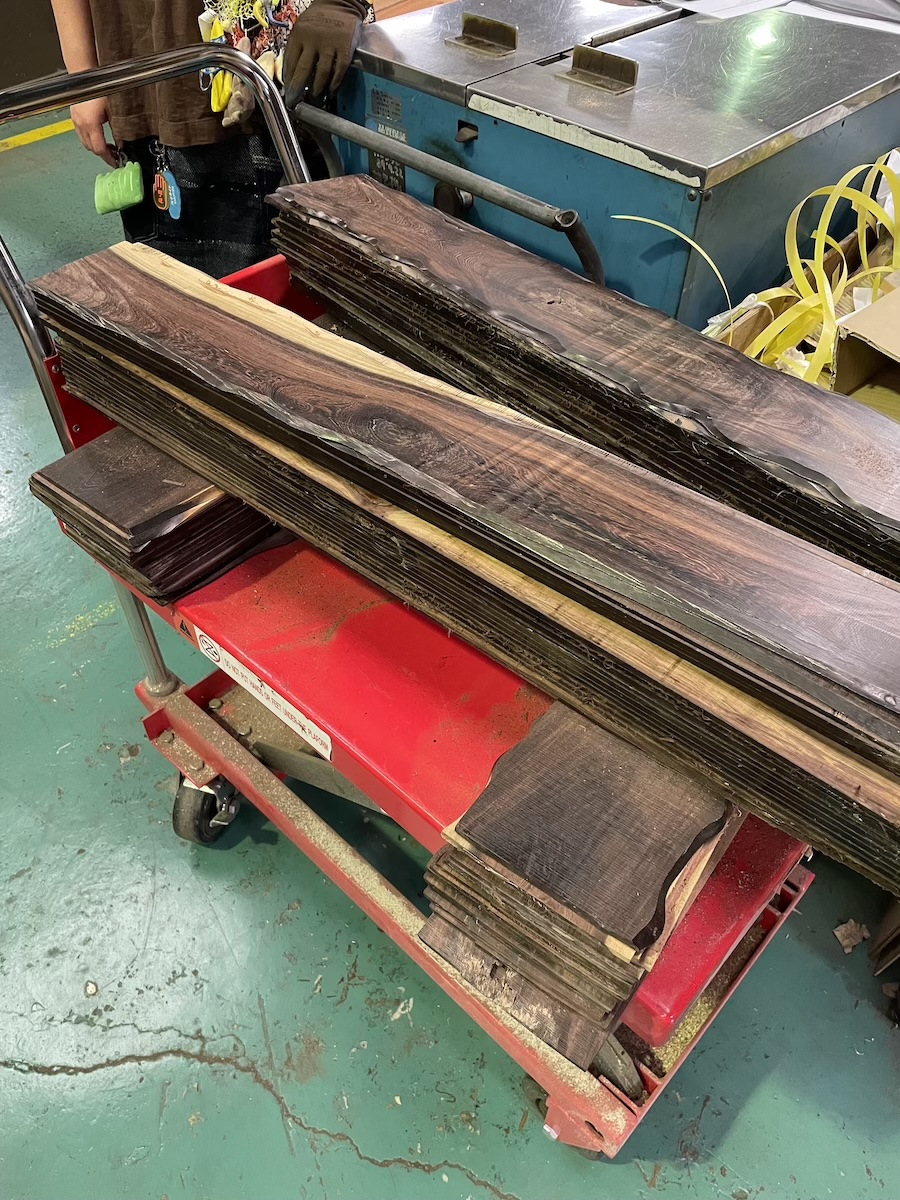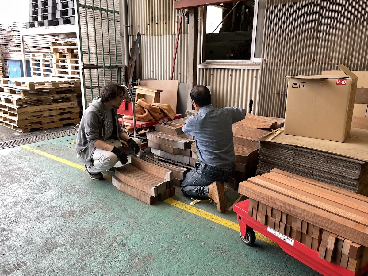 まずは、バック&サイド材を出していただきます。今後捌いていただくことも踏まえて、打ち合わせをさせていただきます。