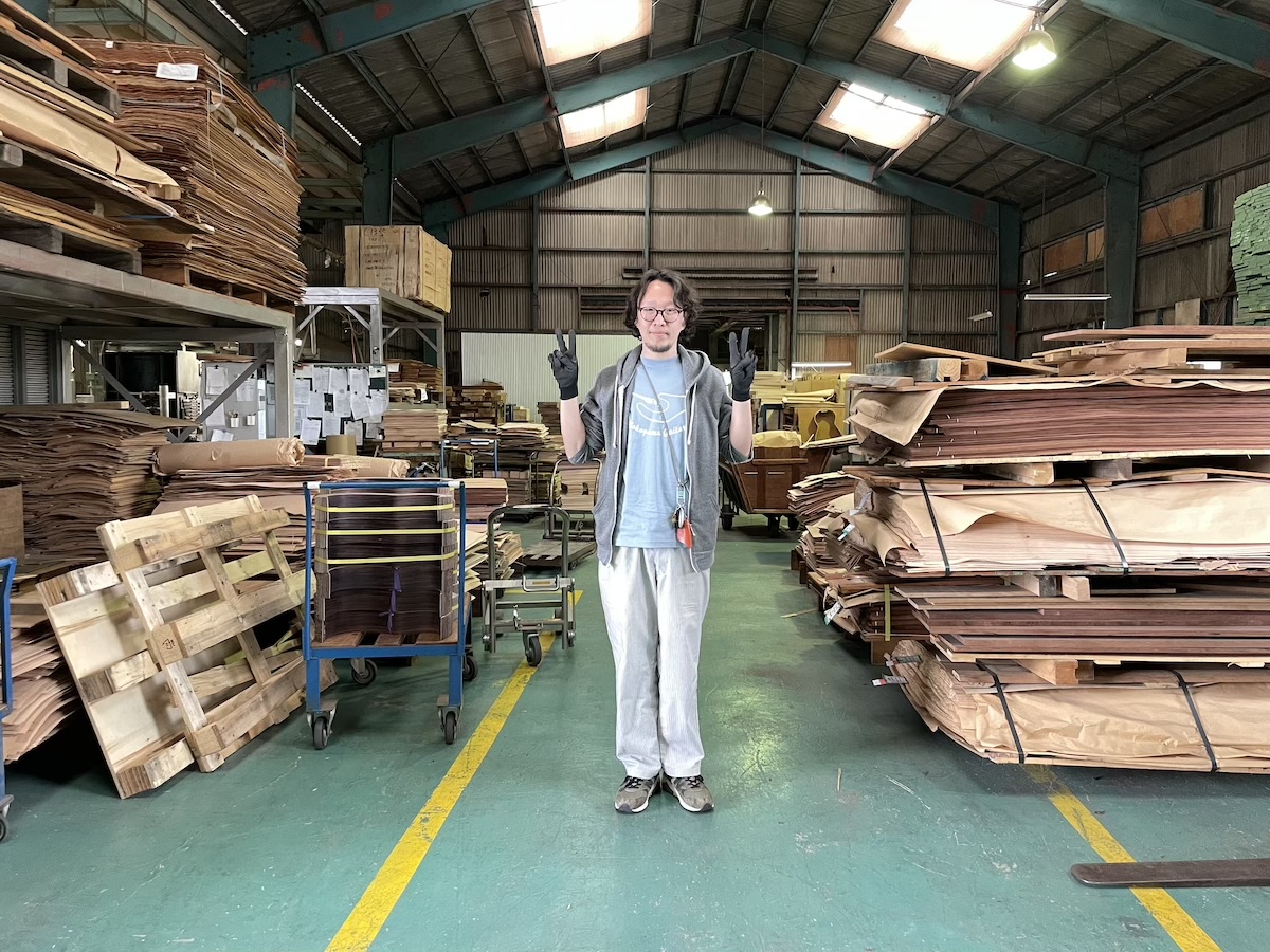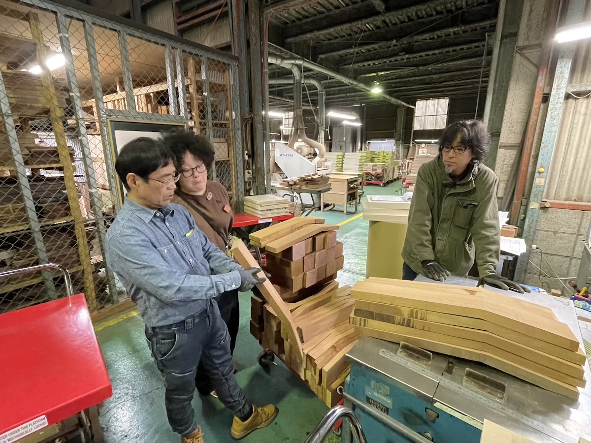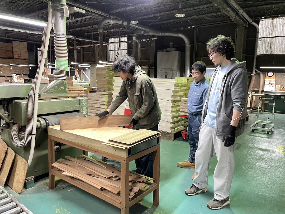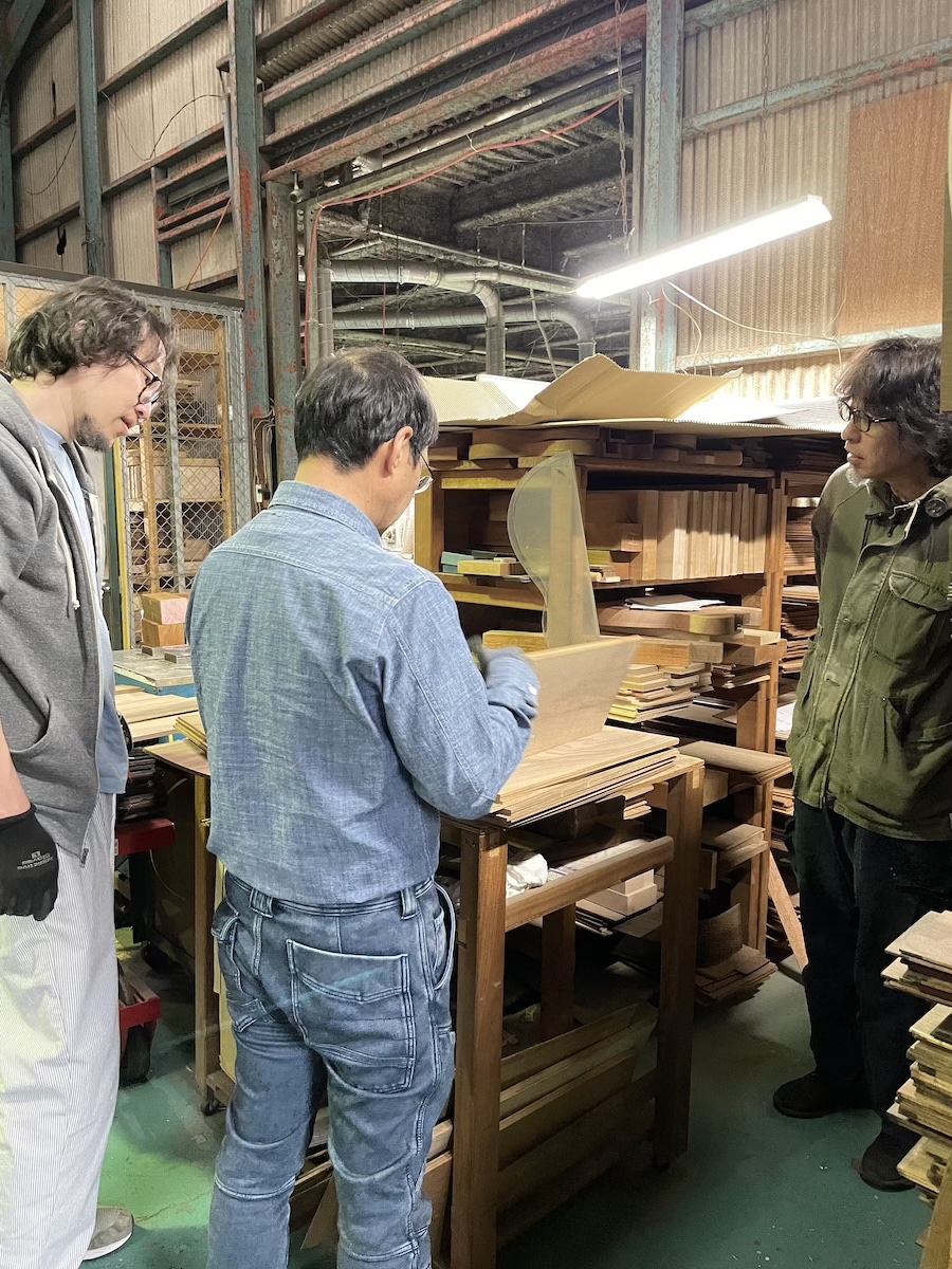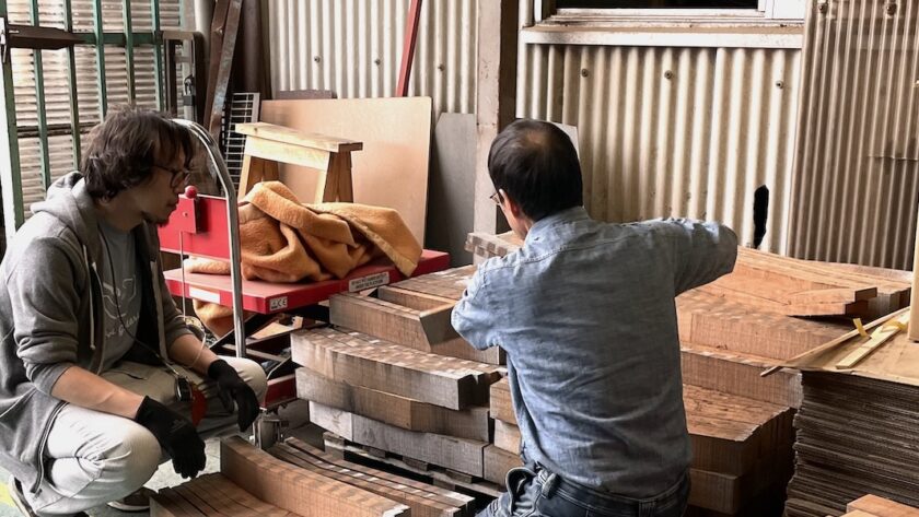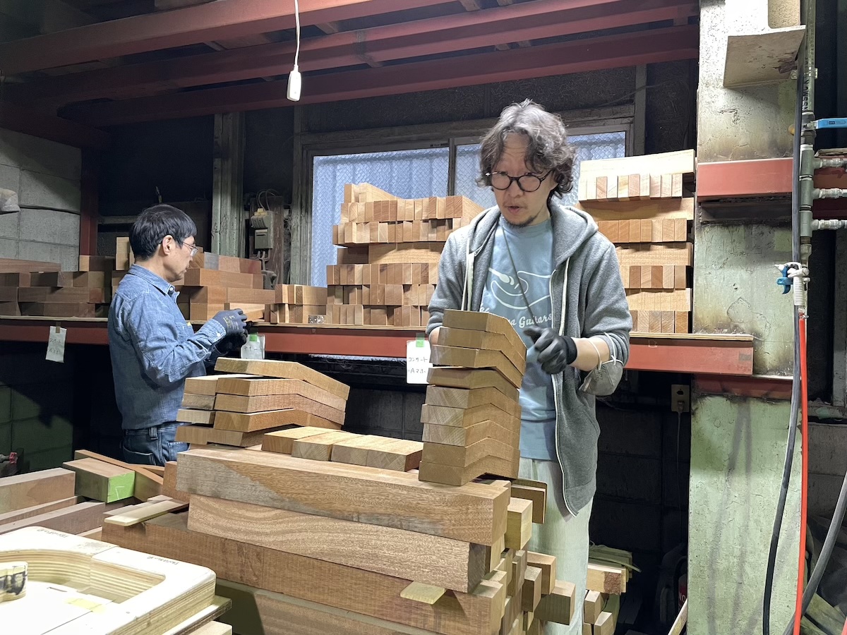 まずは、バック&サイド材を出していただきます。今後捌いていただくことも踏まえて、打ち合わせをさせていただきます。