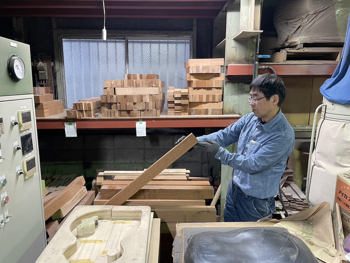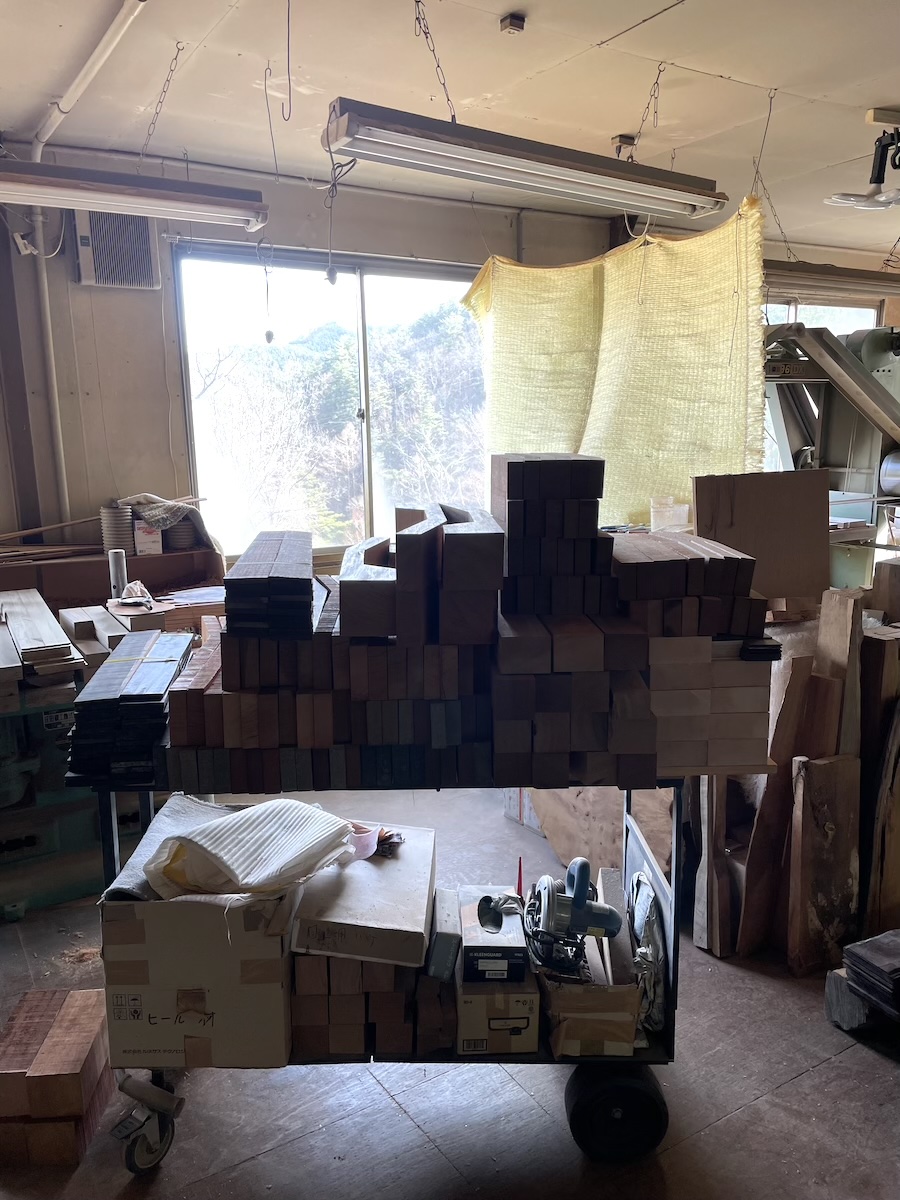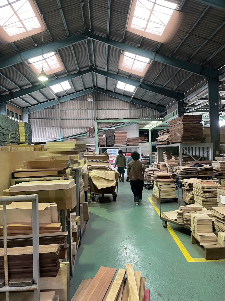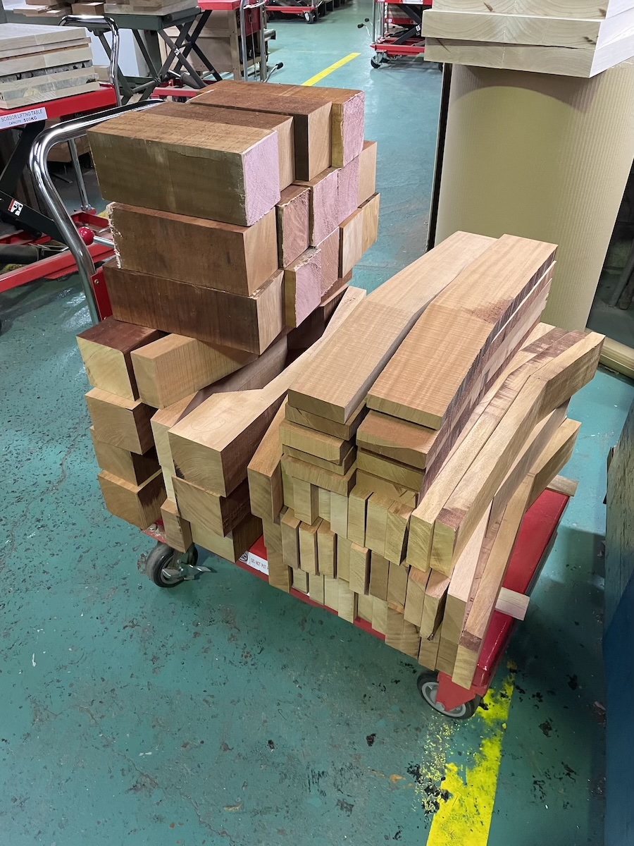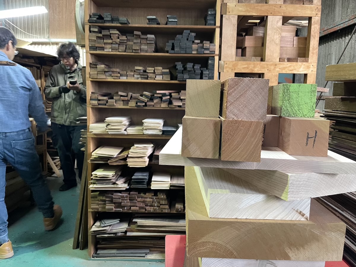 今年もアイチ木材加工さんへ、材料買い付けに行って参りました。昨年も大量に材料をいただいたのですが、少し不安なため、ネック材等を補充にお伺いしました。