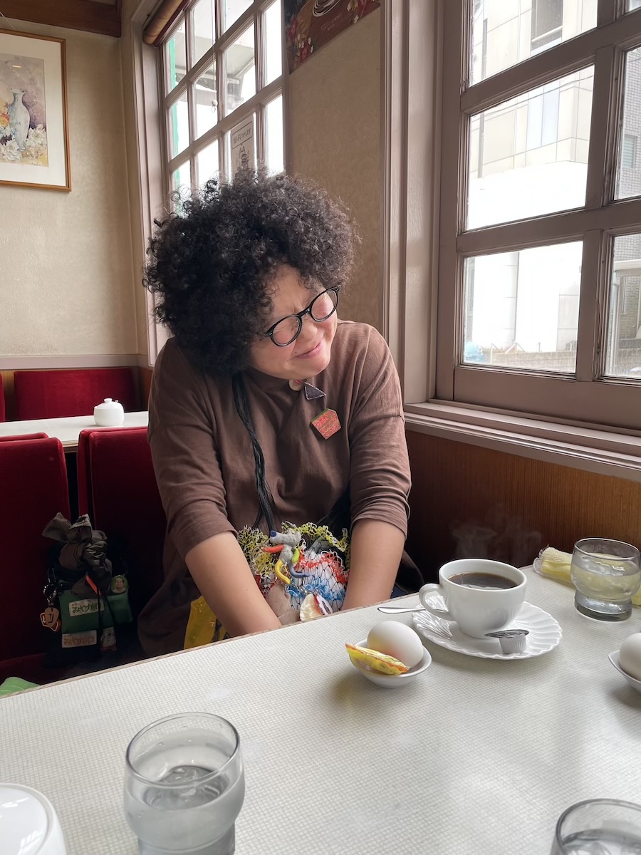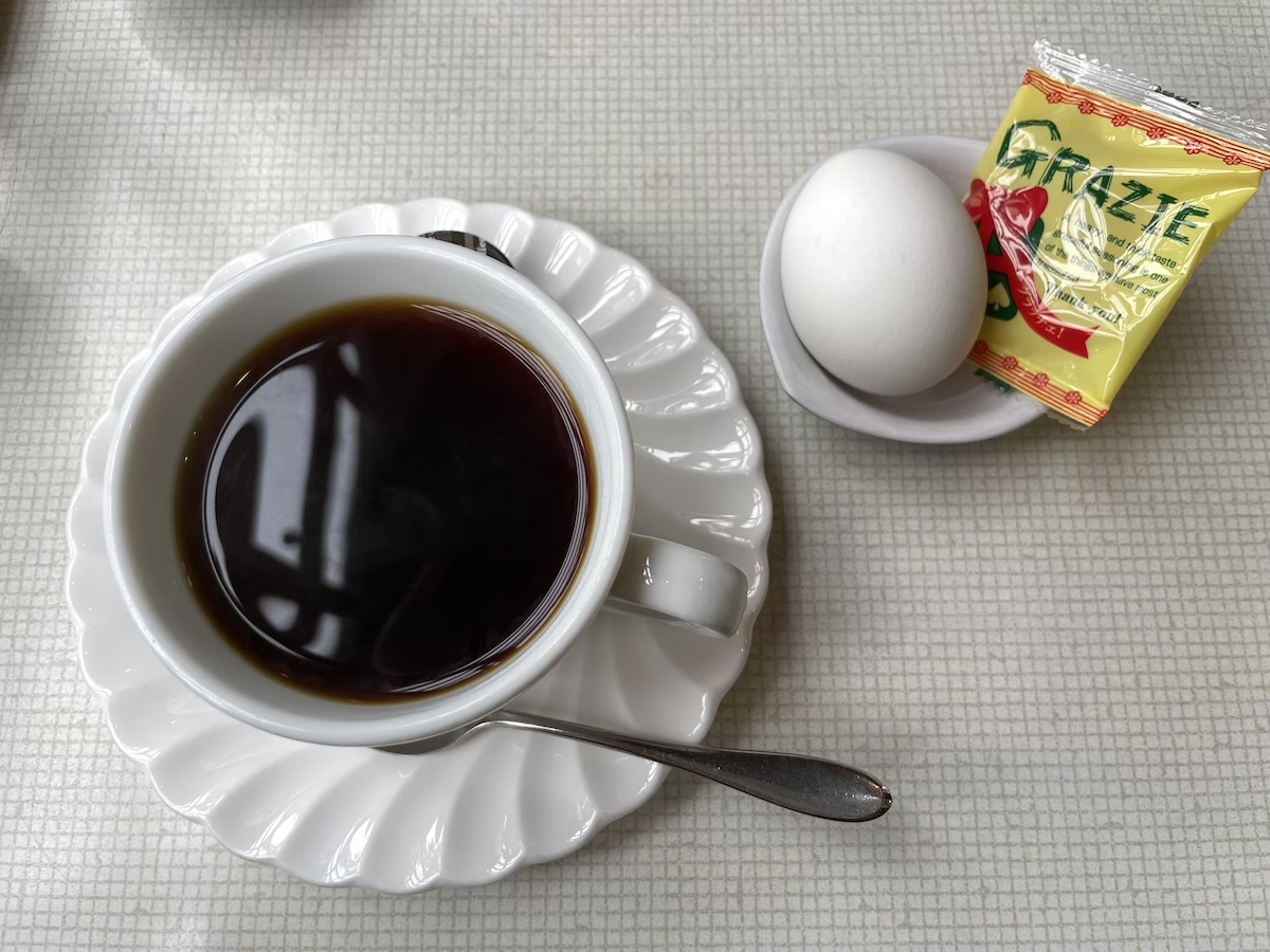 とても雰囲気の良い店内で、寛ぐ3人。コーヒーには、ゆでたまごと豆菓子付きです。