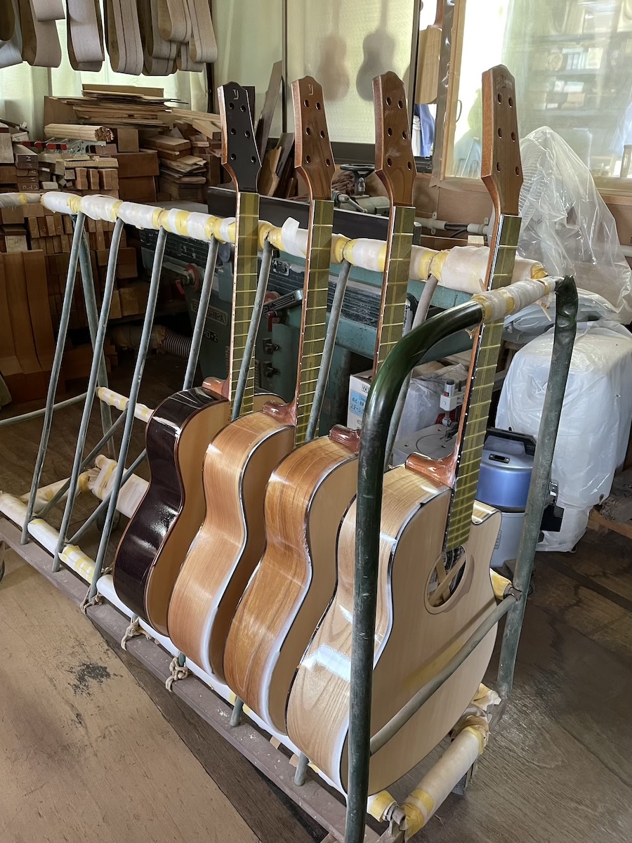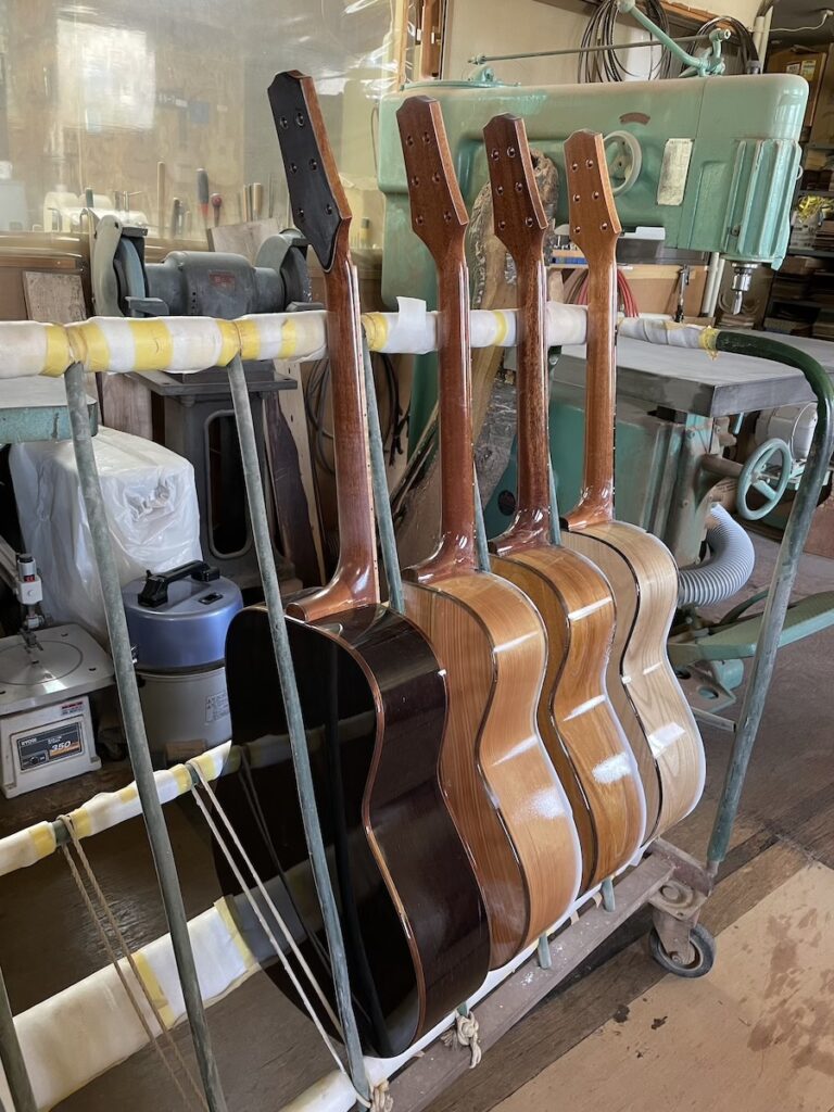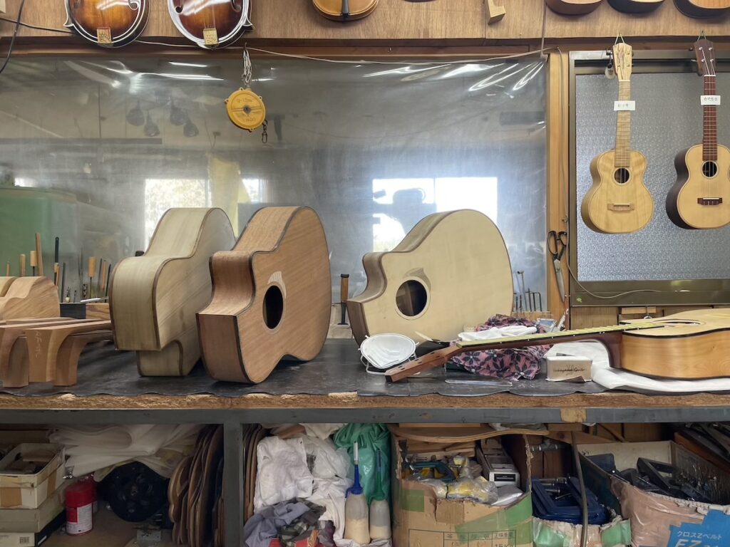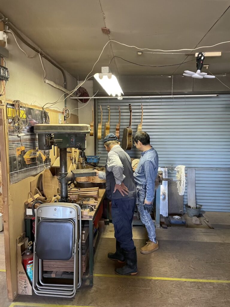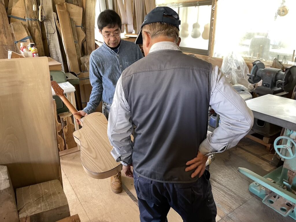 せっかくなので工房に戻り、桐材のギターやウクレレをご覧いただきました。生木なので、乾燥まで数年かかりますが、現在はまだ材料をストックしているので、寝かせておくのにちょうど良いです。