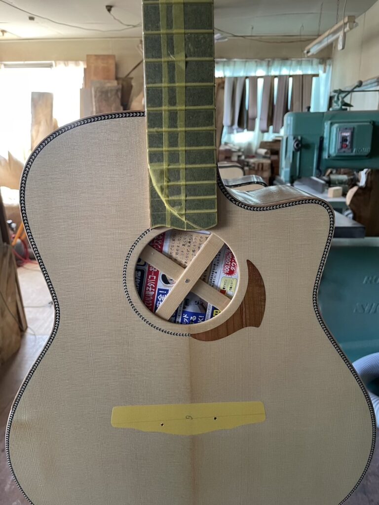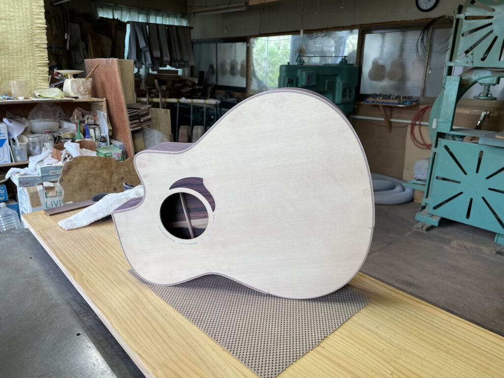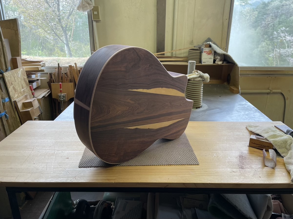 ボディの木工が一段落ついたARモデル。こちらも、カマティロバック&サイドのお客様オーダー品です。