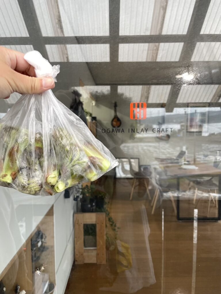 工房付近のタラの芽を大家さんにいただいたので、小川さんにも初物をお裾分けです。