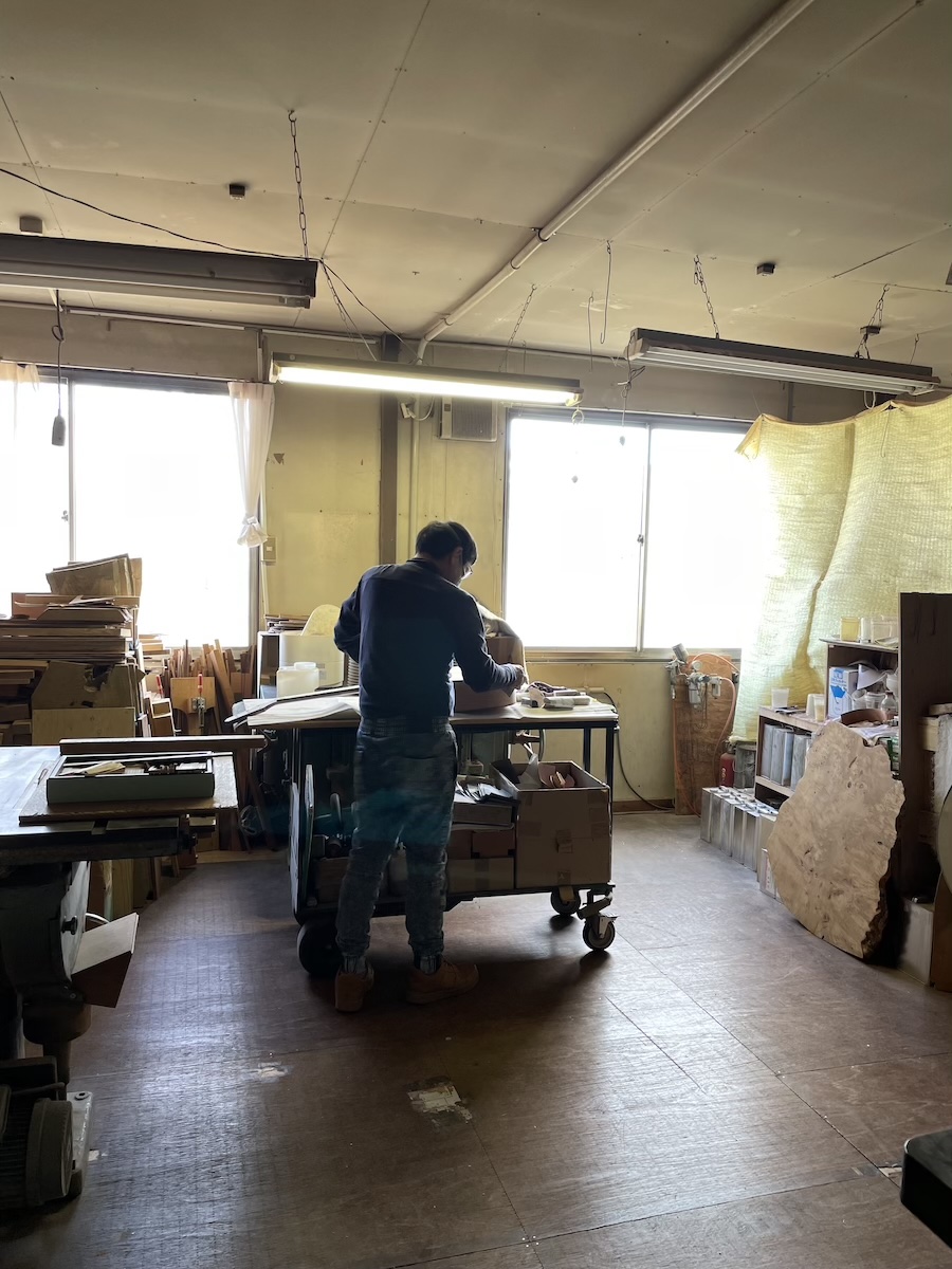 薄く挽くことはできない為、ある程度加工しやすいサイズまでカットしていただきます。工場も拝見させていただきましたが、さまざまな木がストックされています。