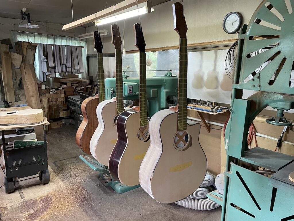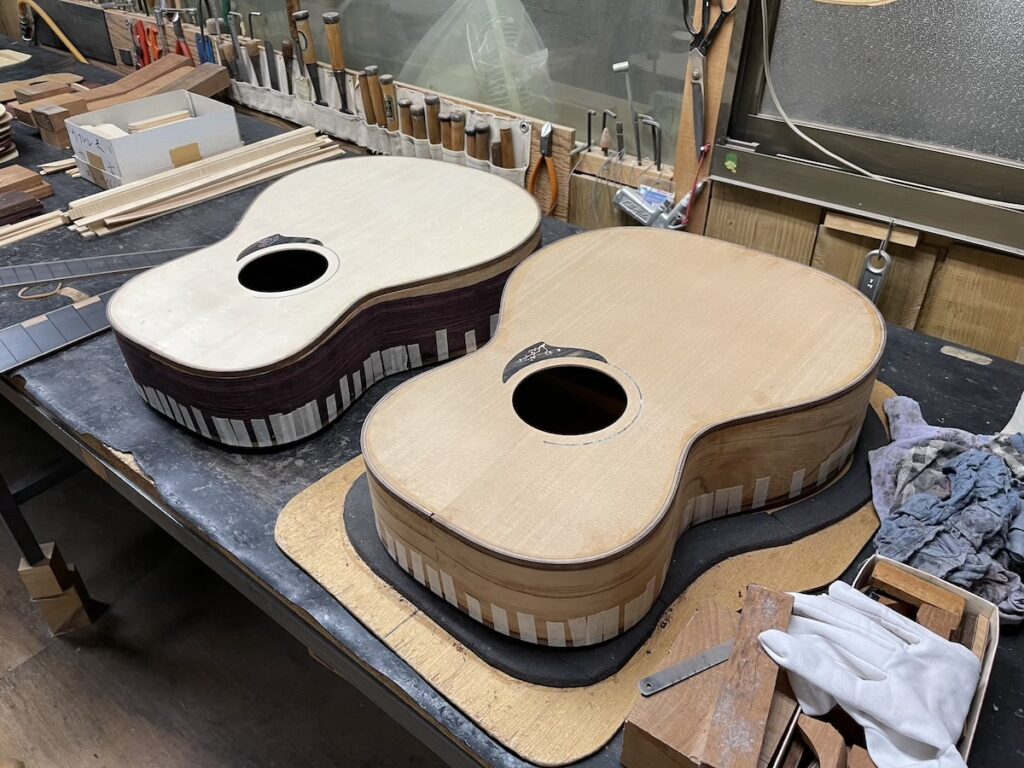 工房ではハンドクラフトギターフェス展示モデルの他、お客様オーダー品も並行して製作中です。