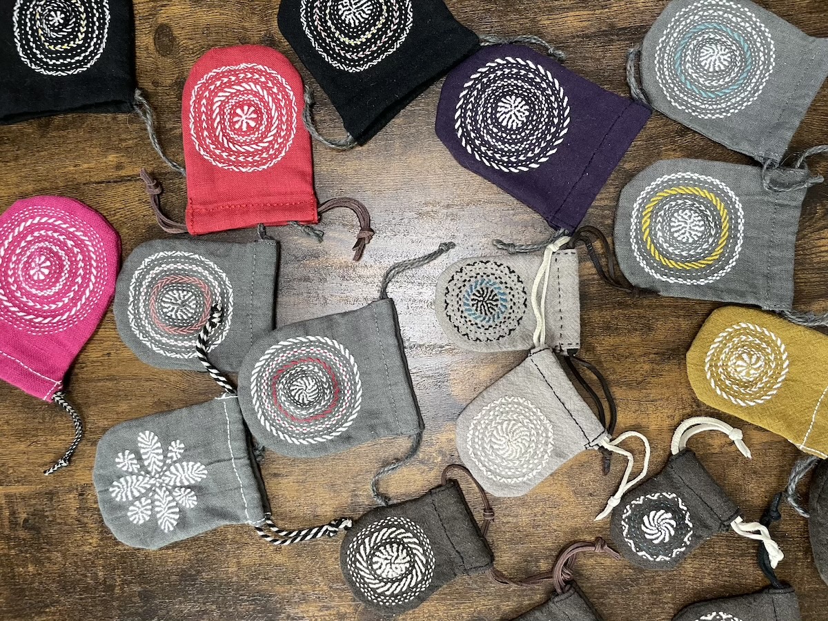 小物入れの「ポコポー」も大好評です。カンタ刺繍、素敵ですよね。