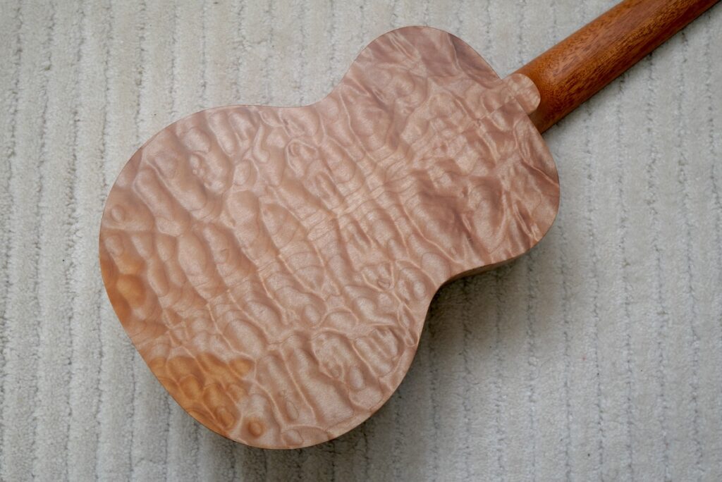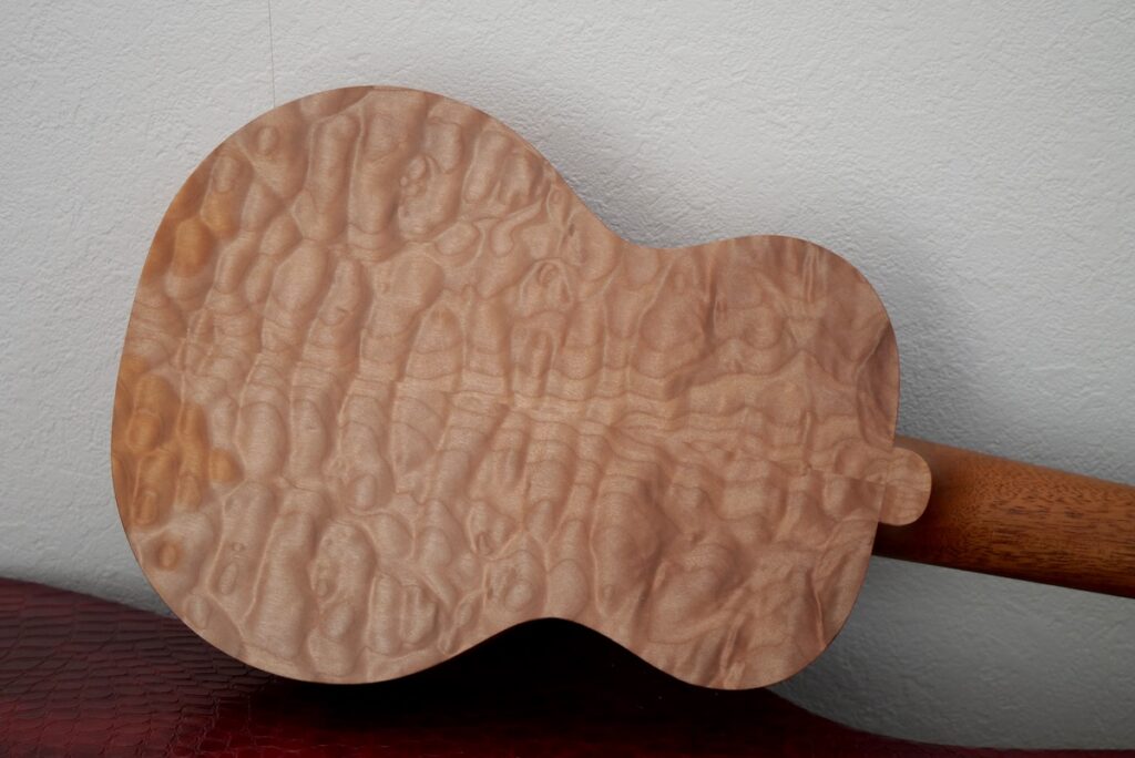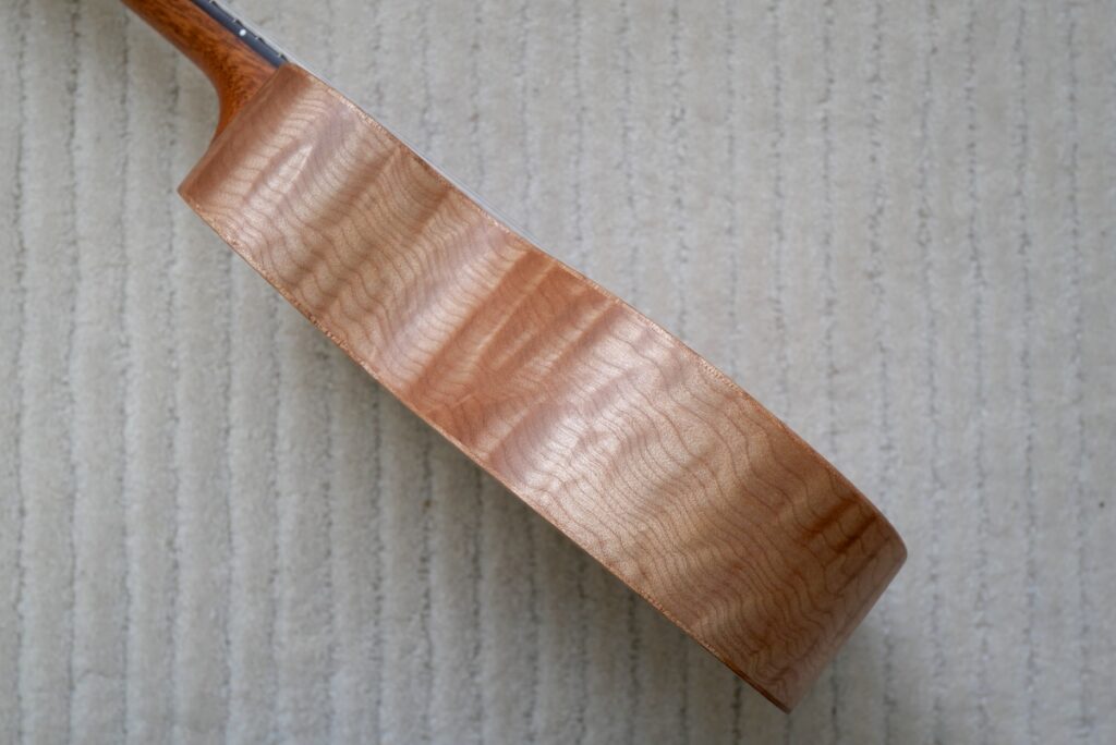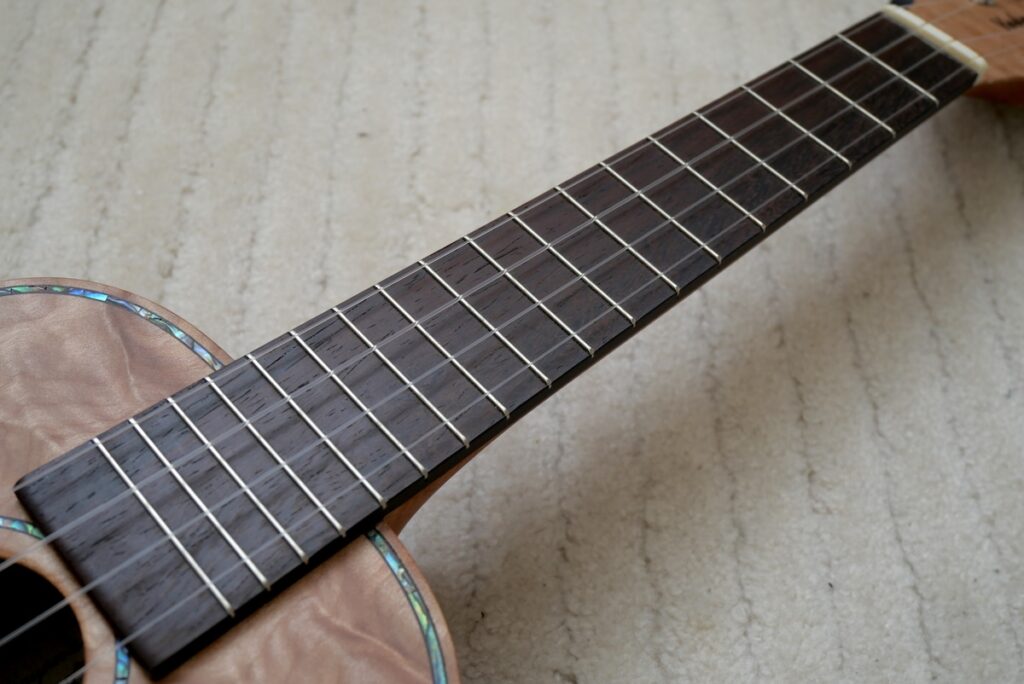 スケールは約380mm、14フレットジョイントとなっています。ギター同様、右手があたるエルボー部分は、丸くコンター加工されています。