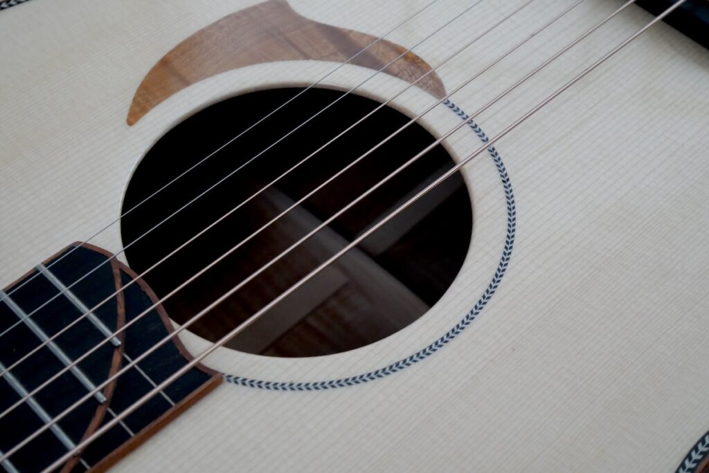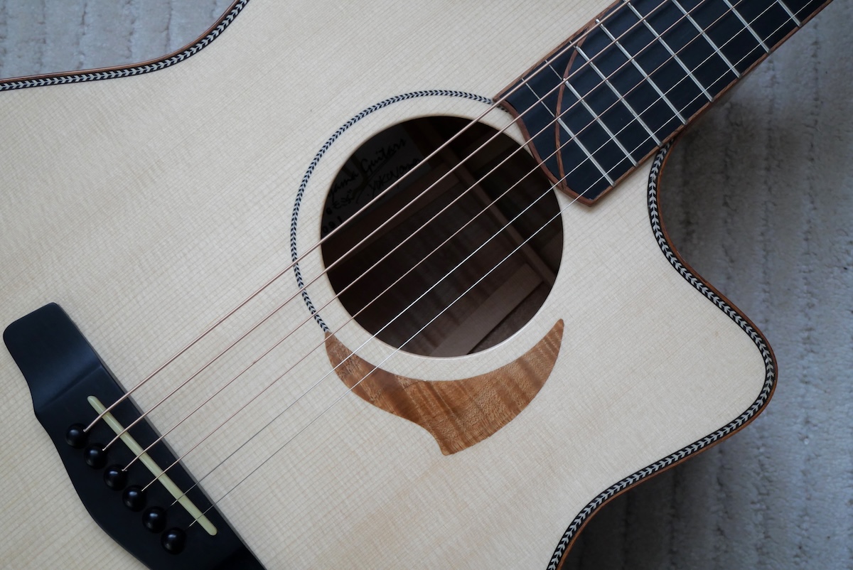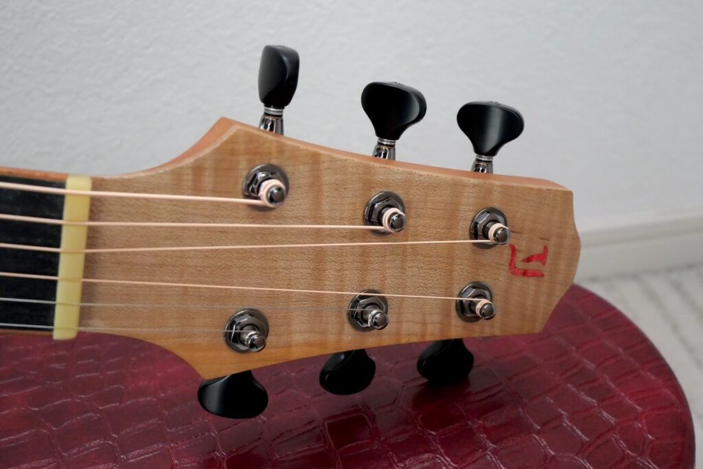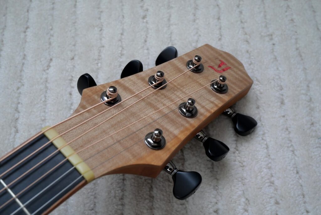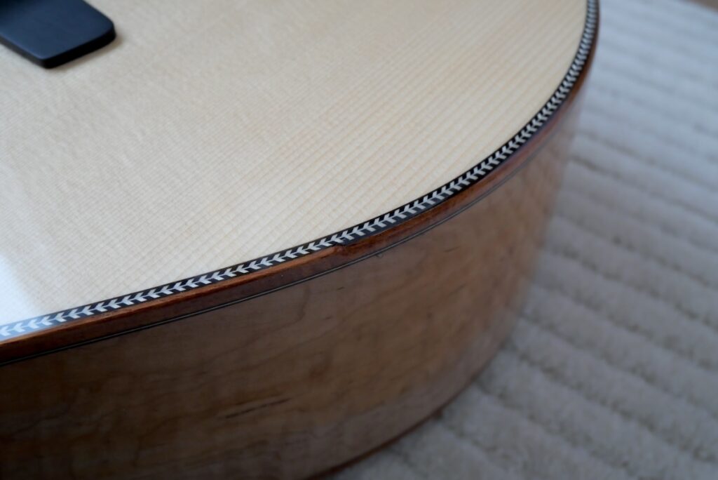 ヘッド天神、ロゼッタにはボディ材に合わせてもみぢ材を採用しています。ロゼッタライン、トップパーフリングのヘリンボーンも相まって、シンプルながら、グッとくるルックスに仕上がっています。