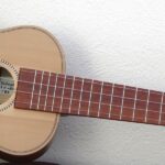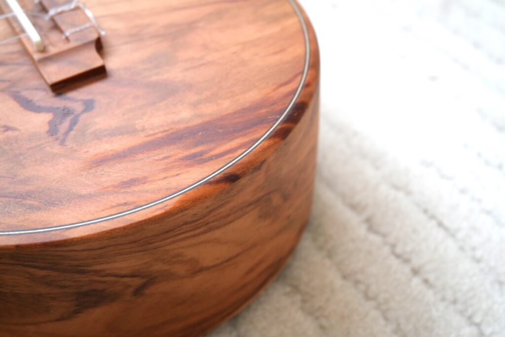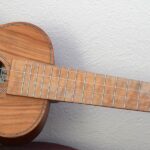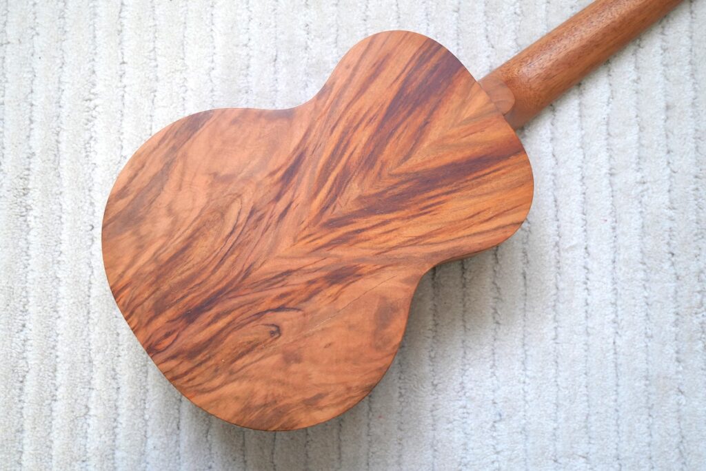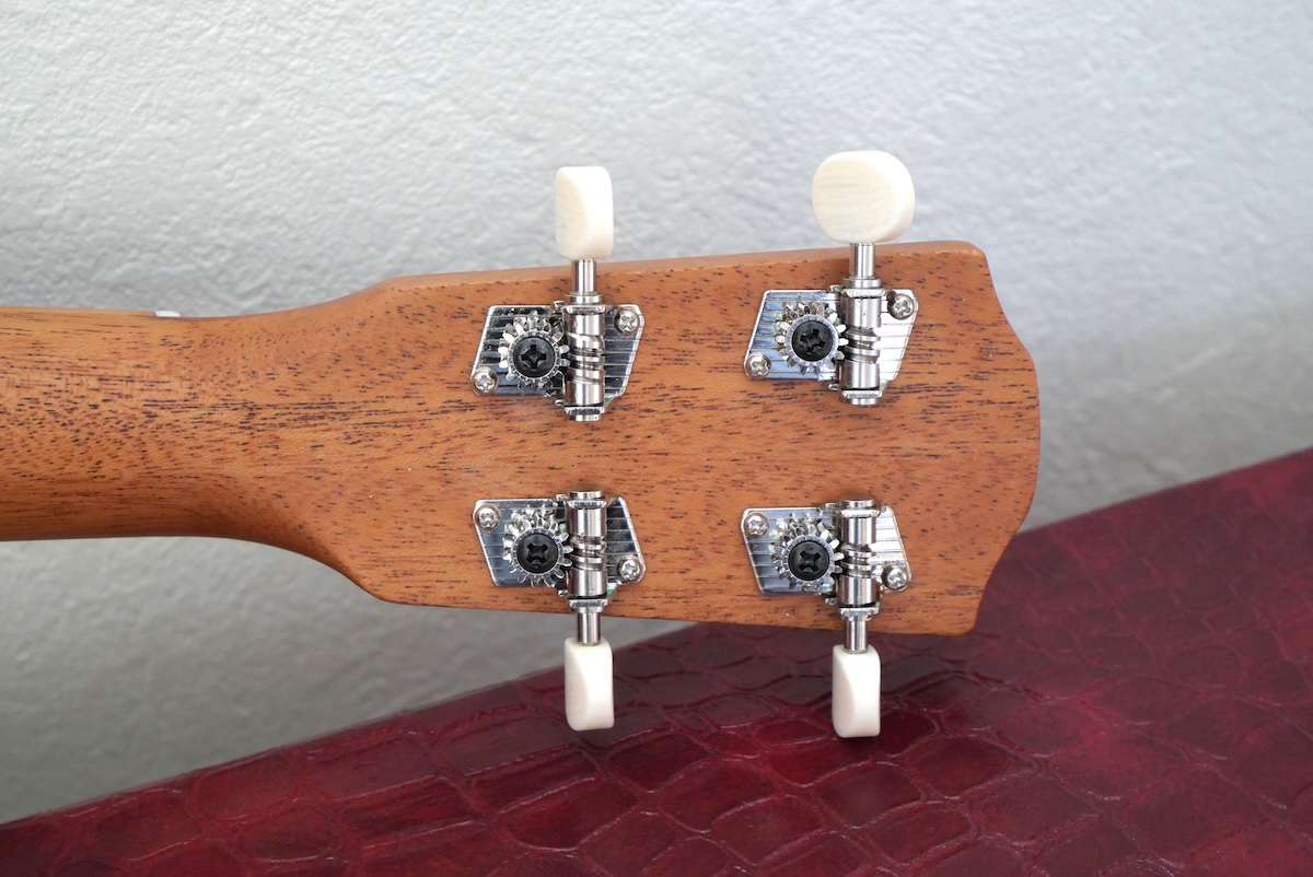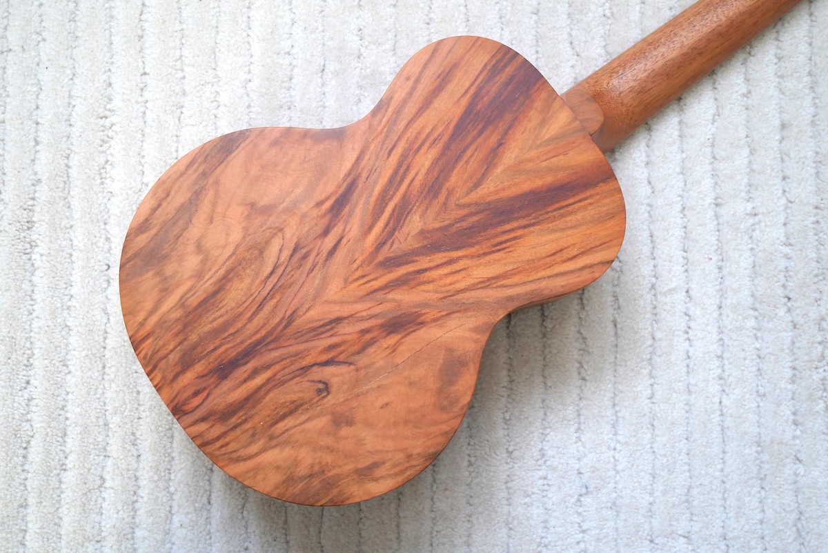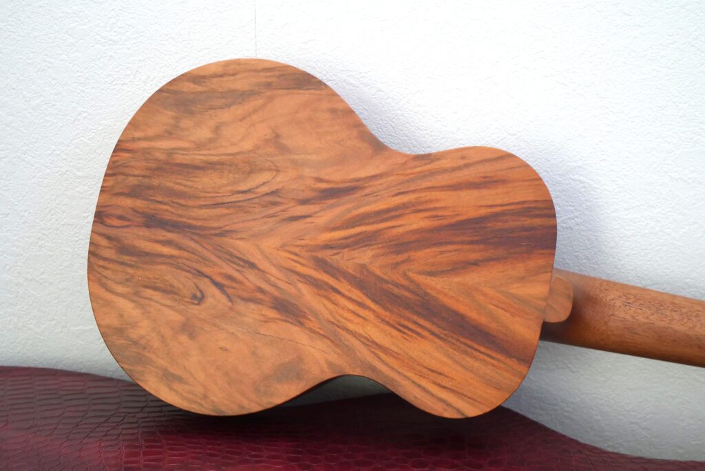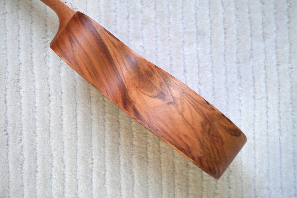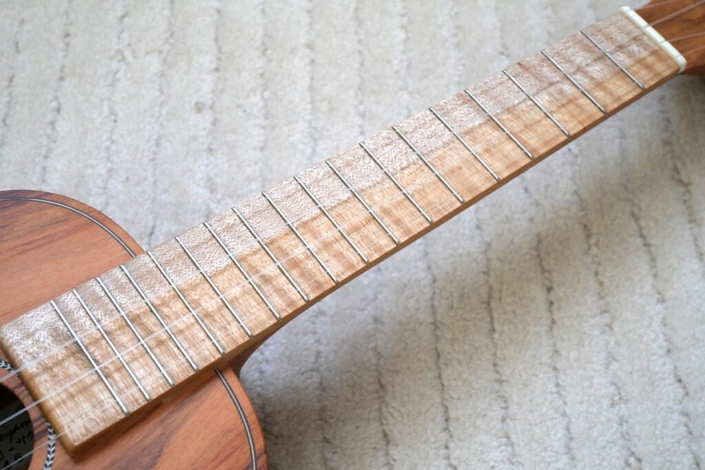 ネック材にはマホガニー、指板には奥多摩産の杢の入った「もみぢ」、ブリッジ駒、ヘッド天神には「ソメイヨシノ」を使用しており、スケールは約380mm、14フレットジョイントとなっています。