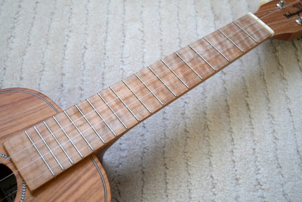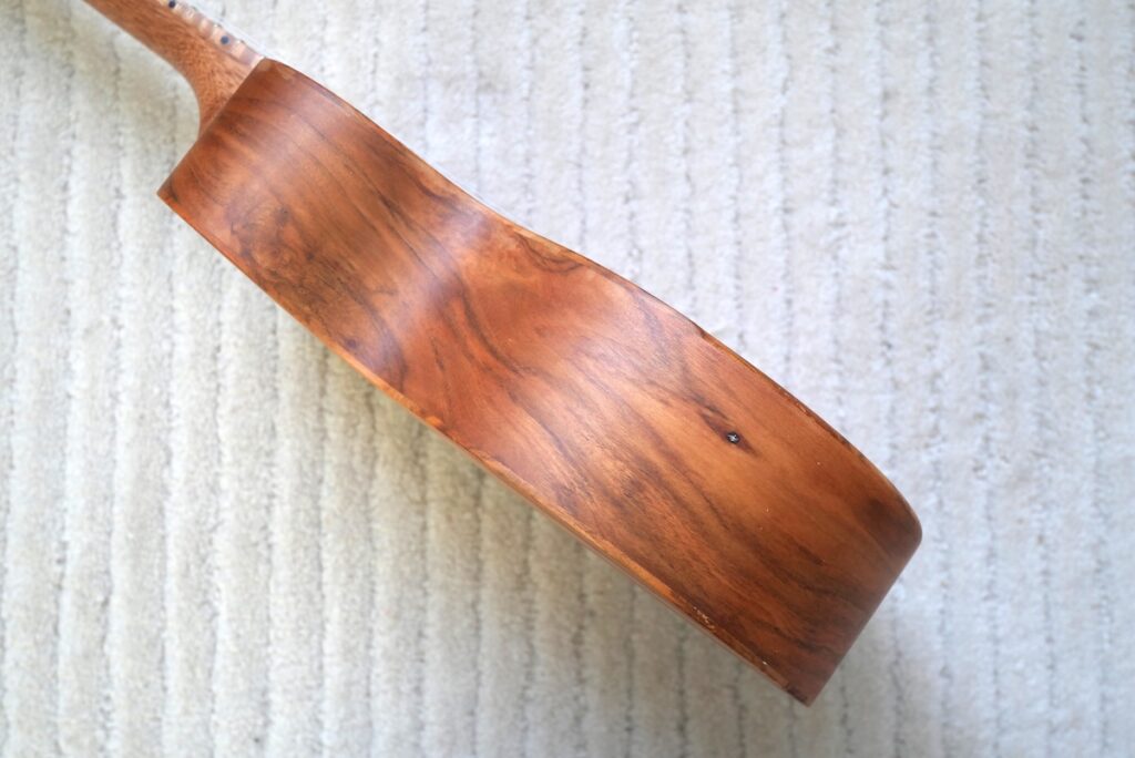 ネック材にはマホガニー、指板、ブリッジ駒には奥多摩産の杢の入った「もみぢ」、ヘッド天神にはけやき材を使用しており、スケールは約380mm、14フレットジョイントとなっています。