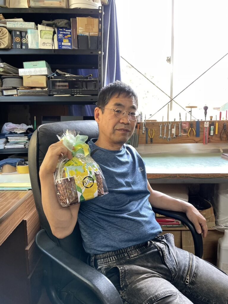 工房に到着し、まずは月末に誕生日を迎える横山に誕生日プレゼントを。新潟でお菓子の詰め合わせをセレクトしてきました。(この誕生日で68歳になります。)