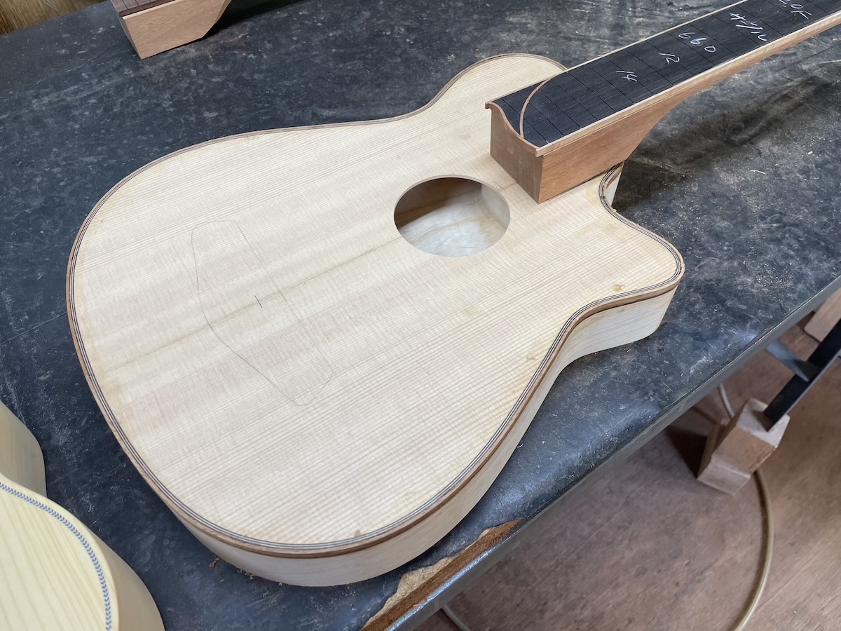 今回は、S様のリクエストにより、「Leaf-Quiet」初となるサウンドホールありのモデルとなっています。初めてですが、とても良い雰囲気ですね。