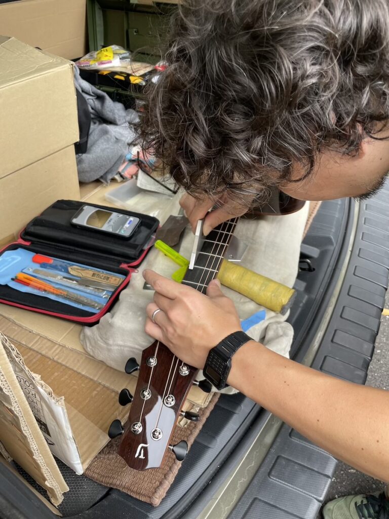 先日の小川売店さんでのウクレレ大試奏会で、H様にご購入いただいた黒柿のコンサートモデルに、ピックアップの取り付けです。