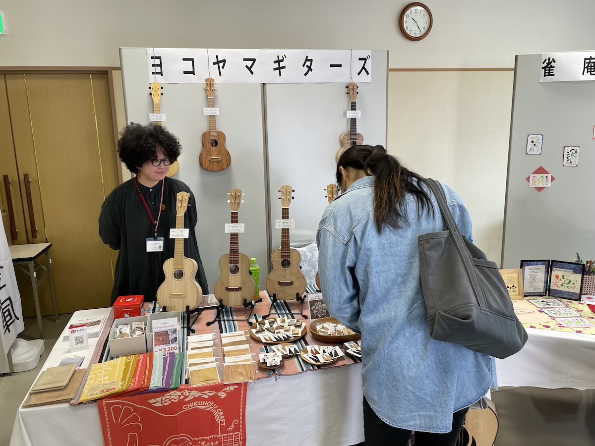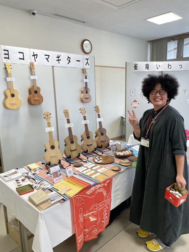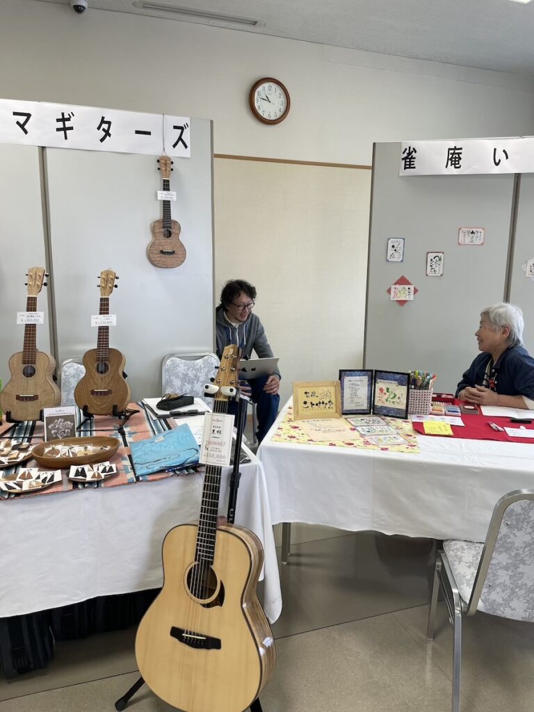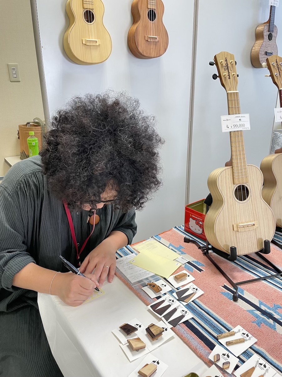 ギターも持参しましたが、ウクレレと小物を中心に展示します。イベント前に、アクセサリー類のプライス付け。最近は、端材で製作したチャームやピアスが、イベント会場で大人気です。