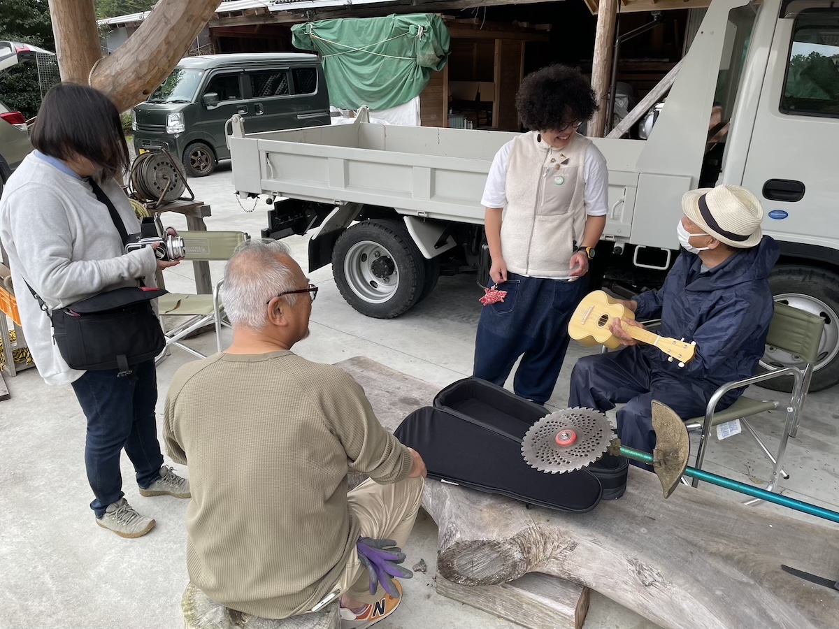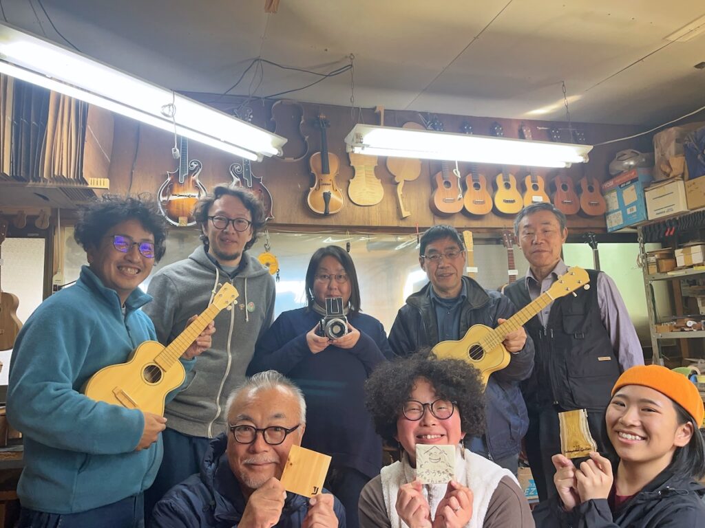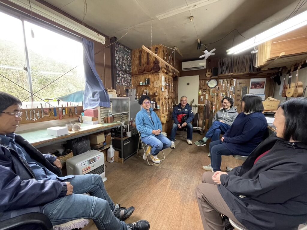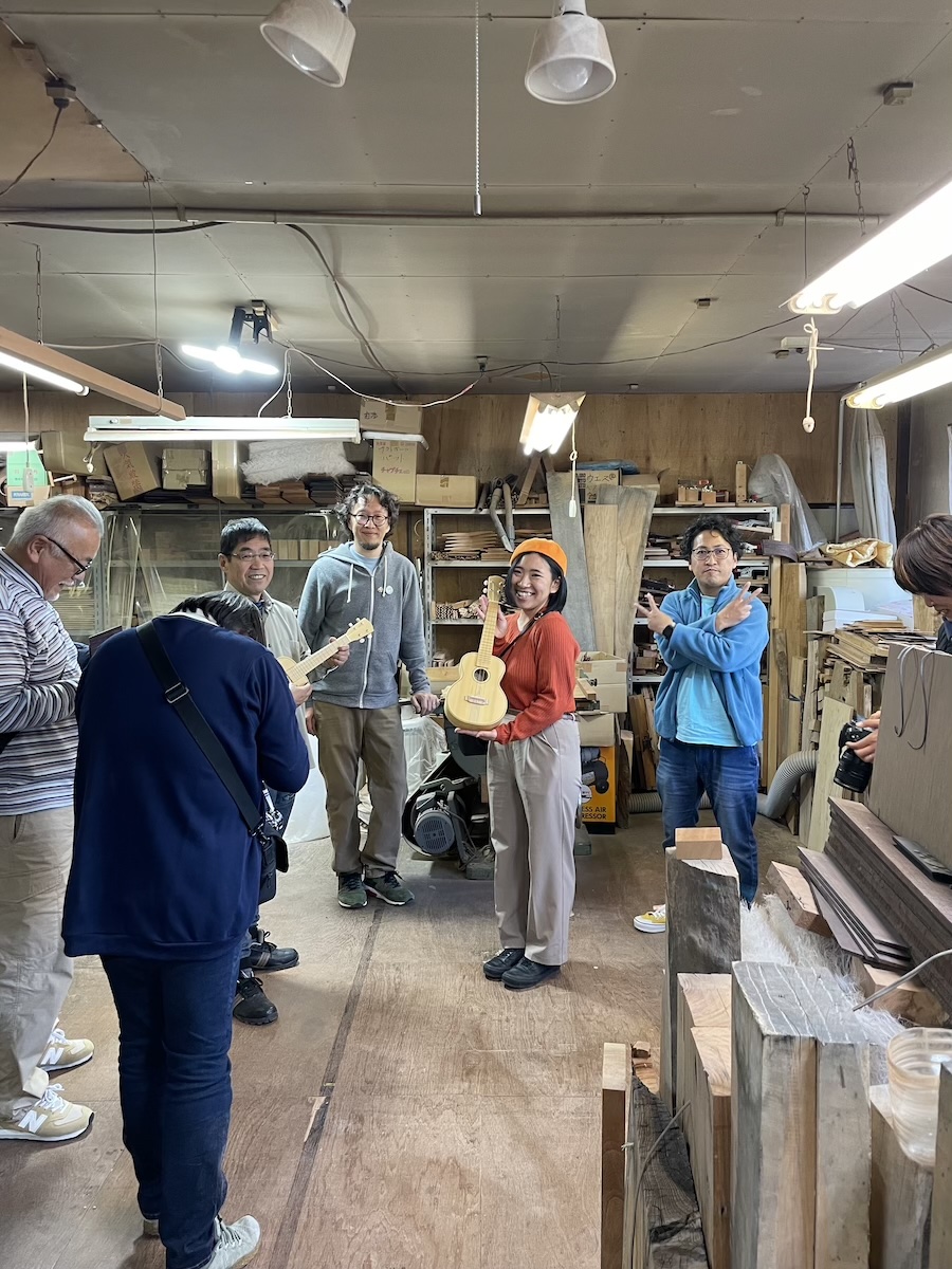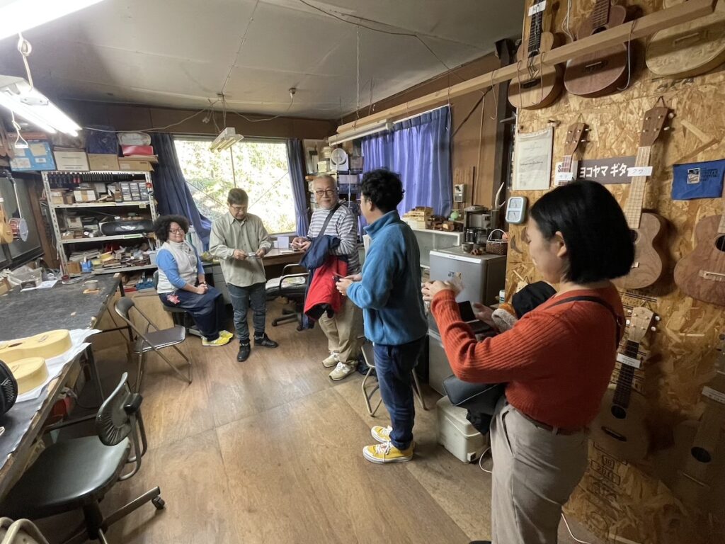 横山本人と広野組は、この日が初対面。挨拶を済ませると、早速製作中の「かや」ウクレレや、工房内部を見学してまわります。