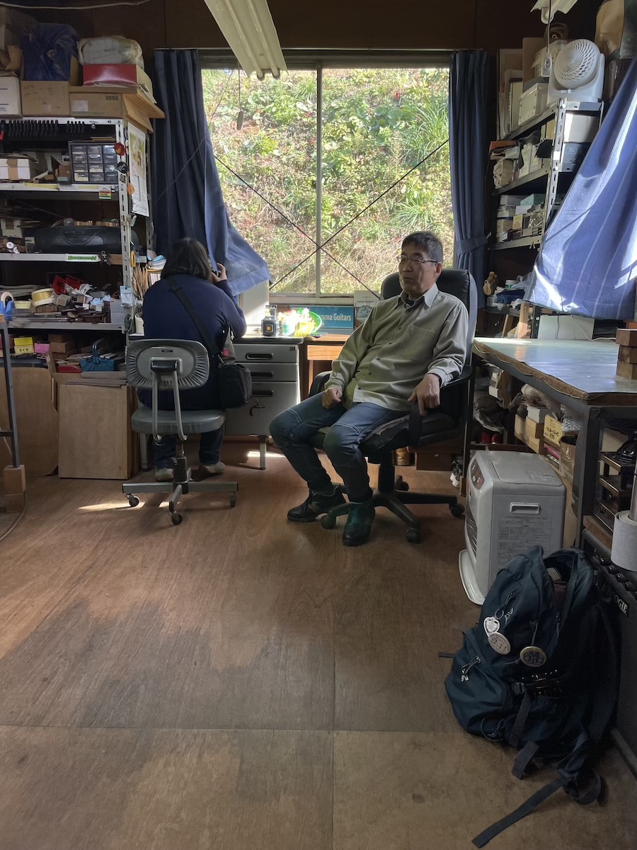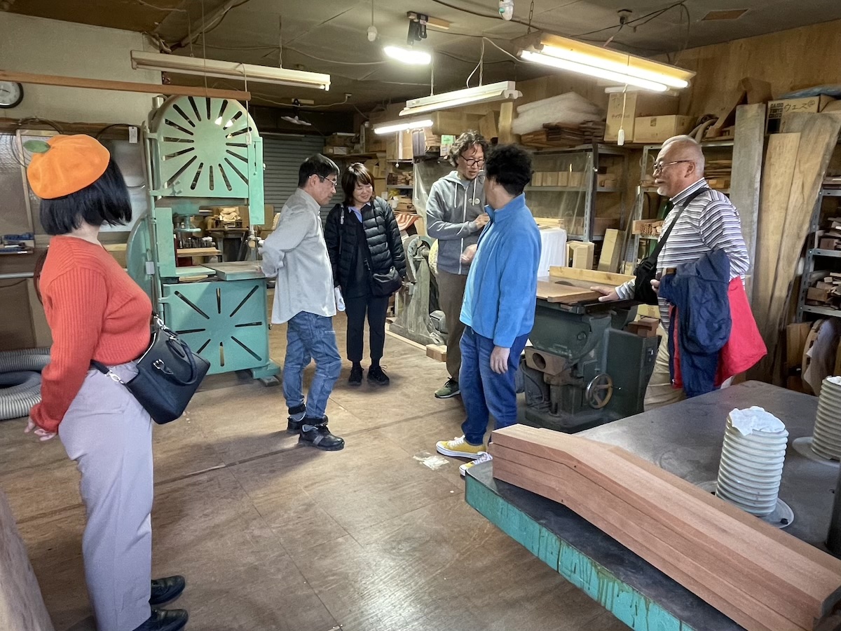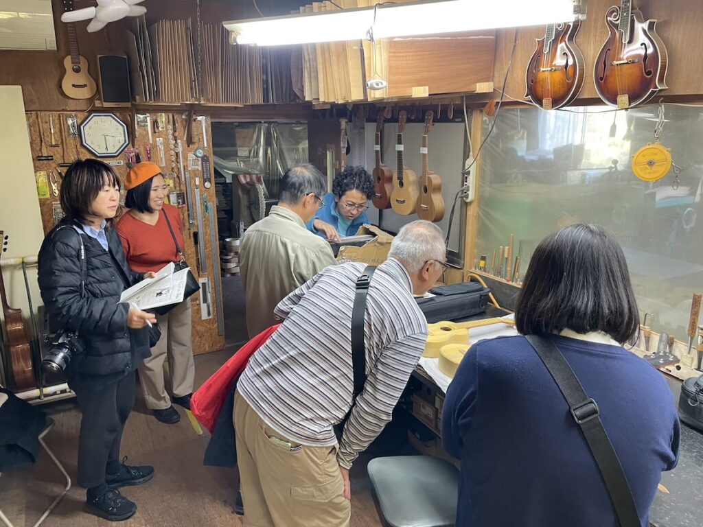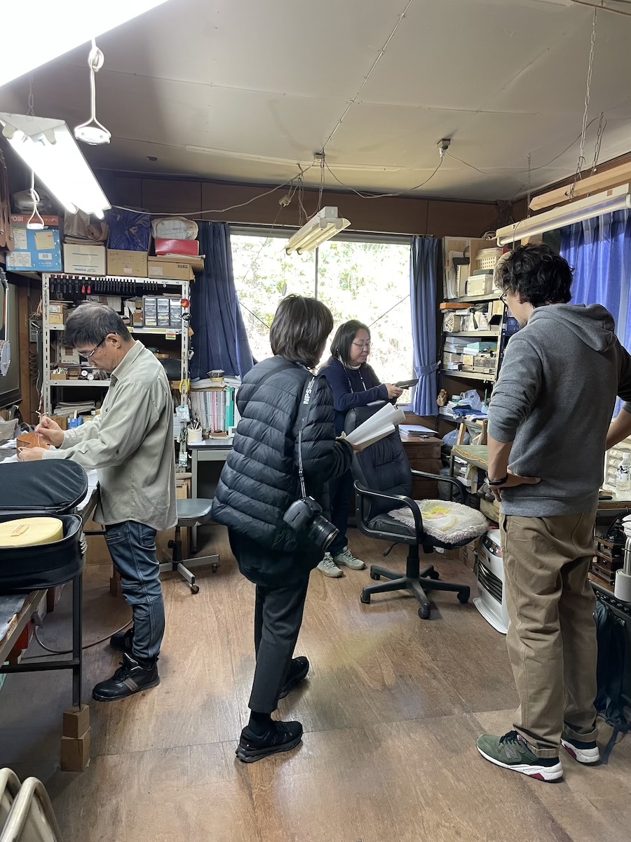 横山本人と広野組は、この日が初対面。挨拶を済ませると、早速製作中の「かや」ウクレレや、工房内部を見学してまわります。