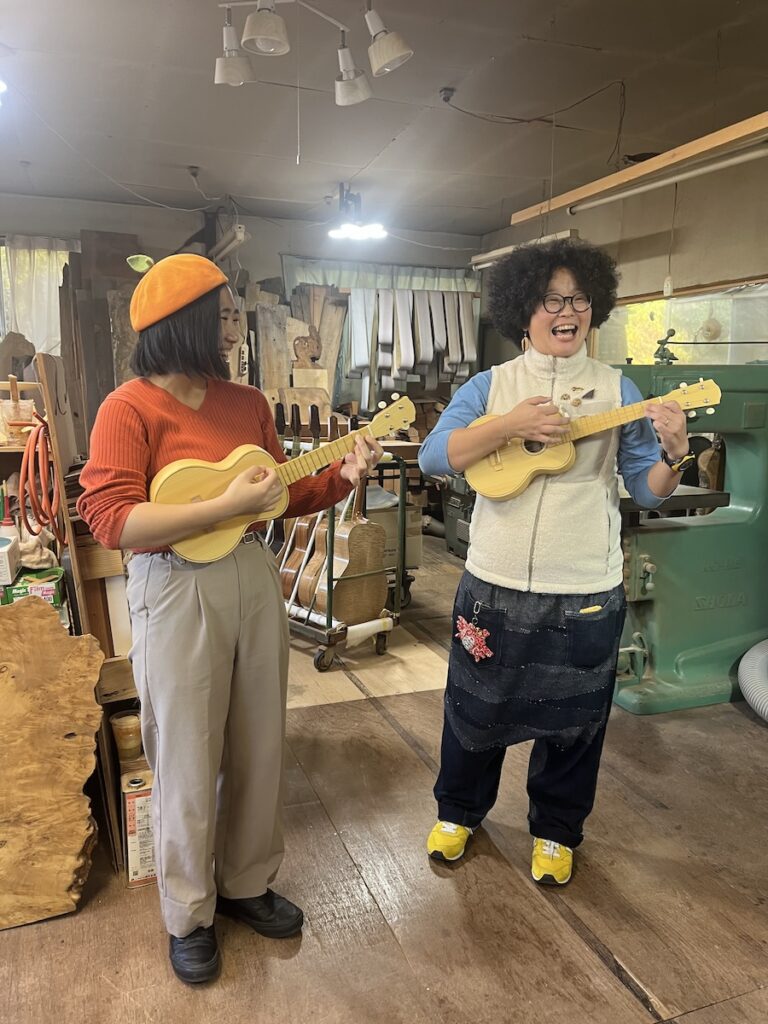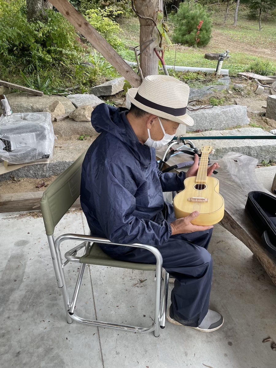 前回お見せしたウクレレとは別の個体も持参し、ご覧いただきました。早くロゴを入れた完成形をお持ちしたいですね。